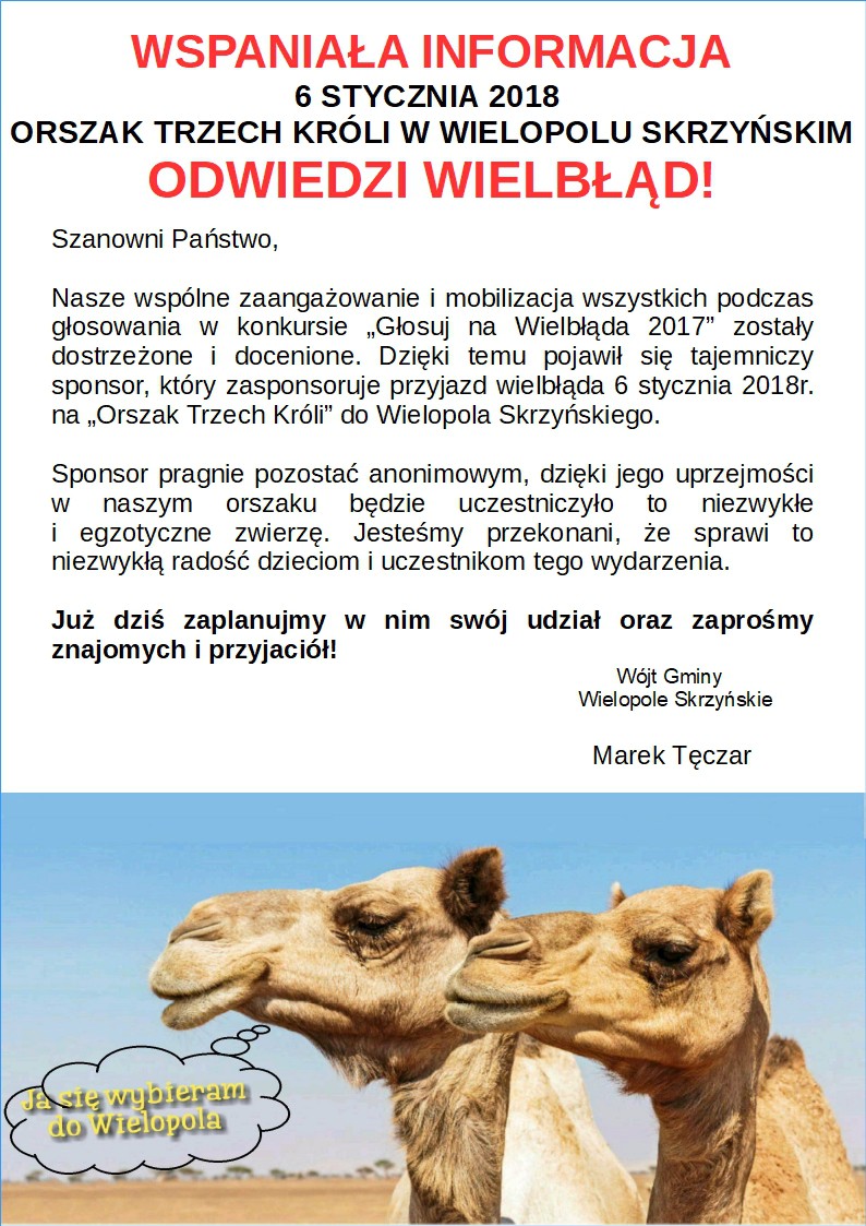 Poniedziałek 11 grudnia 2017 6 stycznia 2018 na "Orszak Trzech Króli" do Wielopola Skrzyńskiego przybędzie WIELBŁĄD! Strona Główna/Aktualności