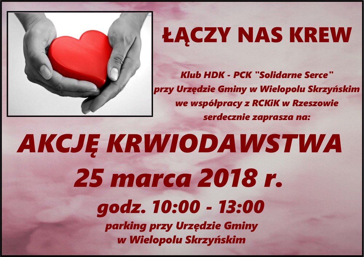 Klub HDK - PCK "Solidarne Serce" przy Urzędzie Gminy w Wielopolu Skrzyńskim we współpracy z RCKiK w Rzeszowie serdecznie zaprasza na akcję krwiodawstwa, która odbędzie się 25 marca 2018 r.