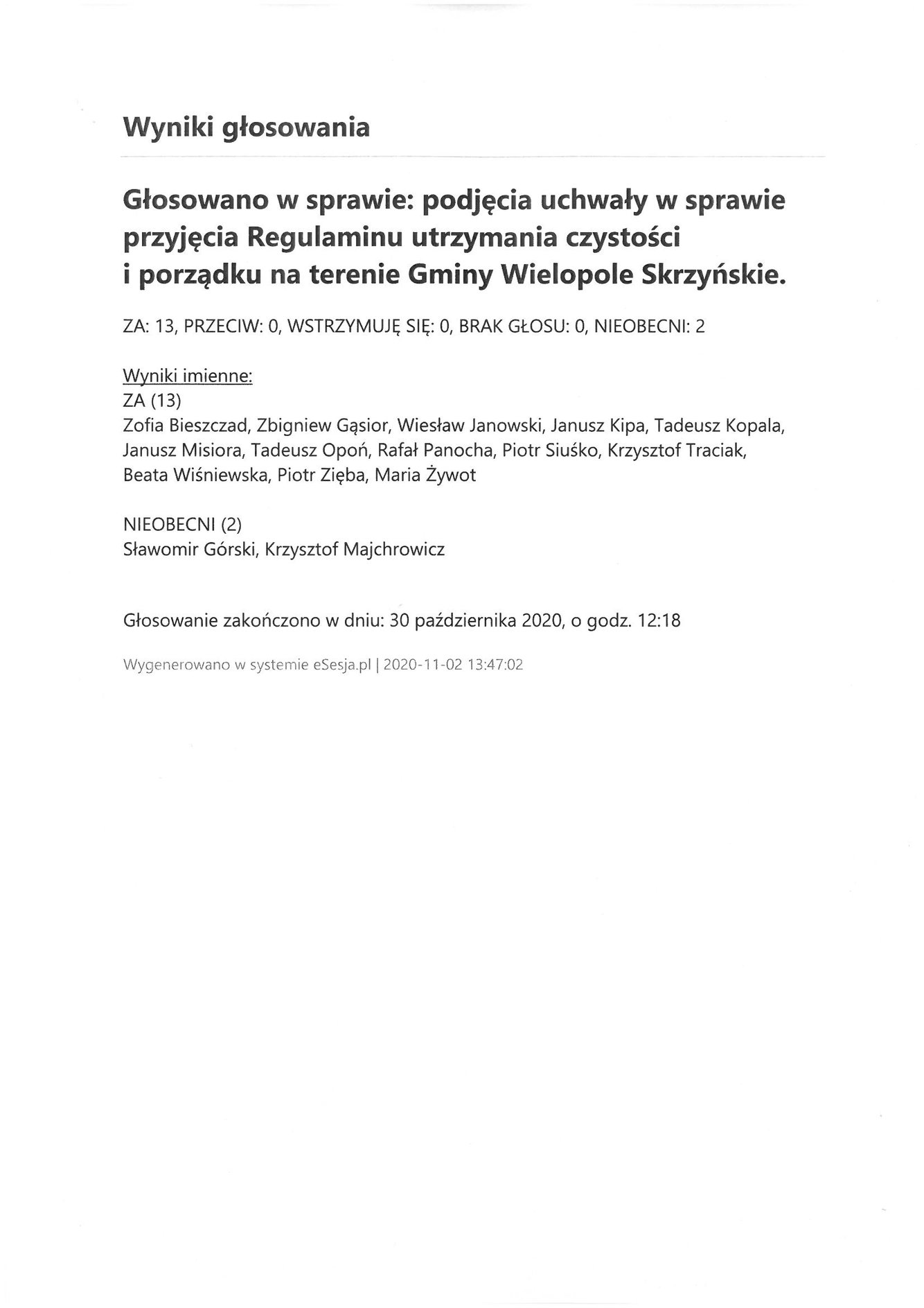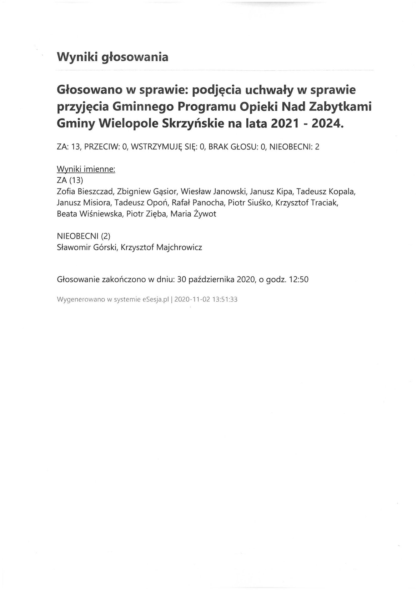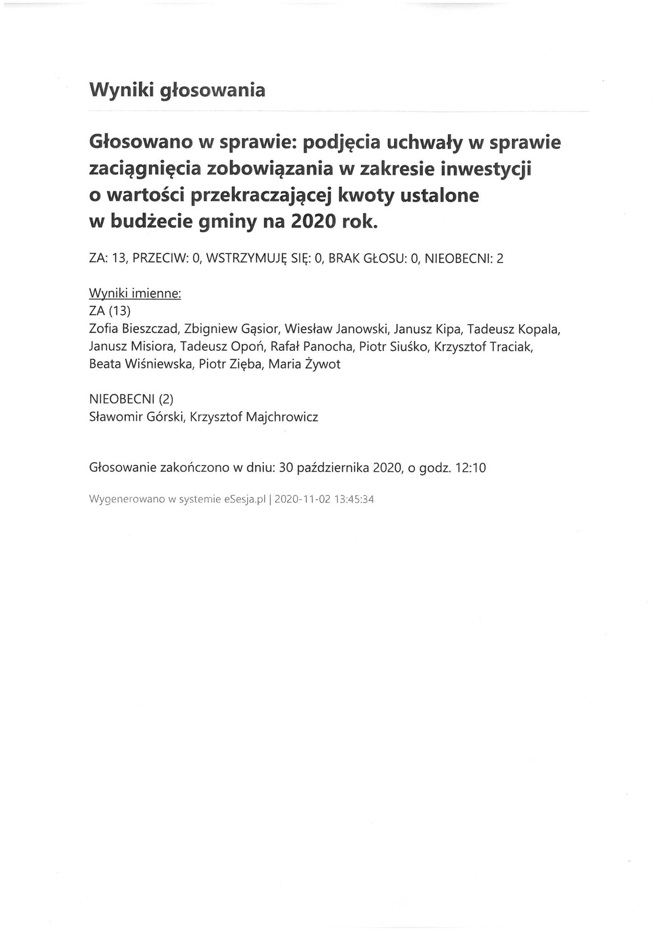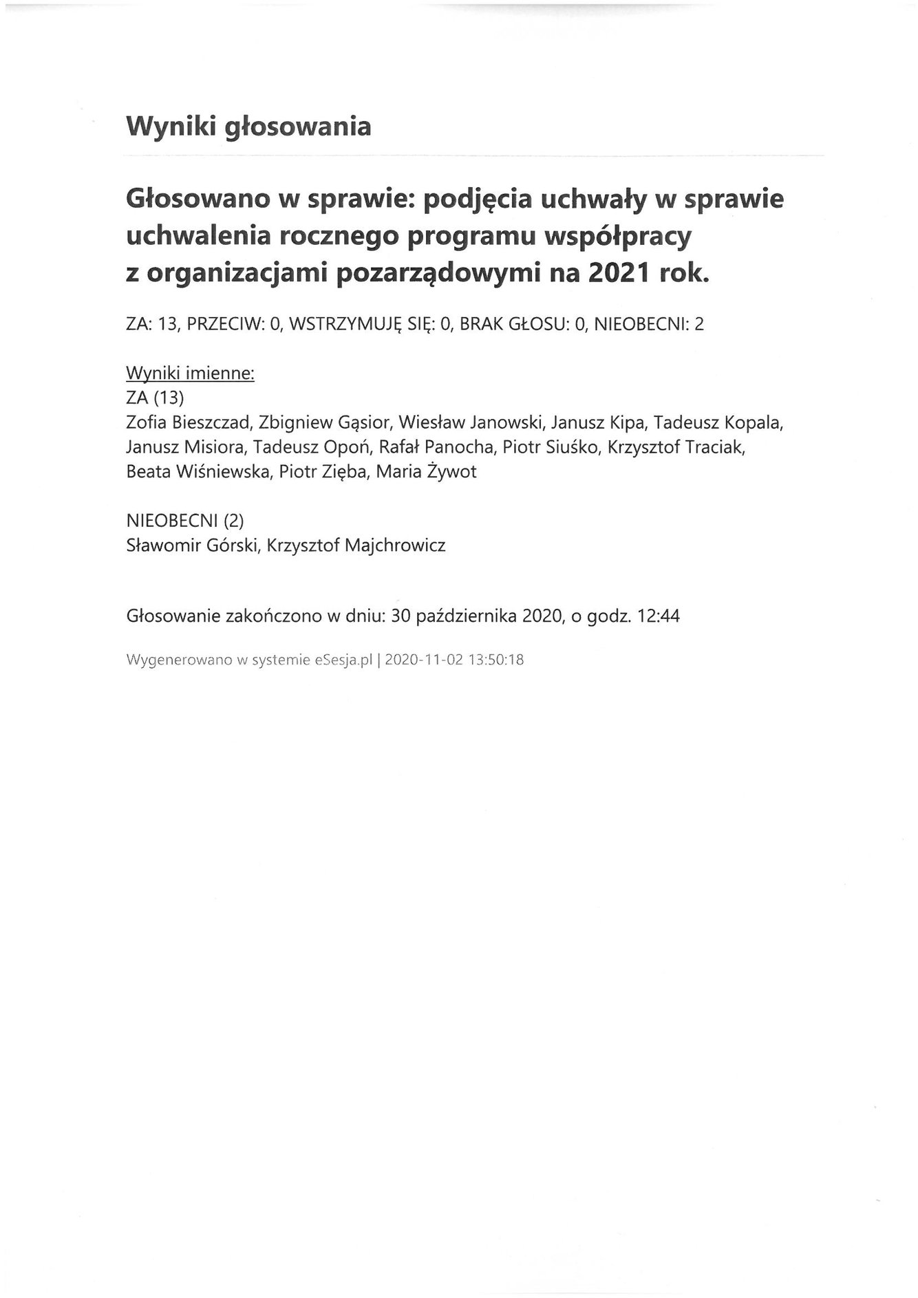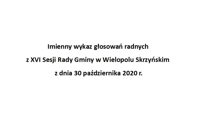 Poniedziałek 2 listopada 2020 Imienny wykaz głosowań radnych Strona Główna/AktualnościImienny wykaz głosowańImienny wykaz głosowań