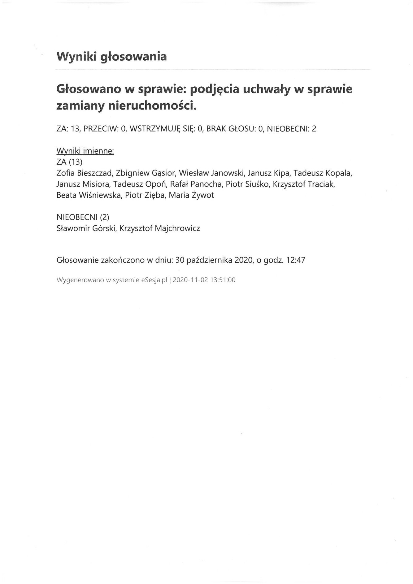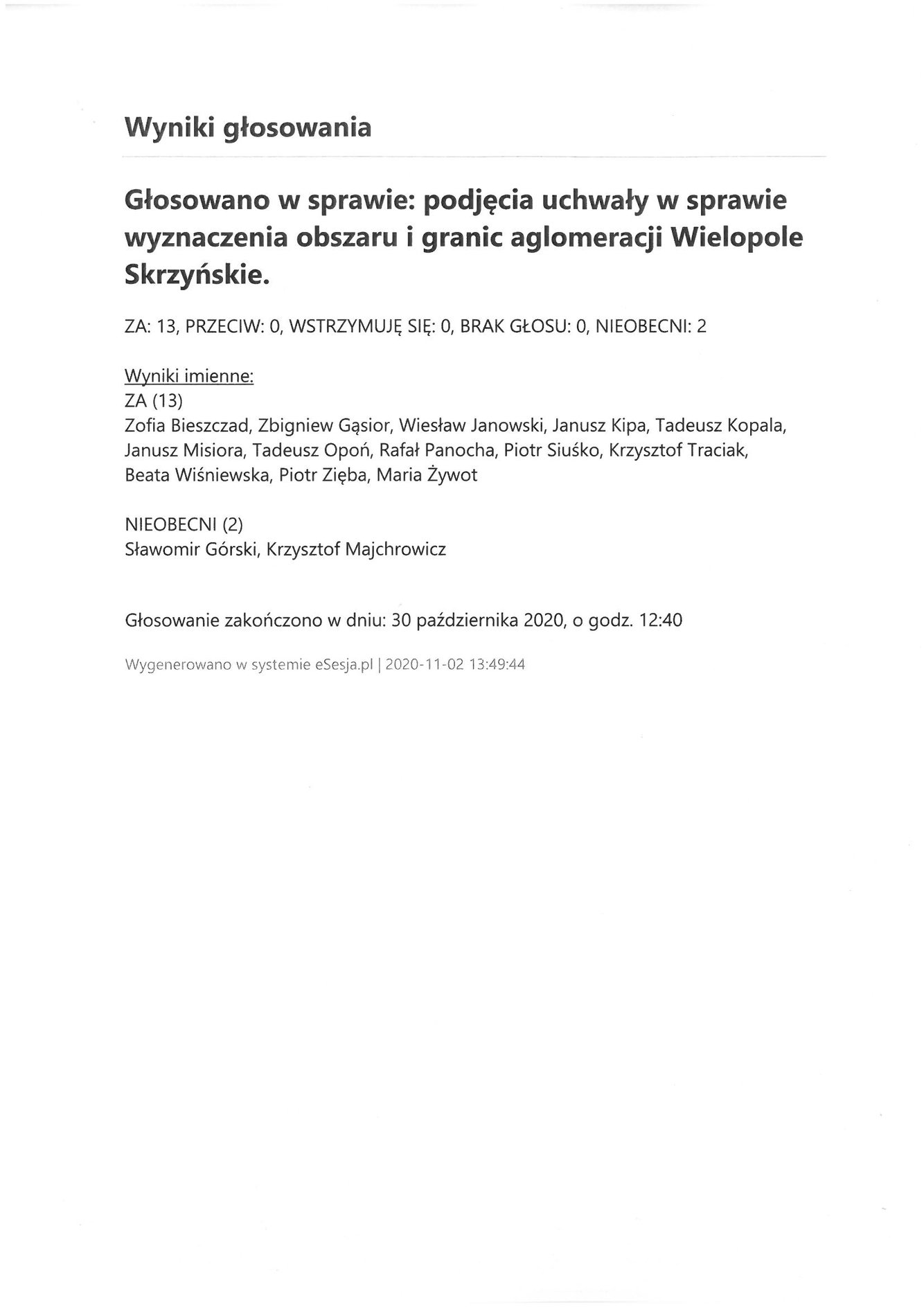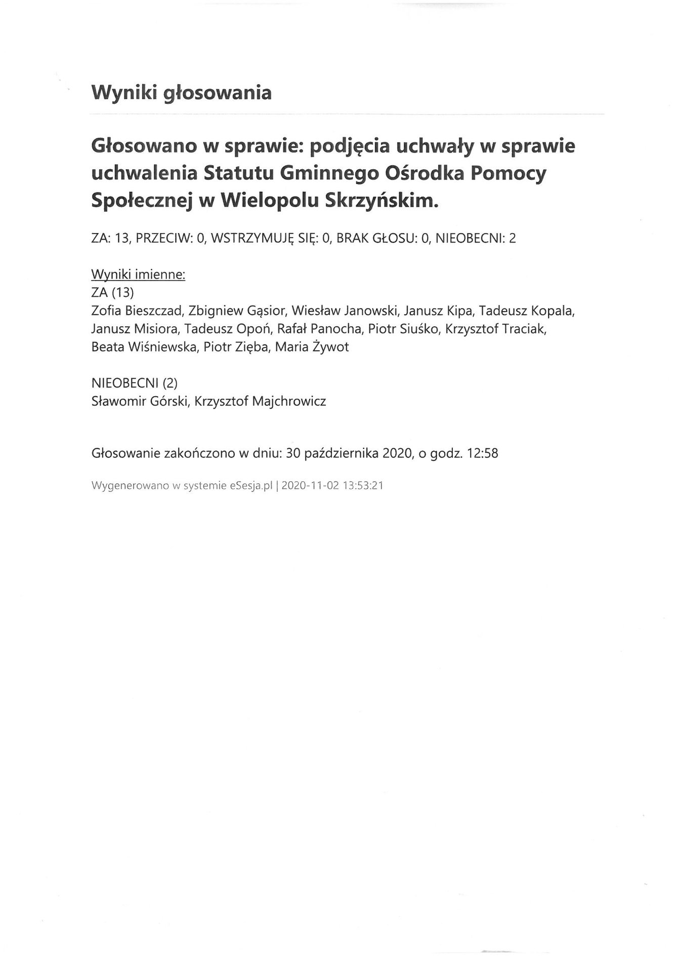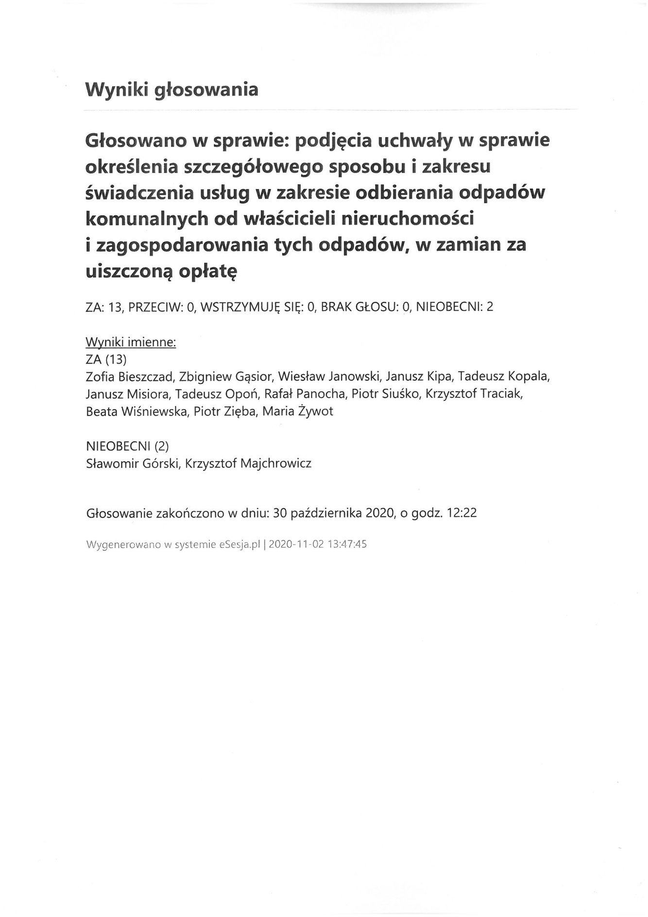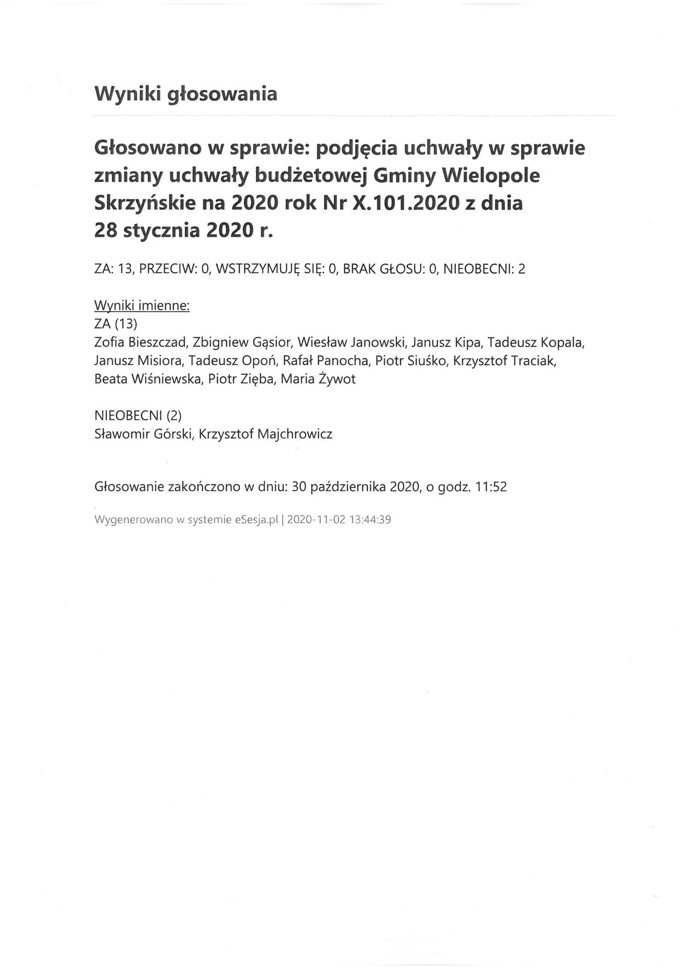 Poniedziałek 2 listopada 2020 Imienny wykaz głosowań radnych Strona Główna/AktualnościImienny wykaz głosowańImienny wykaz głosowań