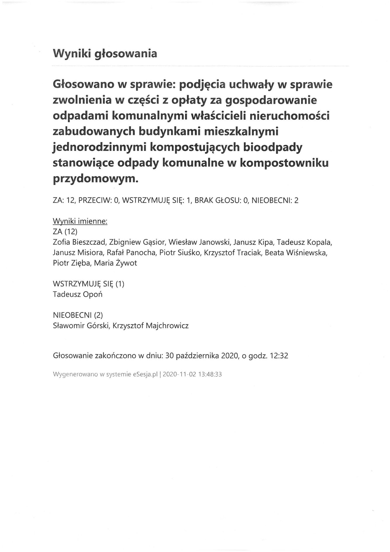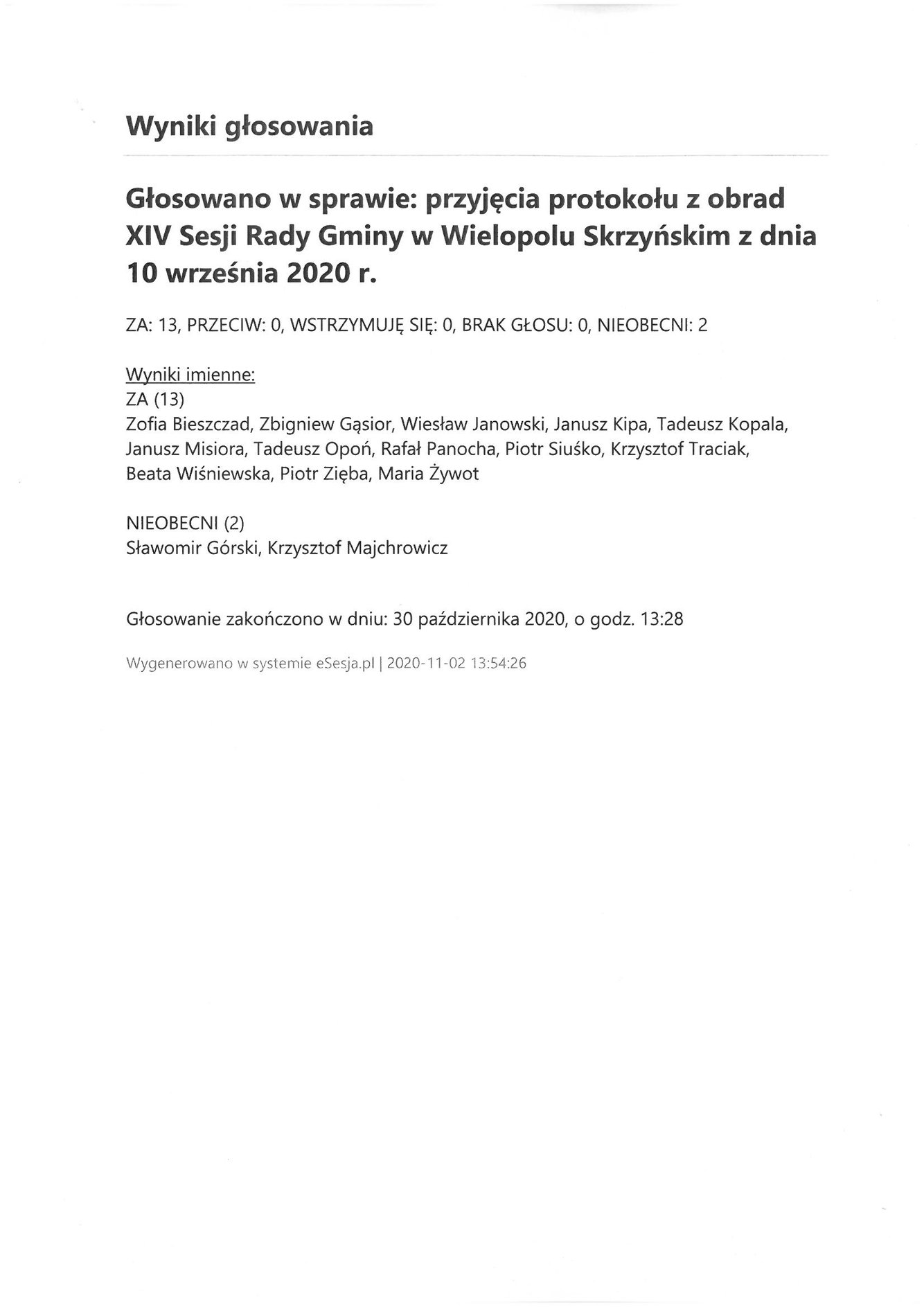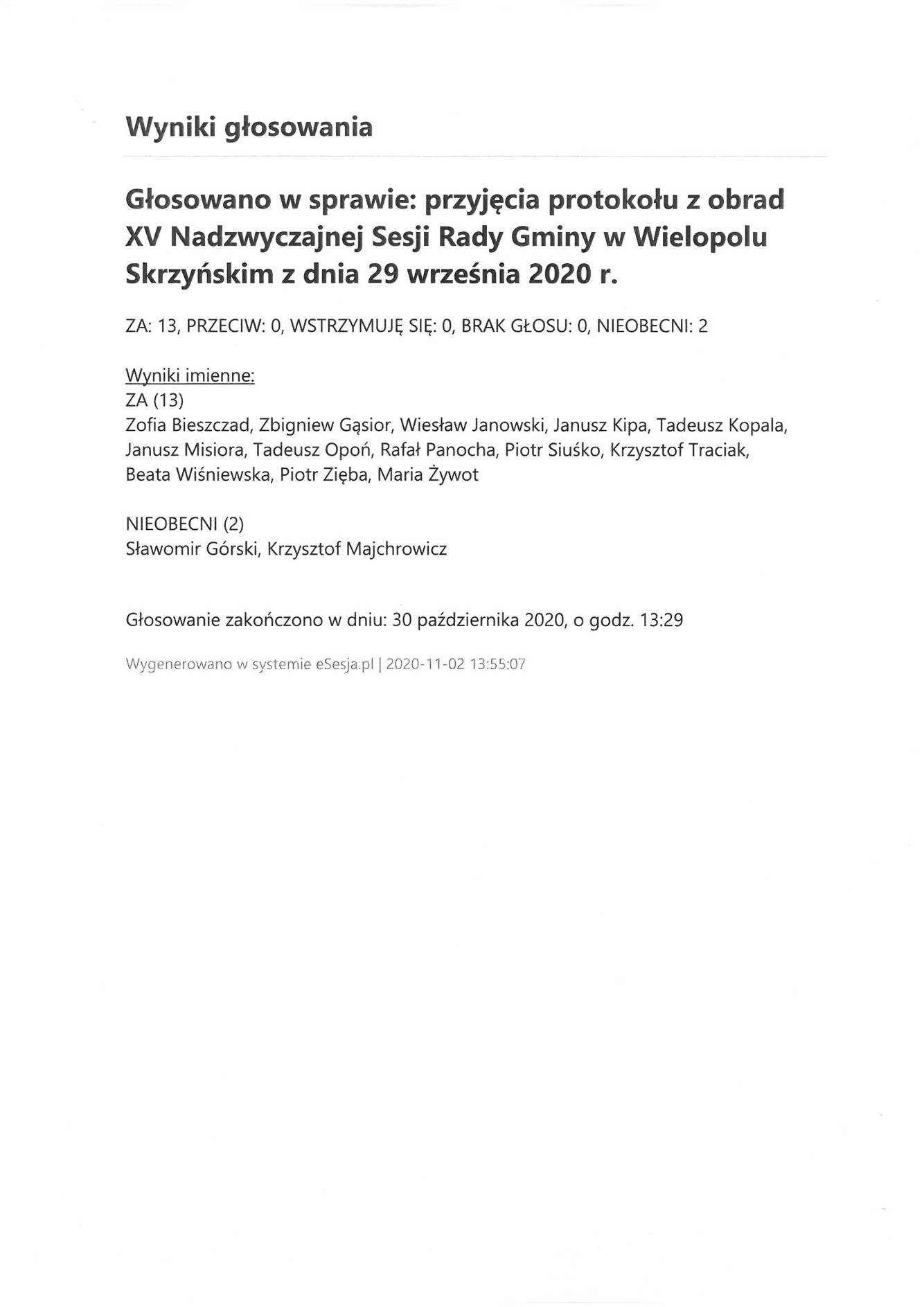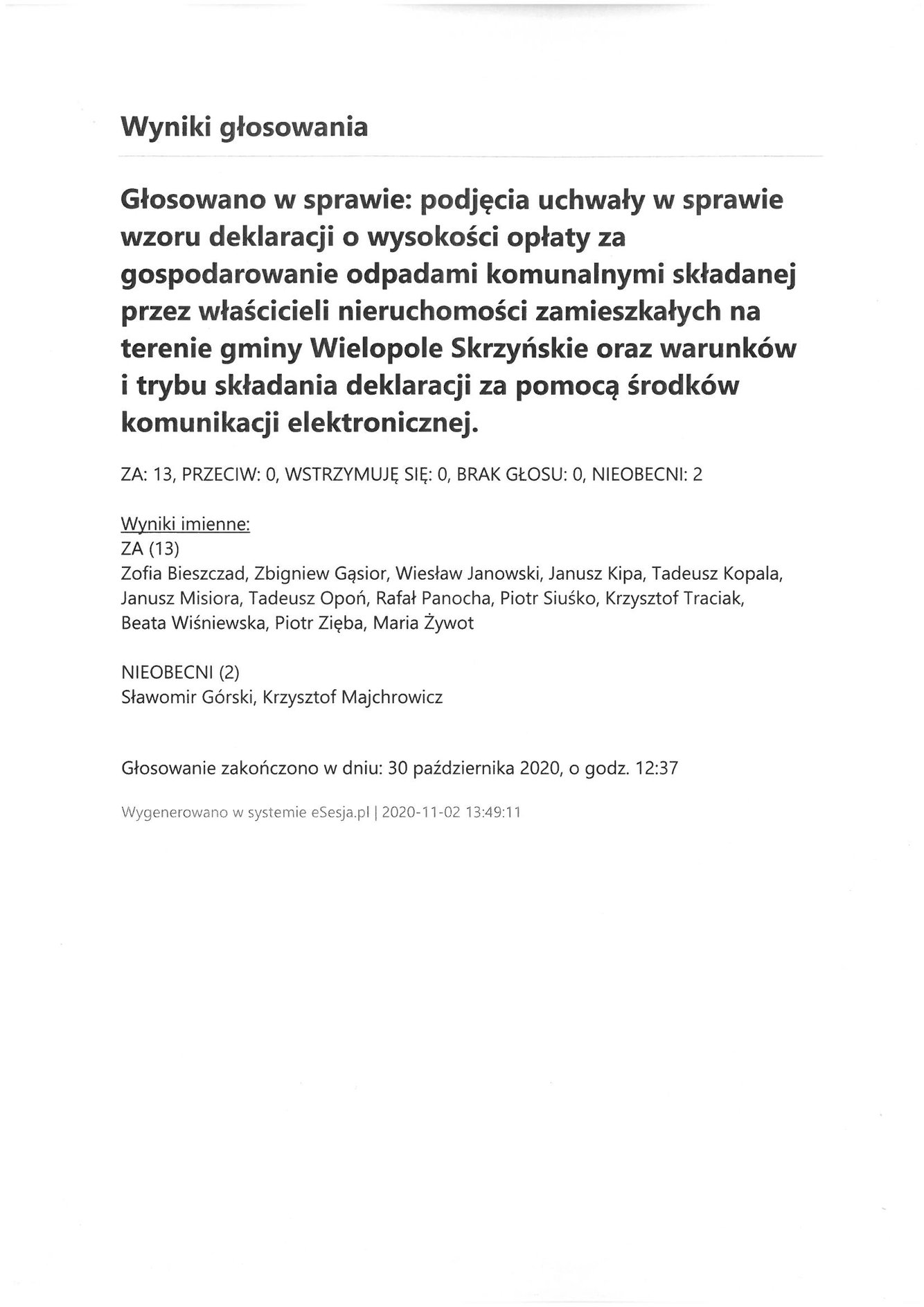 Poniedziałek 2 listopada 2020 Imienny wykaz głosowań radnych Strona Główna/AktualnościImienny wykaz głosowańImienny wykaz głosowań