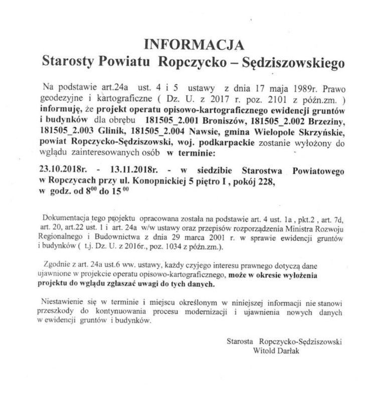 Piątek 26 października 2018 Informacja dla mieszkańców Gminy Wielopole Skrzyńskie dot. projektu operatu opisowo - kartograficznego ewidencji gruntów i budynków Strona Główna/Informator/Ogłoszenia