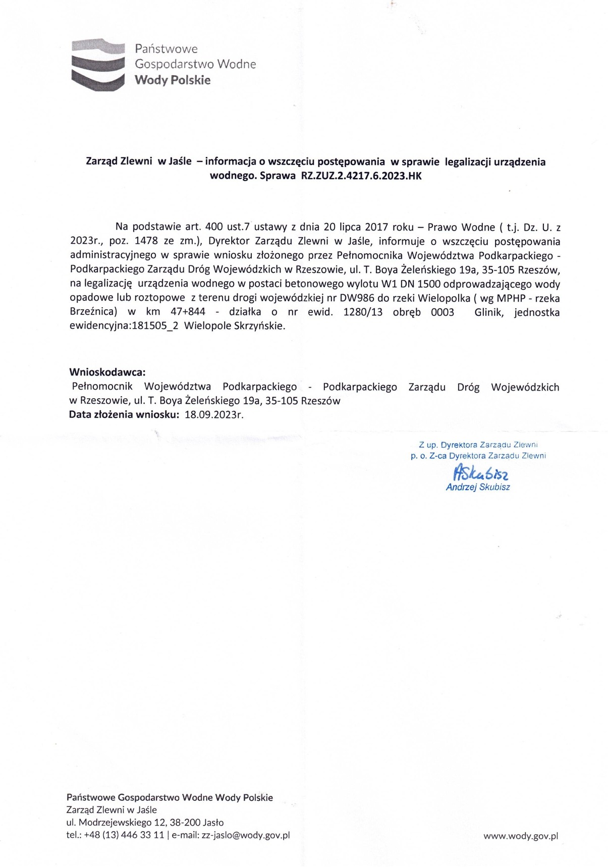 Wtorek 24 października 2023 Informacja o wszczęciu postępowania w sprawie legalizacji urządzenia wodnego Strona Główna/Informator/Ogłoszenia