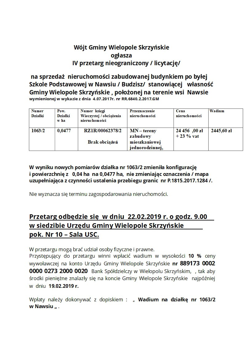 IV przetarg nieograniczony / licytacja/ na sprzedaż nieruchomości zabudowanej budynkiem po byłej Szkole Podstawowej w Nawsiu / Budzisz/