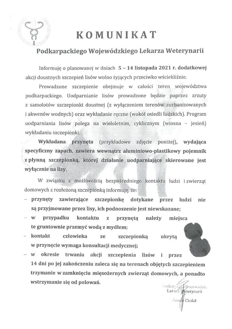 Podkarpacki Wojewódzki Lekarz Weterynarii informuje o planowanej w dniach 5 - 14 listopada 2021 r. dodatkowej akcji doustnych szczepień lisów wolno żyjących przeciwko wściekliźnie.