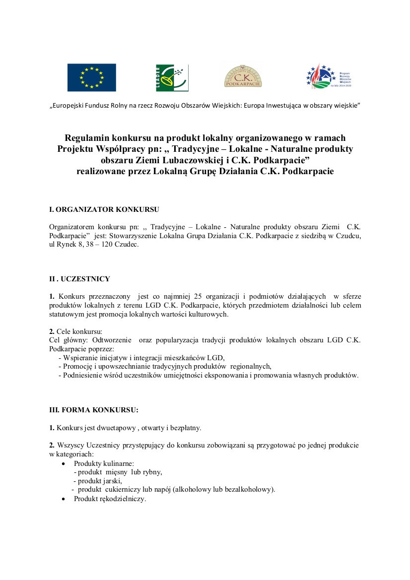 Konkurs zostanie przeprowadzony w ramach planowanej realizacji Projektu Współpracy pn: ,,Tradycyjne-Lokalne-Naturalne produkty obszaru Ziemi Lubaczowskiej i C.K Podkarpacie w ramach podziałania 19.3 Przygotowanie oraz realizacja działań w zakresie projektu współpracy z lokalną grupą działania - Program Rozwoju Obszarów Wiejskich na lata 2014-2020.