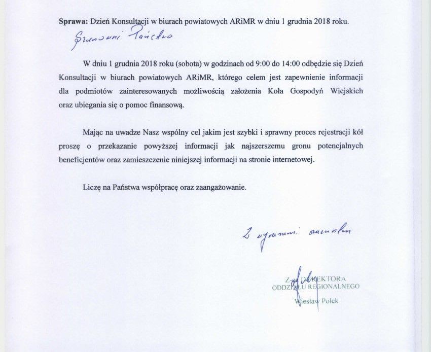 W najbliższą sobotę 1 grudnia 2018 roku w godz. 9 - 14 we wszystkich Biurach Powiatowych ARiMR odbędą się konsultacje dla Kół Gospodyń Wiejskich.
