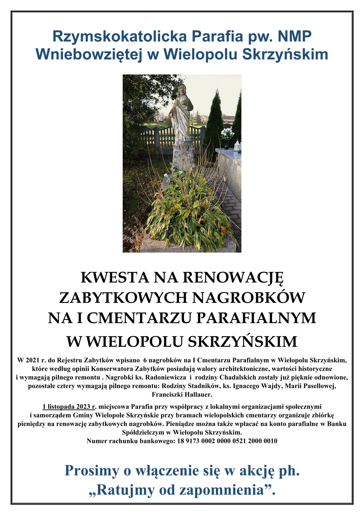 Piątek 20 października 2023 KWESTA NA RENOWACJĘ ZABYTKOWYCH NAGROBKÓW NA I CMENTARZU PARAFIALNYM W WIELOPOLU SKRZYŃSKIM Strona Główna/Informator/Ogłoszenia