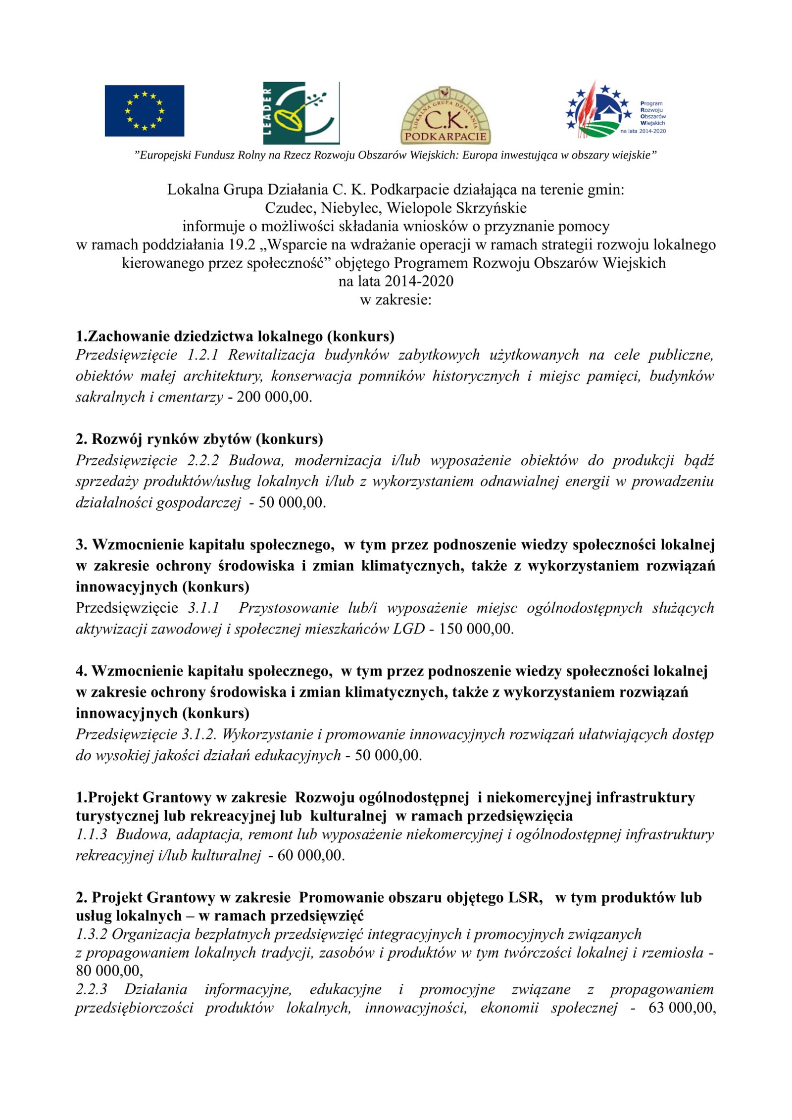 Lokalna Grupa Działania C. K. Podkarpacie informuje o możliwości składania wniosków o przyznanie pomocy.