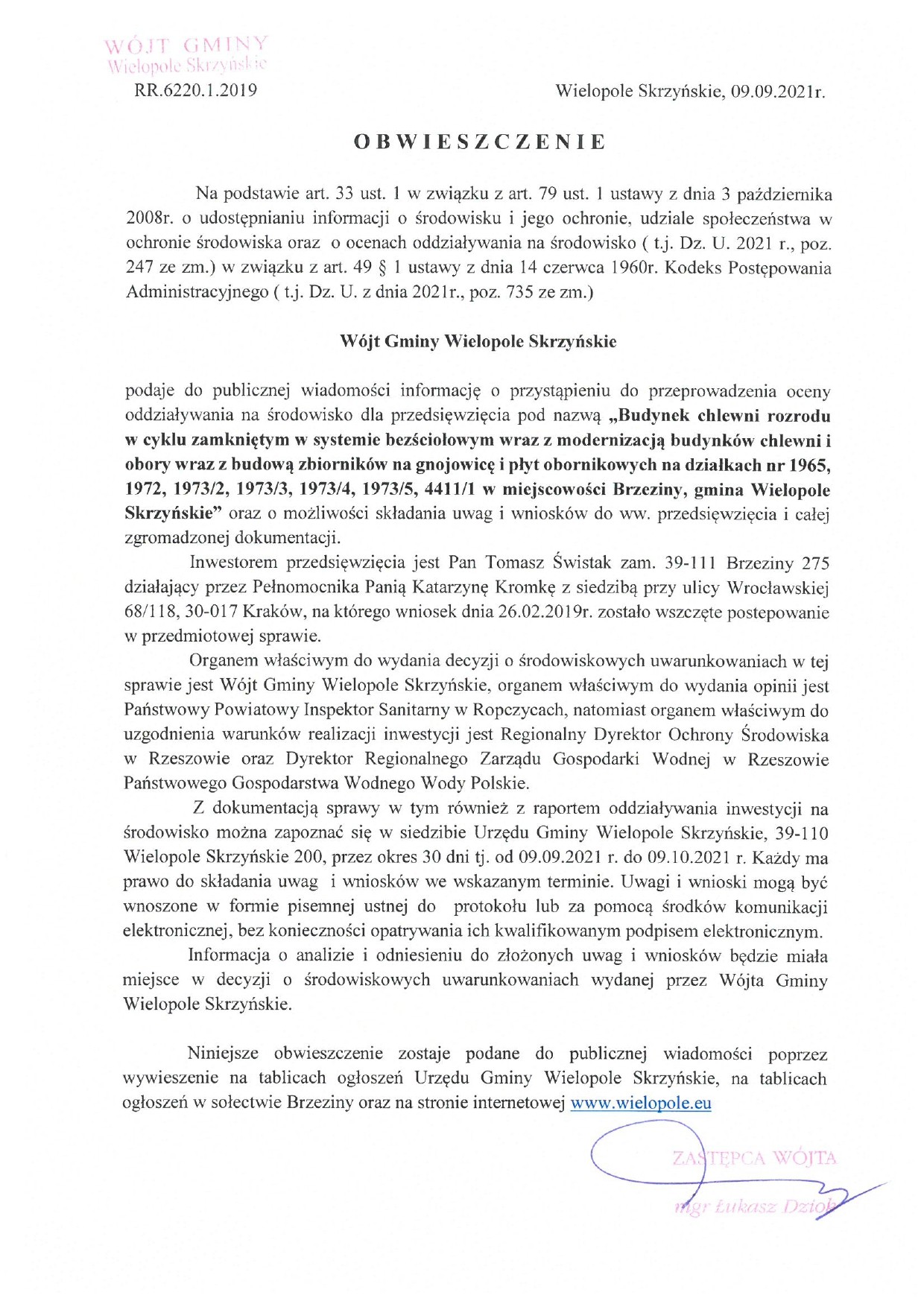 Czwartek 9 września 2021 Obwieszczenie Wójta Gminy Wielopole Skrzyńskie o przeprowadzeniu oceny oddziaływania na środowisko dla przedsięwzięcia Strona Główna/Informator/Ogłoszenia