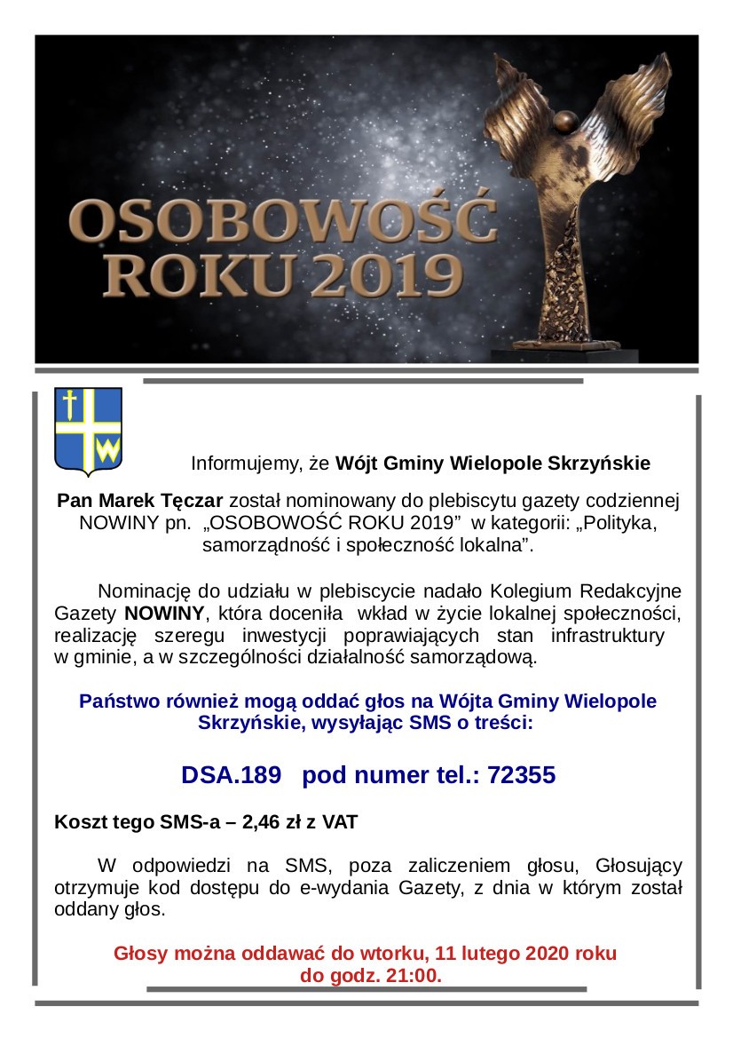 Informujemy, że Wójt Gminy Wielopole Skrzyńskie Pan Marek Tęczar został nominowany do plebiscytu gazety codziennej NOWINY pn. „OSOBOWOŚĆ ROKU 2019” w kategorii: „Polityka, samorządność i społeczność lokalna”.