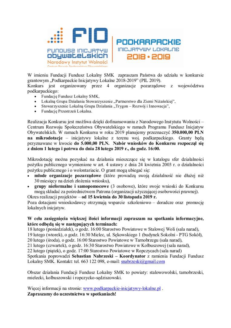 Fundacja Fundusz Lokalny SMK zaprasza do udziału w konkursie dotacyjnym skierowanym do organizacji pozarządowych oraz grup nieformalnych „Podkarpackie Inicjatywy Lokalne 2018-2019” (PIL 2019).