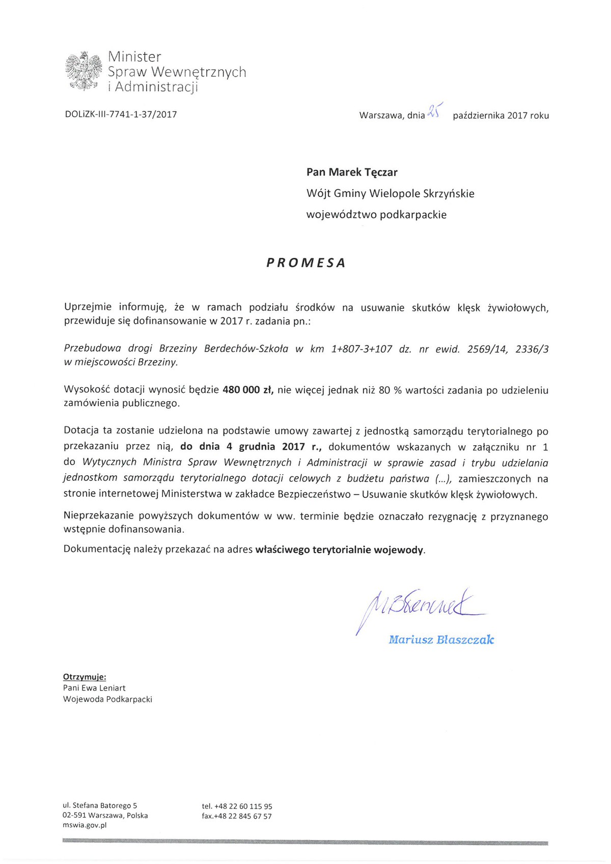 Szanowni Państwo z wielką radością informuję, że w dniu 09.11.2017 otrzymałem z rąk Pani Ewy Leniart Wojewody Podkarpackiego promesę na dofinansowanie przebudowy drogi Brzeziny - Berdechów - Szkoła.