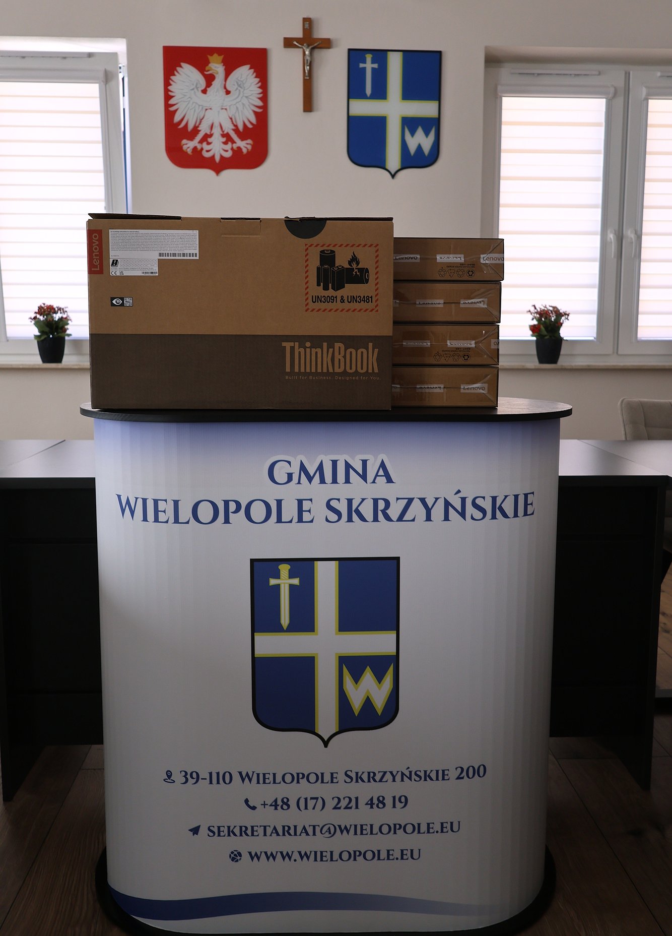 Laptopy pozyskano na podstawie umowy zawartej przez Gminę Wielopole Skrzyńskie z Województwem Podkarpackim - Podkarpackim Zespołem Placówek Wojewódzkich w Rzeszowie, w związku z realizacją przedsięwzięcia pn. „Zdrowo - cyfrowo w przedszkolu” w ramach programu Krajowego Planu Odbudowy i Zwiększania Odporności (KPO).