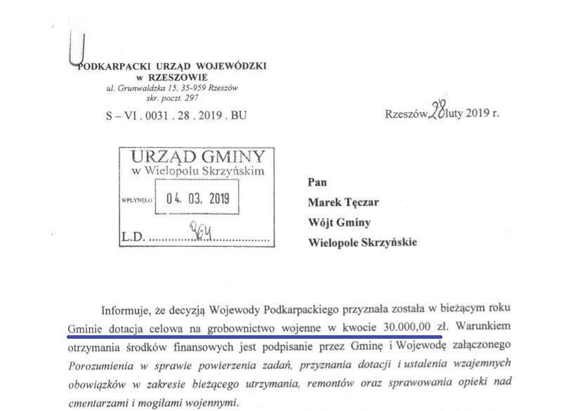 decyzją Wojewody Podkarpackiego przyznana została naszej gminie dotacja celowa w wysokości 30 000,00 zł na realizację rozpoczętych w ubiegłym roku prac związanych z remontem kwatery z I wojny światowej znajdującej się na cmentarzu w Wielopolu Skrzyńskim.