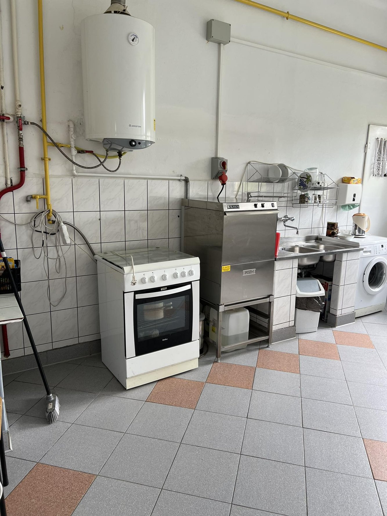 szafka na przybory kuchenne, szafka wisząca- drzwi suwane ,szafa BHP 1-drzwiowa, stół ze zlewem dwukomorowym z półką , bateria do zlewu z wyciągniętym prysznicem, kuchnia gazowa 4 palniki z piekarnikiem, lodówko-zamrażarka, kosz do zmywarki, warniki do wody dwuściankowe 9 l., termosy stołowe z pompką 4l, zestawy noży (6 sztuk), chochla, deski do krojenia zestaw (6 sztuk), patelnie z powłoką nieprzywierającą, miska 2l., tace, pojemniki na sztućce 4 częściowe, łyżki perforowane, widelce do serwowania, łopatki do serwowania, łyżki do serwowania, obieraki do warzyw, szczypce uniwersalne silikonowe, łyżki drewniane, trzepaczki rózgowe, sita z rączką, waga kuchenna do 10 kg, gofrownica 1300W, ociekacz na sztućce.