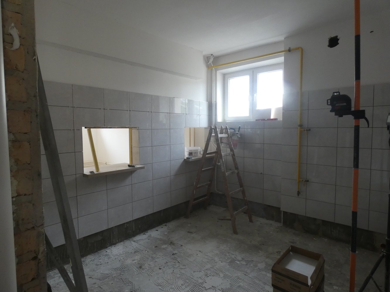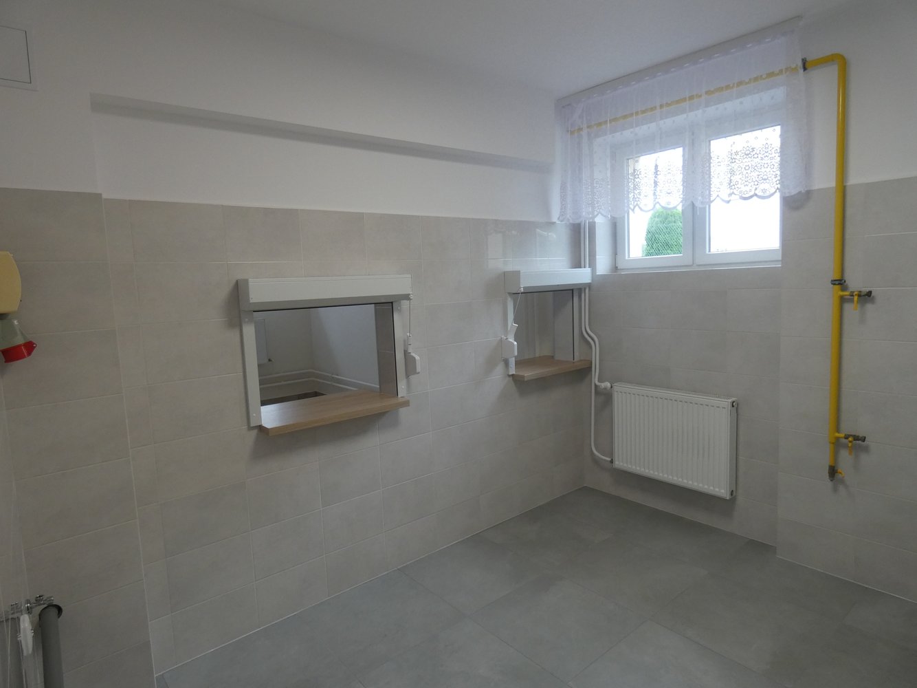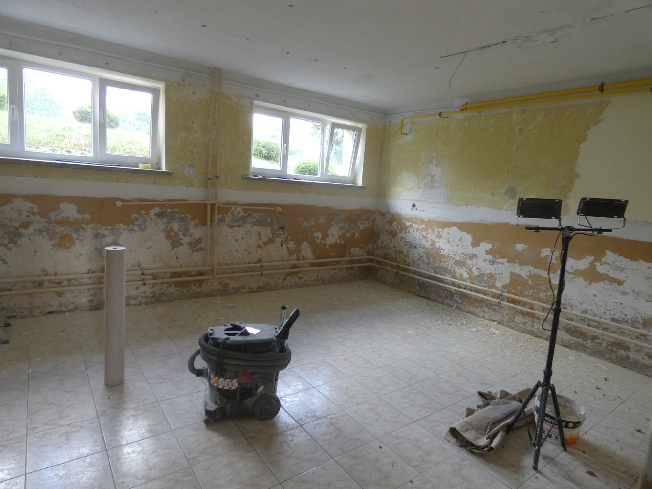 W ramach prac remontowych wykonano: usunięcie lamperii z płytek i uzupełnienie ubytków tynkowych, ułożenie płytek ściennych z materiałem, usuwanie starych farb, gruntowanie, szpachlowanie, malowanie ścian i sufitów, wymianę okien wewnętrznych na rolety, wymianę oświetlenia, usunięcie lamperii i uzupełnienie ubytków. Prace wykonała firma Kompleksowe Usługi Budowlane MAX-DOM Marcin Szkotnicki z Nawsia.