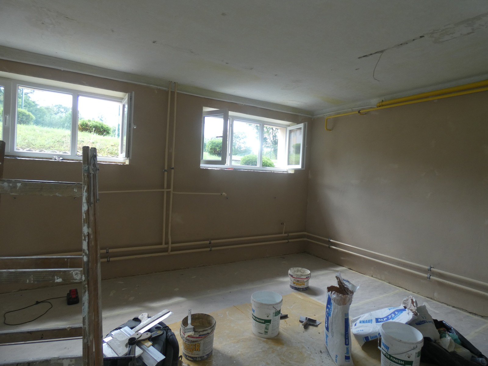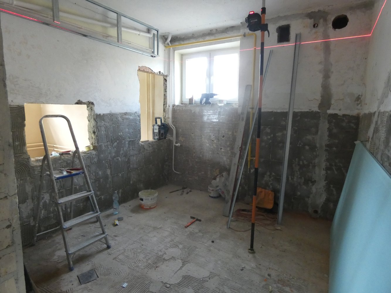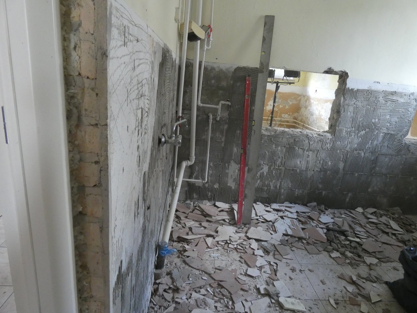 W ramach prac remontowych wykonano: usunięcie lamperii z płytek i uzupełnienie ubytków tynkowych, ułożenie płytek ściennych z materiałem, usuwanie starych farb, gruntowanie, szpachlowanie, malowanie ścian i sufitów, wymianę okien wewnętrznych na rolety, wymianę oświetlenia, usunięcie lamperii i uzupełnienie ubytków. Prace wykonała firma Kompleksowe Usługi Budowlane MAX-DOM Marcin Szkotnicki z Nawsia.