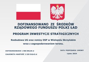 11.07.2024 roku zostały podpisane umowy na realizację zadania pn: Rozbudowa UG oraz remizy OSP w Wielopolu Skrzyńskim wraz z zagospodarowaniem terenu.