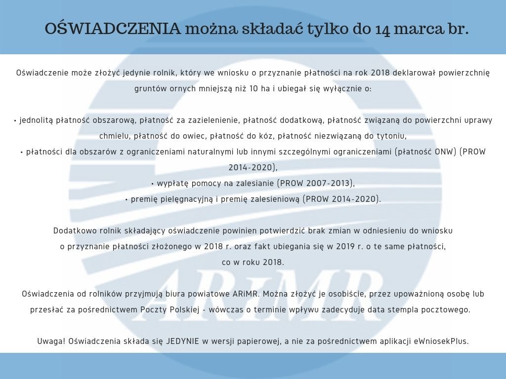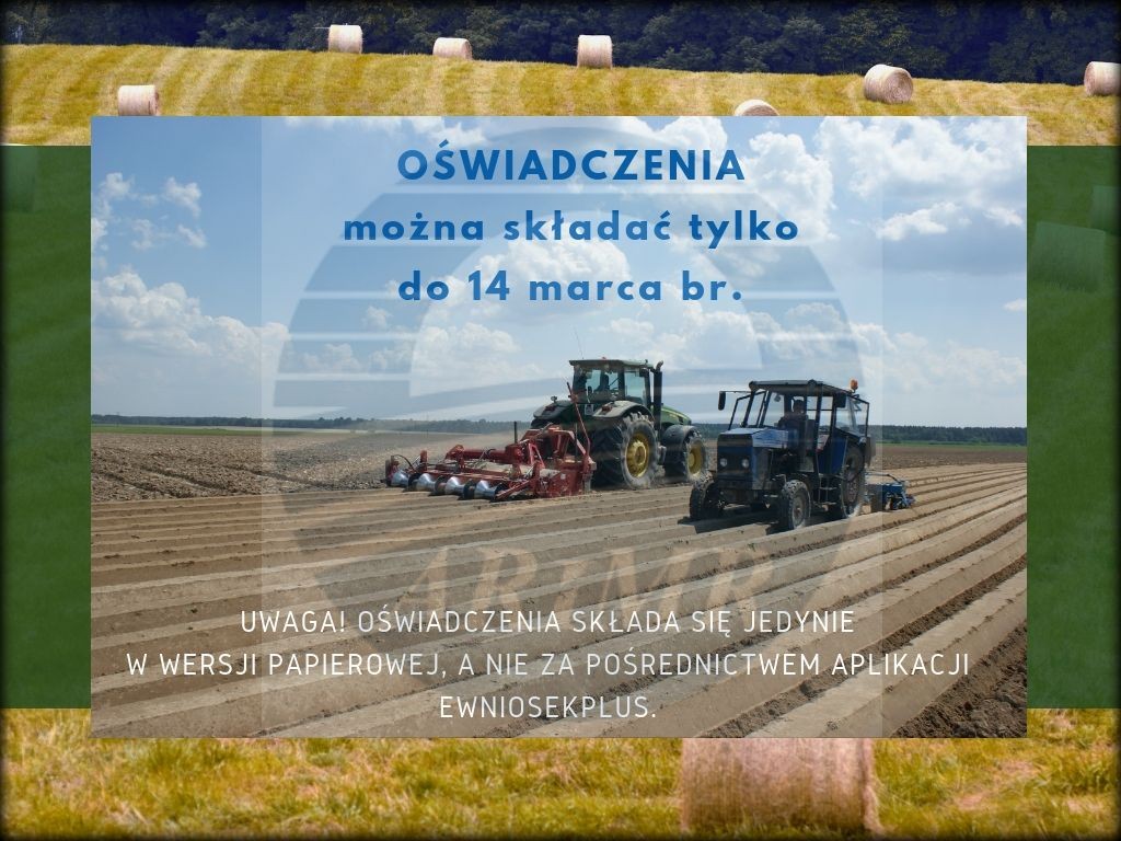 Oświadczenia od rolników przyjmują biura powiatowe ARiMR. Można złożyć je osobiście, przez upoważnioną osobę lub przesłać za pośrednictwem Poczty Polskiej - wówczas o terminie wpływu zdecyduje data stempla pocztowego.