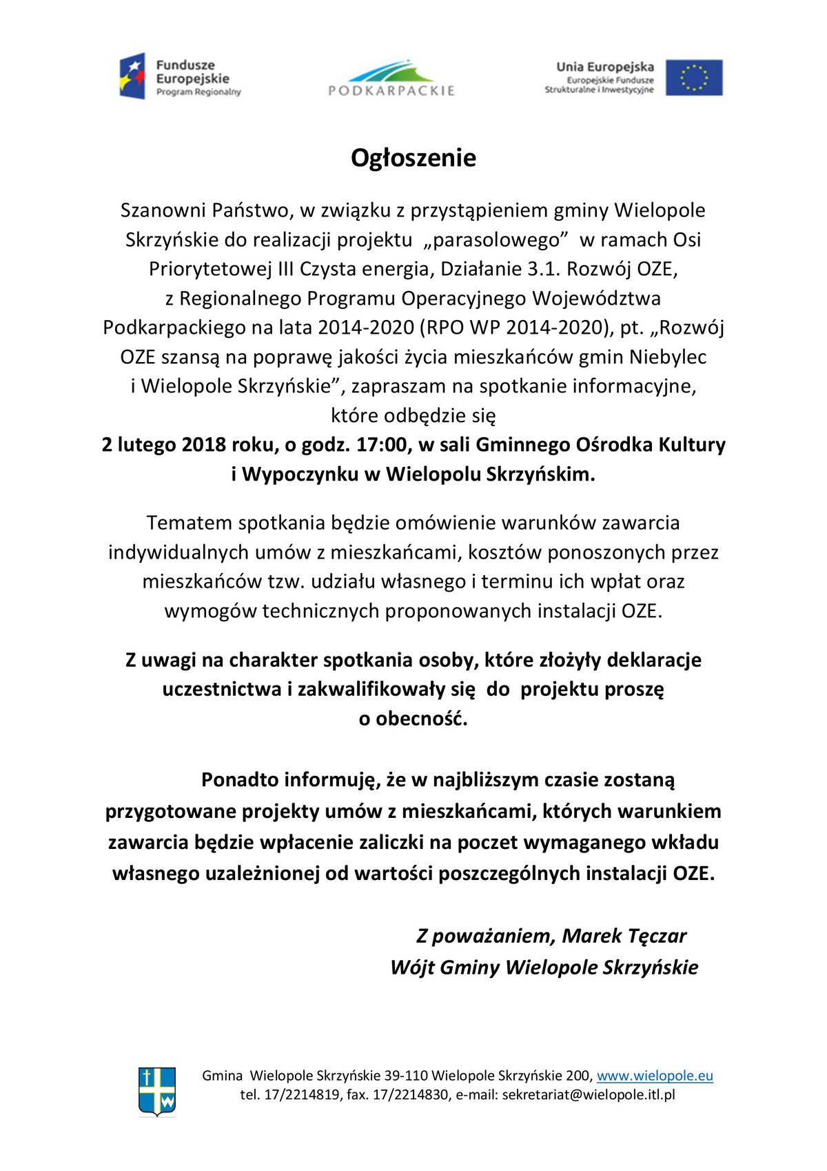 Serdecznie zapraszamy na spotkanie informacyjne w związku z przystąpieniem gminy Wielopole Skrzyńskie do realizacji projektu „parasolowego” w ramach Osi Priorytetowej III Czysta energia, Działanie 3.1. Rozwój OZE, z Regionalnego Programu Operacyjnego Województwa Podkarpackiego na lata 2014-2020 (RPO WP 2014-2020), pt. „Rozwój OZE szansą na poprawę jakości życia mieszkańców gmin Niebylec i Wielopole Skrzyńskie”