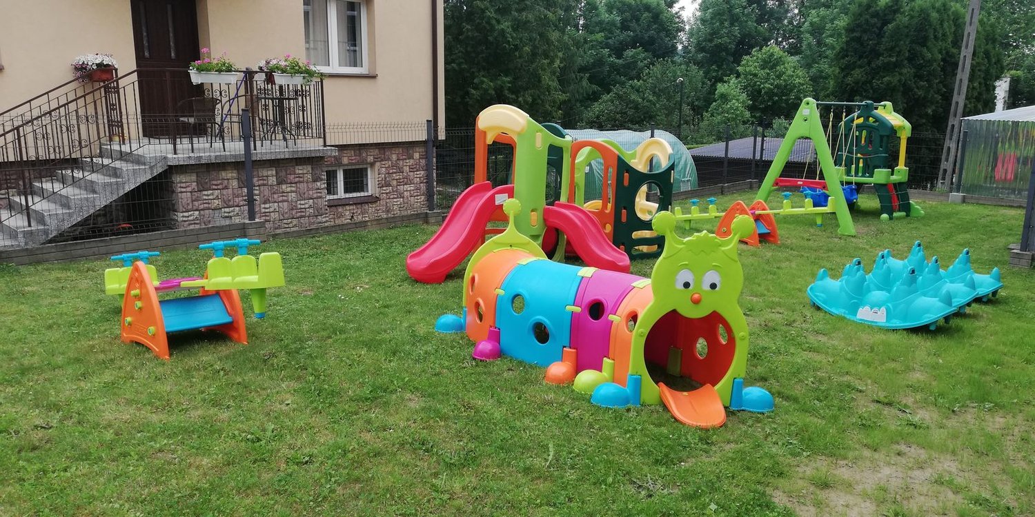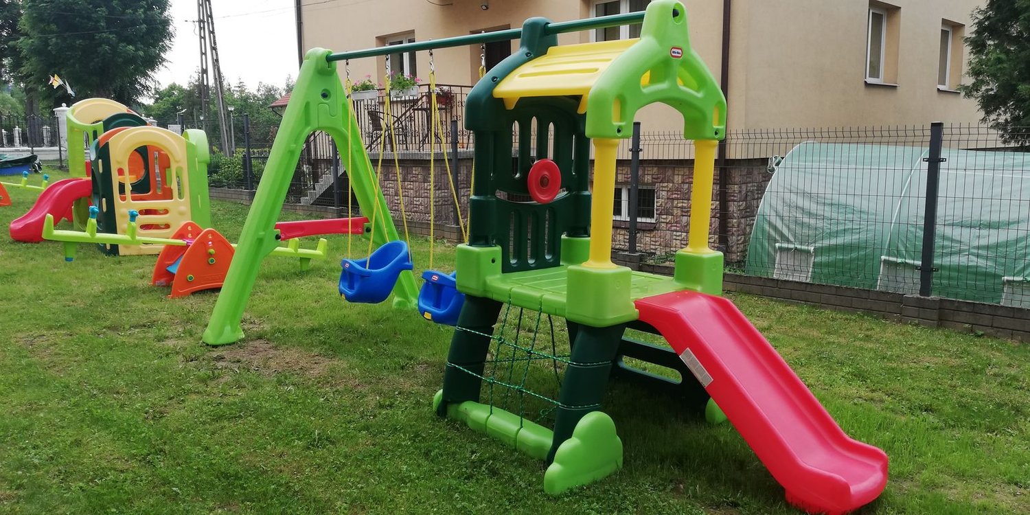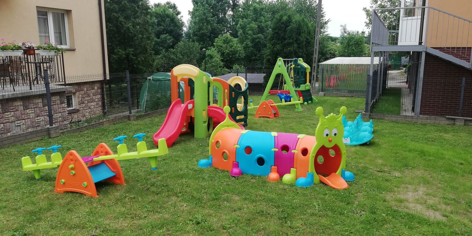 Teren za budynkiem został uporządkowany, zasiano trawnik i ustawiono zabawki ogrodowe, powstało miejsce zabaw dostosowane do potrzeb maluchów, które pod czujnym okiem Opiekunek mogą aktywnie spędzać czas na świeżym powietrzu.