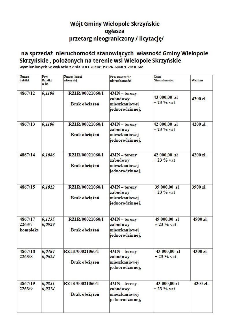 Wtorek 4 września 2018 Wójt Gminy Wielopole Skrzyńskie ogłasza przetarg nieograniczony / licytację/ na sprzedaż nieruchomości stanowiących własność Gminy Wielopole Skrzyńskie Strona Główna/Informator/OgłoszeniaDokumenty do pobraniaDokumenty do pobrania#Nazwa DokumentuPRZETARG NIEOGRANICZONY / LICYTACJĘ/ NA SPRZEDAŻ NIERUCHOMOŚCI STANOWIĄCYCH WŁASNOŚĆ GMINY WIELOPOLE SKRZYŃSKIE , POŁOŻONYCH NA TERENIE WSI WIELOPOLE SKRZYŃSKIE WYMIENIONYCH W WYKAZIE Z DNIA 9.03.2018R. NR RR.6840.1.2018.GM POBIERZ