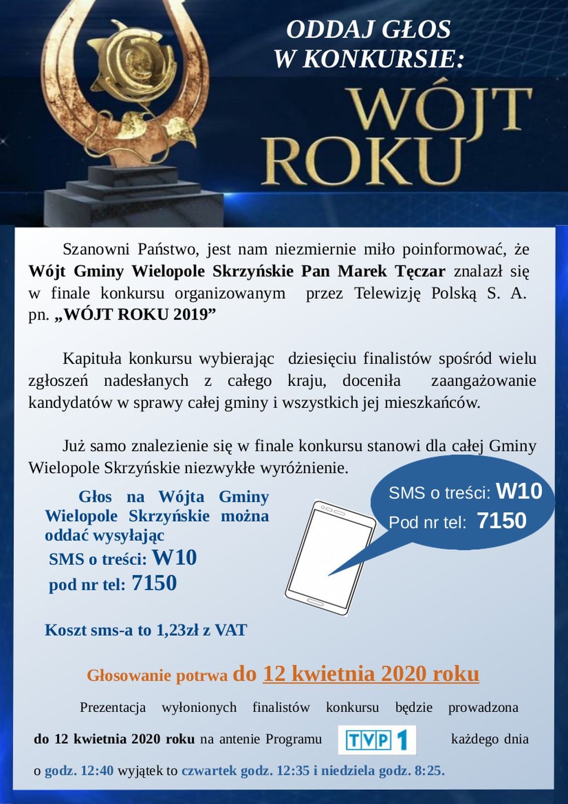 Aby zagłosować na Wójta Gminy Wielopole Skrzyńskie Marka Tęczara należy do 12 kwietnia 2020 roku wysłać SMS o treści W10 pod numer 7150. Koszt SMS to 1,23 zł