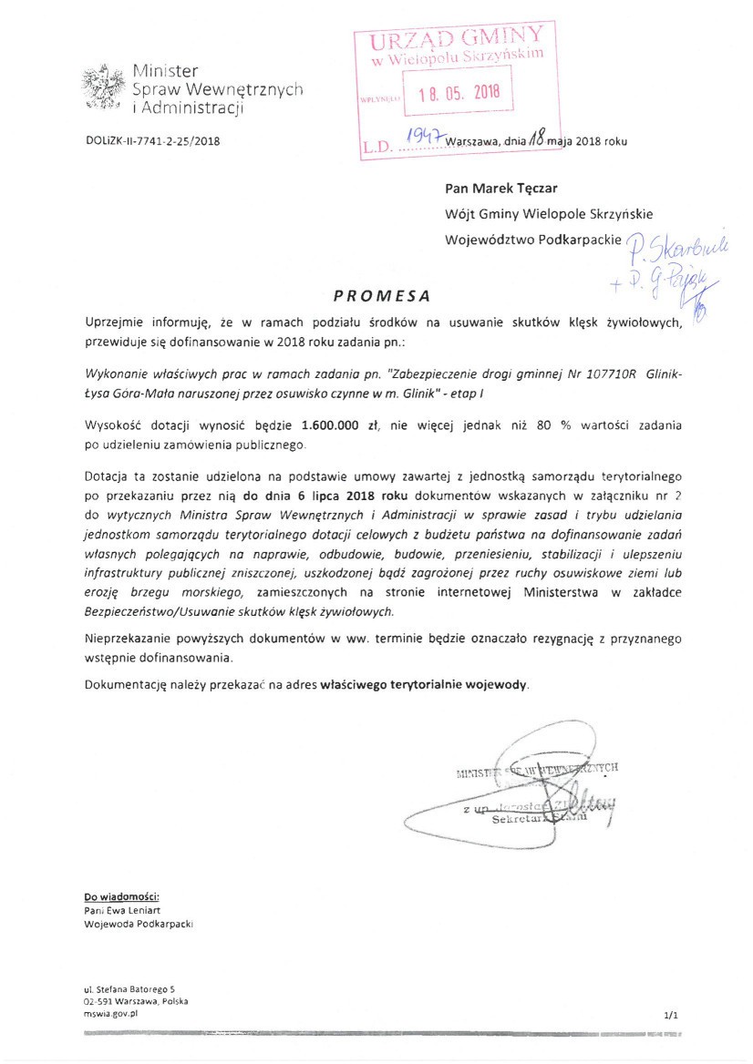 Szanowni Państwo, z radością informuję, że Gmina Wielopole Skrzyńskie otrzymała dofinansowanie z Ministerstwa Spraw Wewnętrznych i Administracji na realizację zadania pn. „Zabezpieczenie drogi gminnej Glinik – Łysa Góra – Mała naruszonej przez osuwisko czynne w miejscowości Glinik” - etap I.