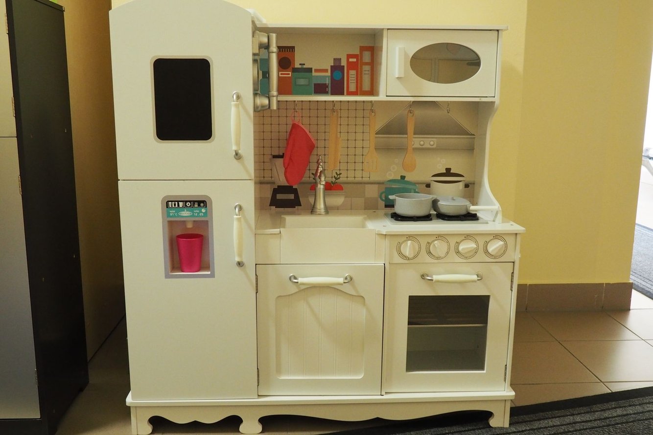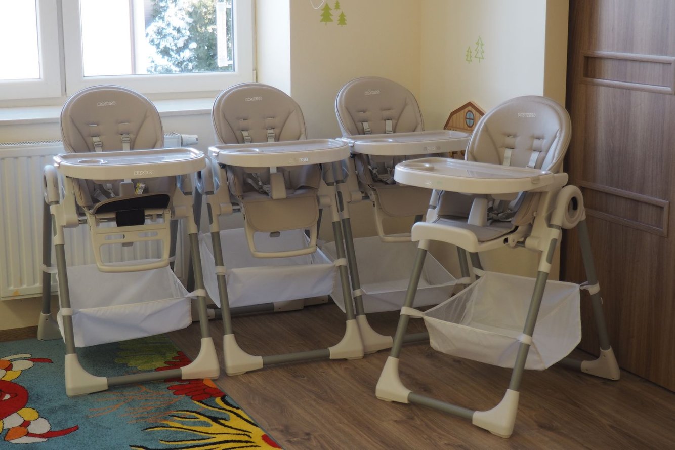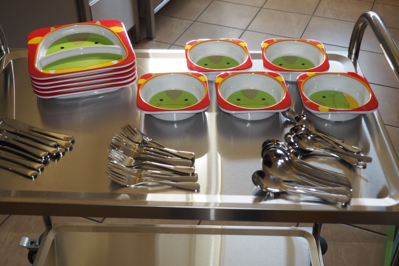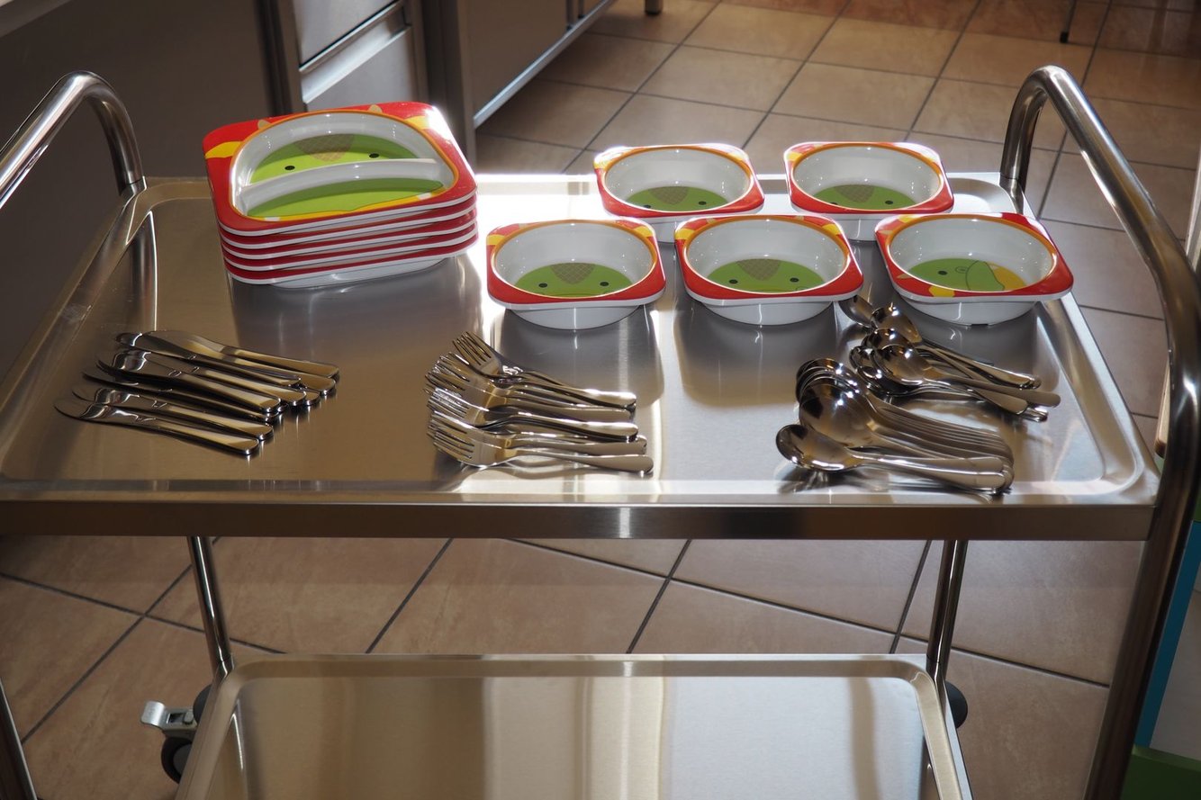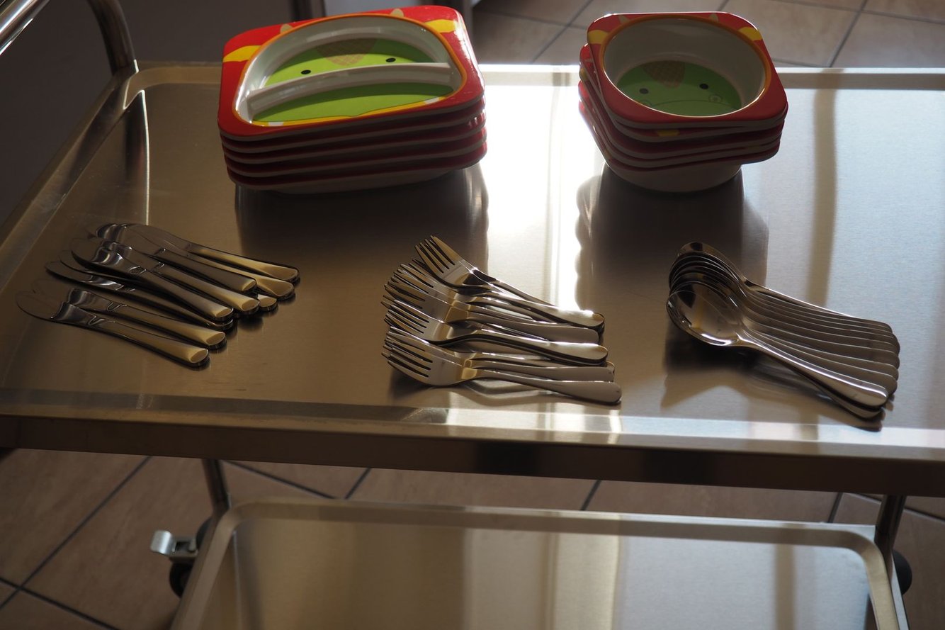 4.Wyposażenie zaplecza żłobka w tym zaplecza kuchni. Zakupiono meble ze stali nierdzewnej do kuchni, naczynia i sztućce do serwowania posiłków dla dzieci, brakujący sprzęt AGD (czajniki, warnik, profesjonalny blender, duża mikrofalówka, bemar jezdny, wózek kelnerski), a także sprzęt do sprzątania w formie profesjonalnego odkurzacza, myjki do okien, wózka do sprzątania , mopów, pojemników na odpady.