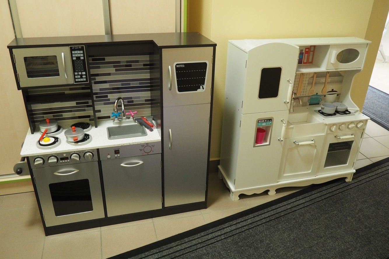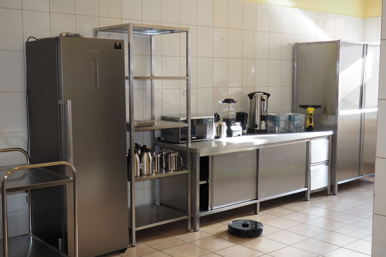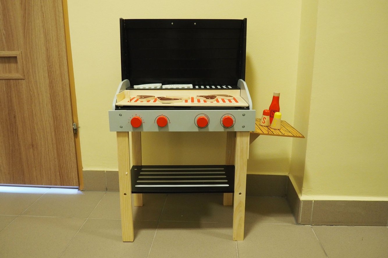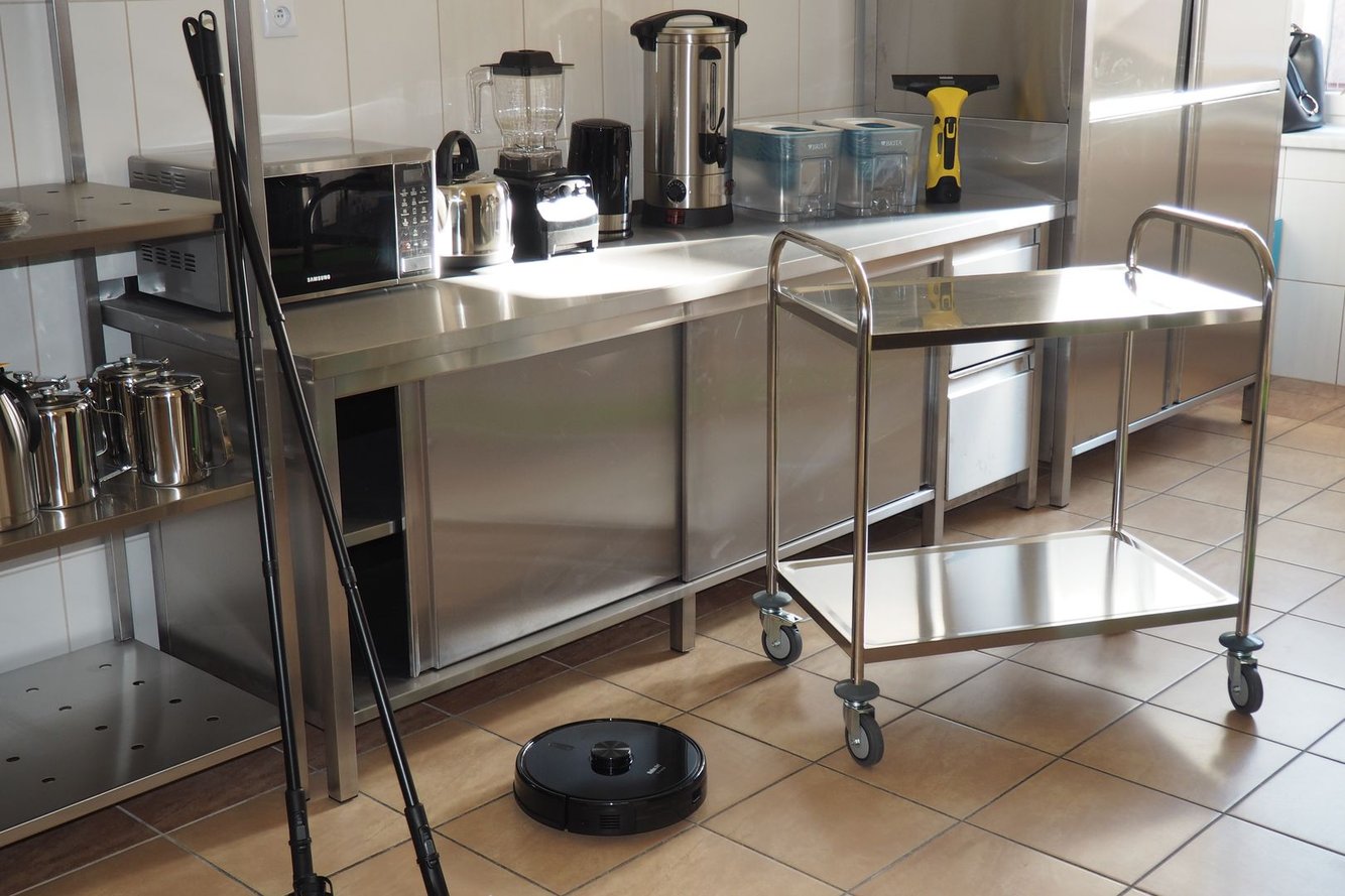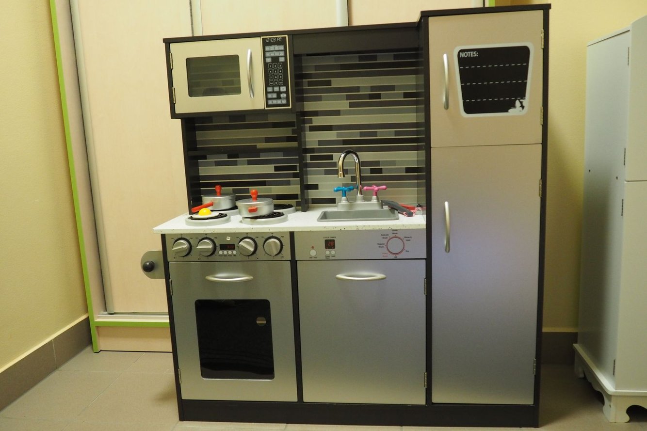 4.Wyposażenie zaplecza żłobka w tym zaplecza kuchni. Zakupiono meble ze stali nierdzewnej do kuchni, naczynia i sztućce do serwowania posiłków dla dzieci, brakujący sprzęt AGD (czajniki, warnik, profesjonalny blender, duża mikrofalówka, bemar jezdny, wózek kelnerski), a także sprzęt do sprzątania w formie profesjonalnego odkurzacza, myjki do okien, wózka do sprzątania , mopów, pojemników na odpady.