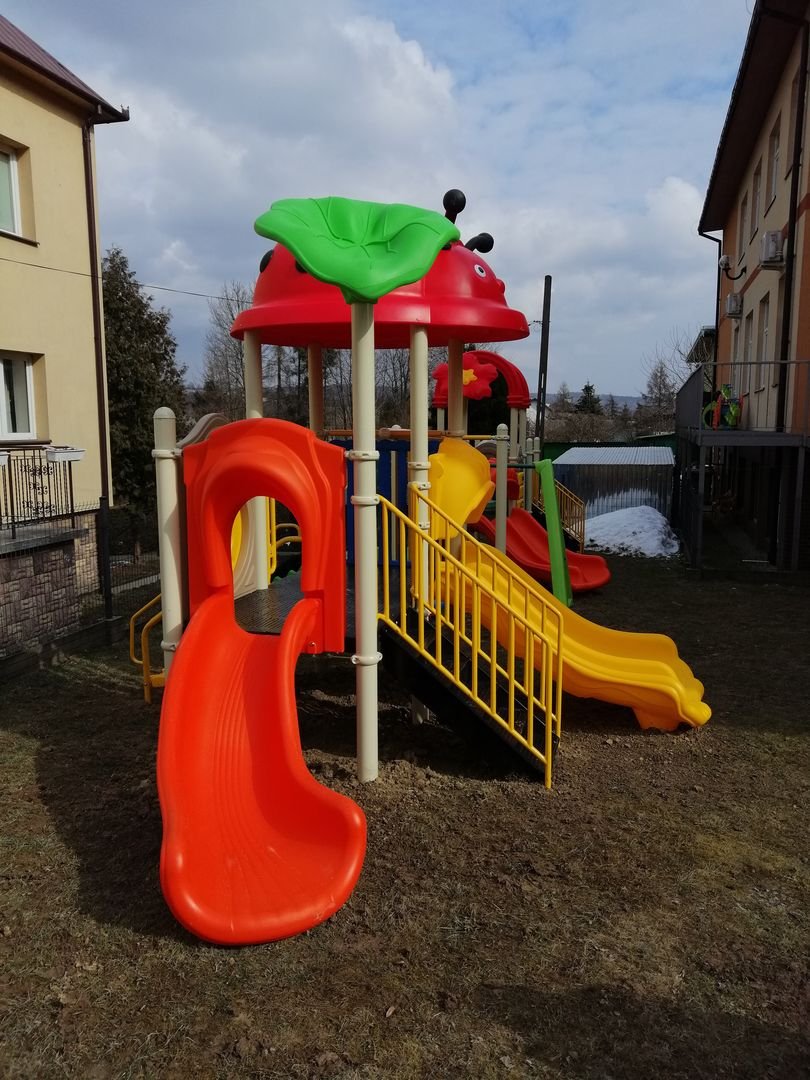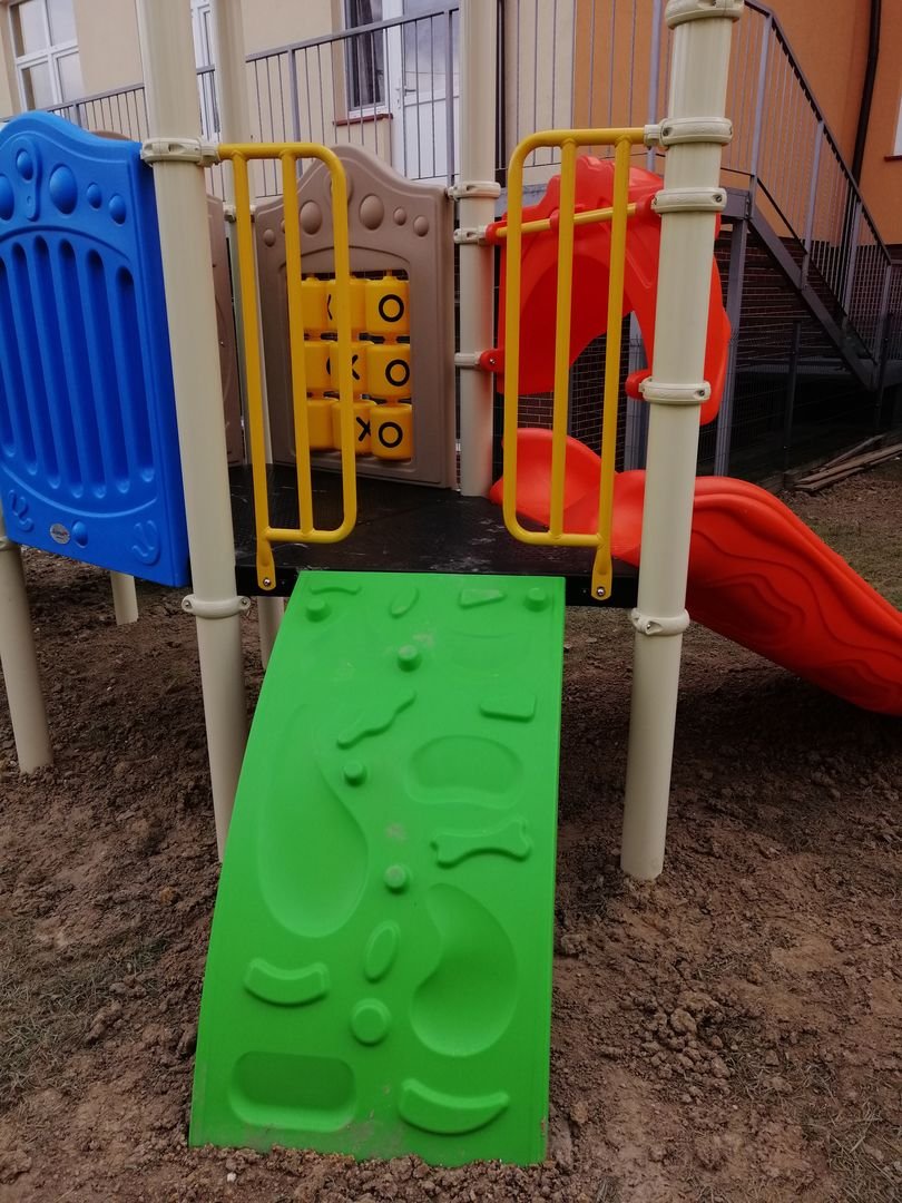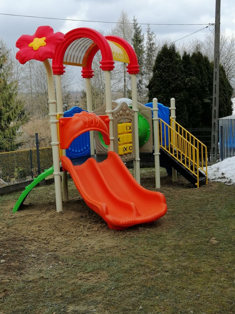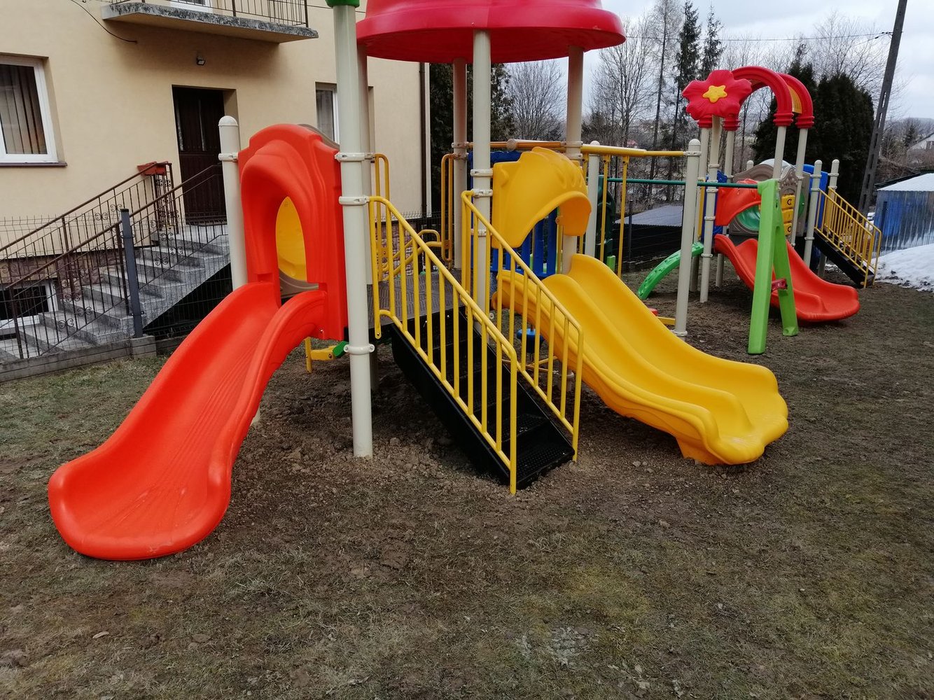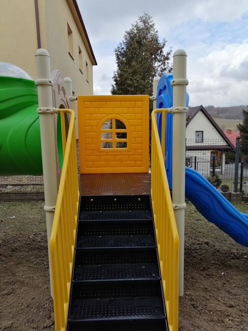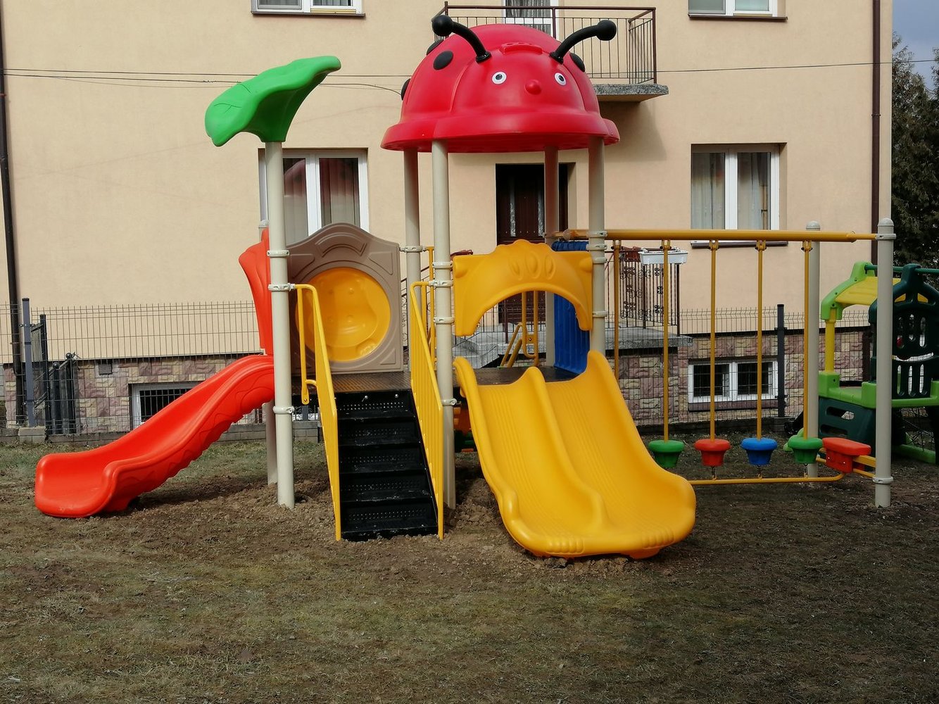 8. Ostatnim etapem będzie doposażenie przy żłobkowego placu zabaw. Zostały zamówione dwa zestawy zabawowe ze zjeżdżalniami, domek oraz ławeczki i stoliki ogrodowe dla dzieci.