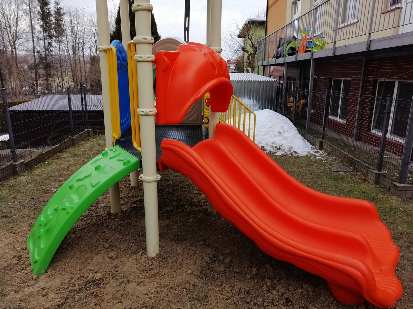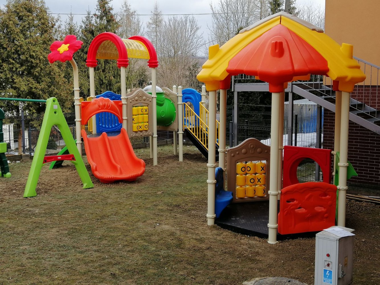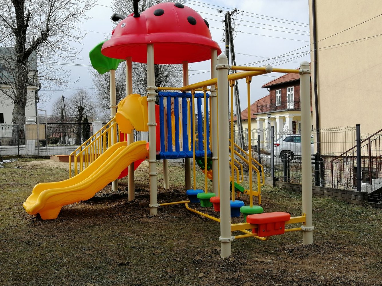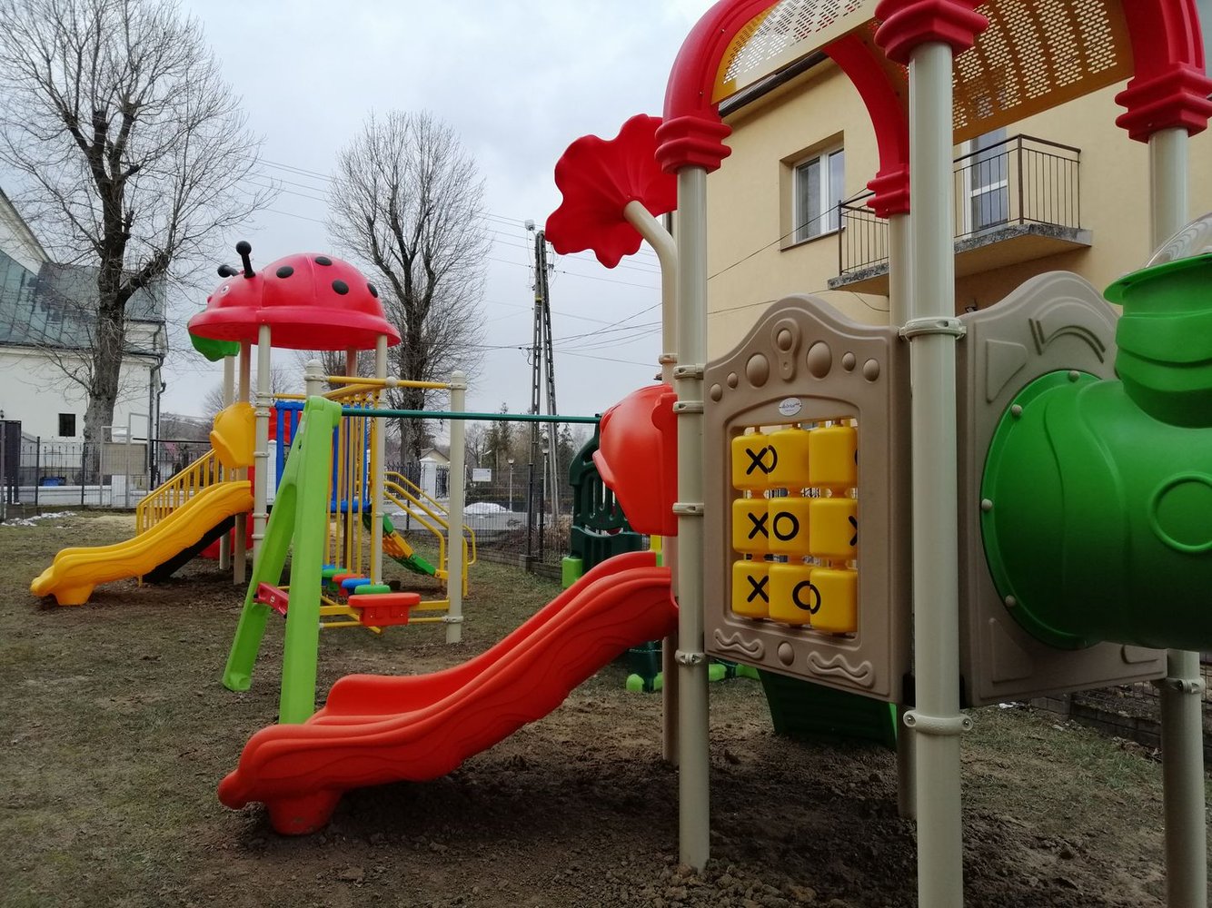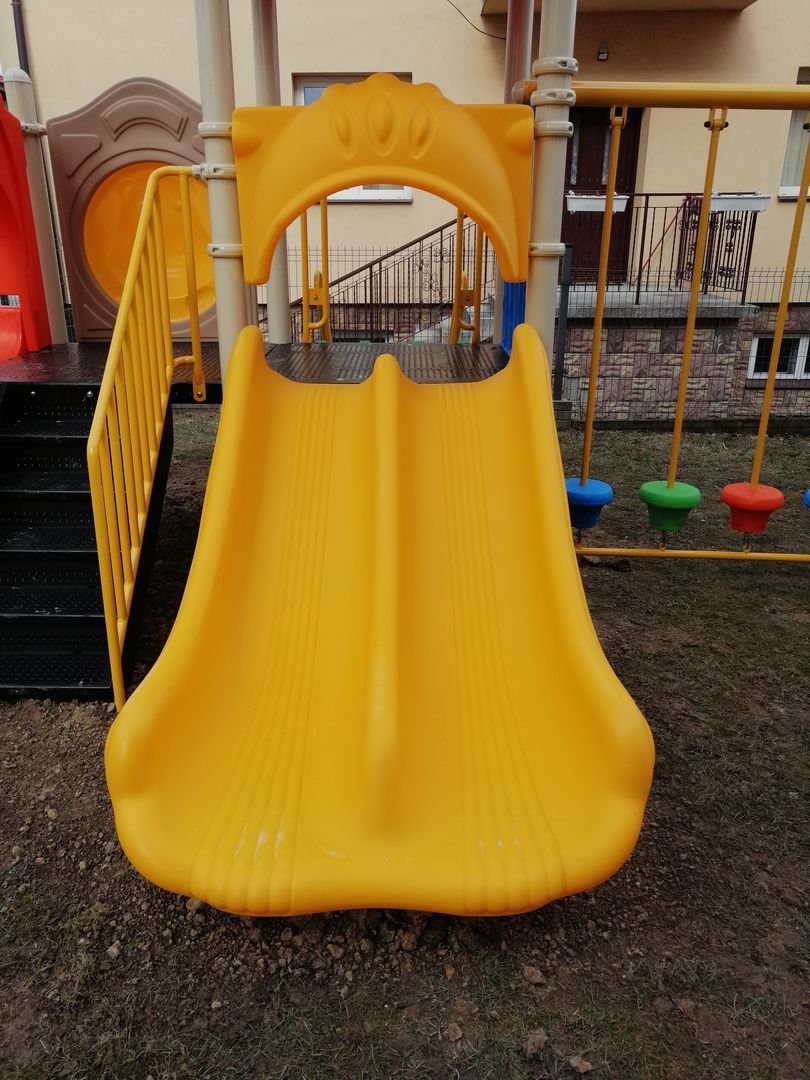 8. Ostatnim etapem będzie doposażenie przy żłobkowego placu zabaw. Zostały zamówione dwa zestawy zabawowe ze zjeżdżalniami, domek oraz ławeczki i stoliki ogrodowe dla dzieci.