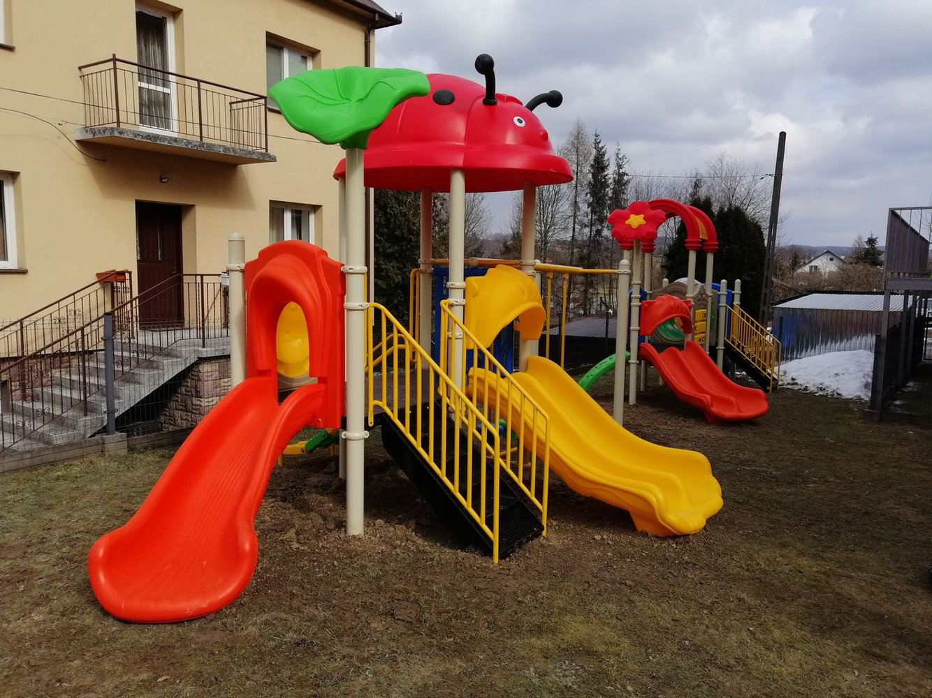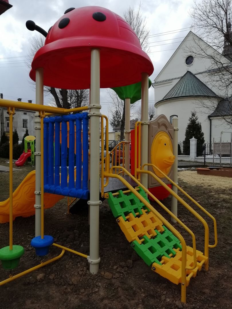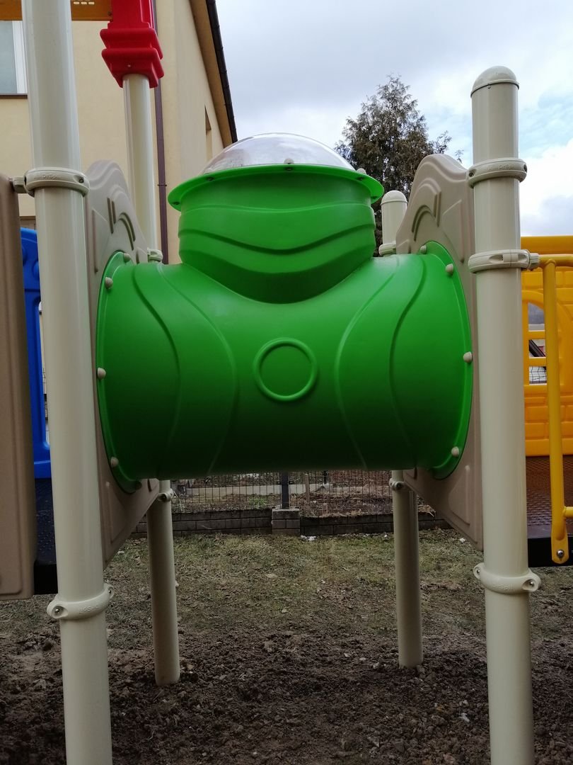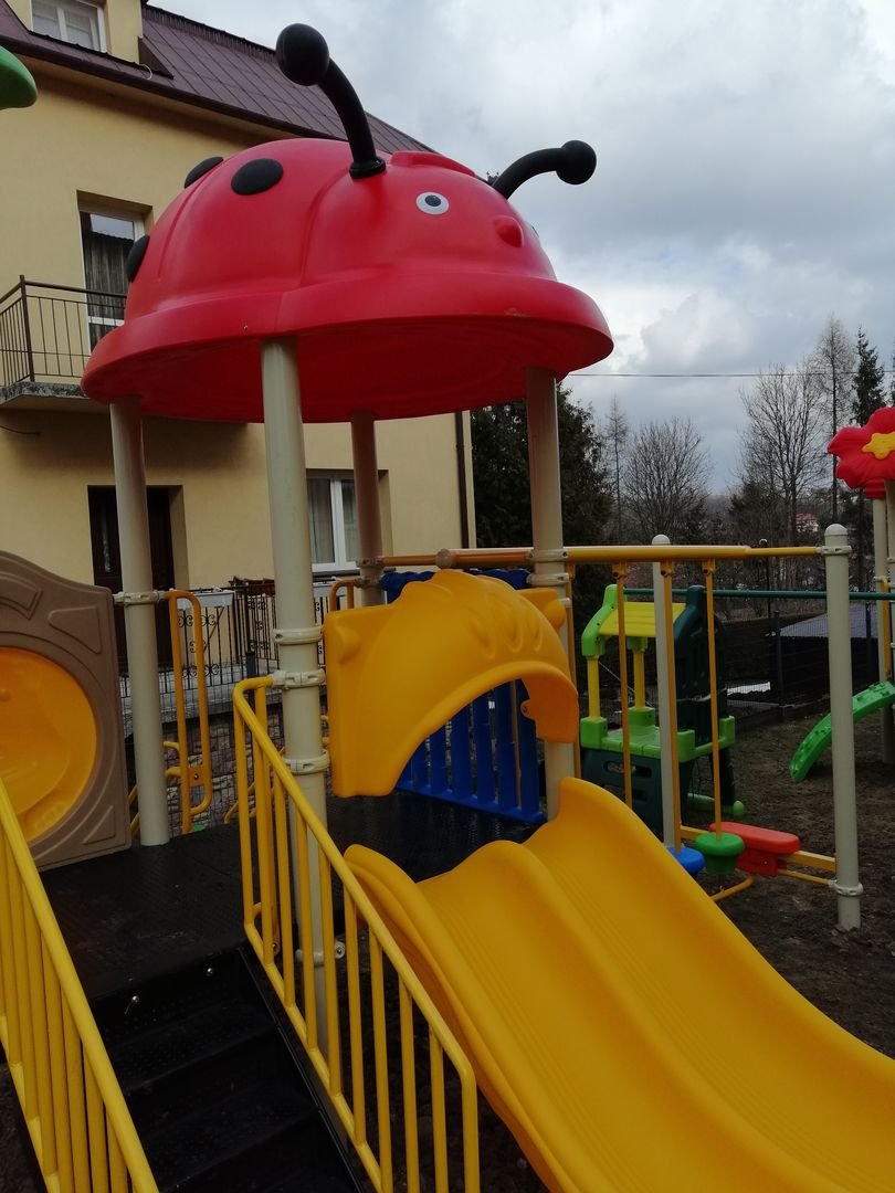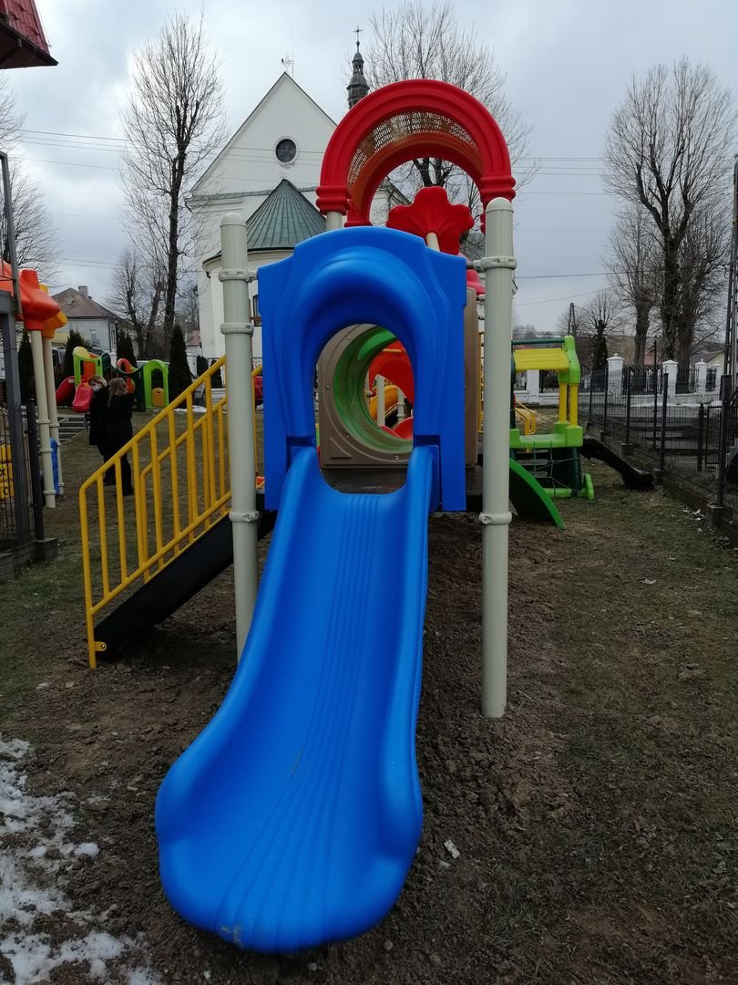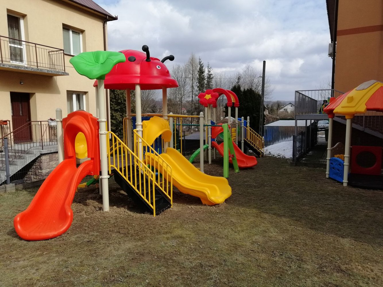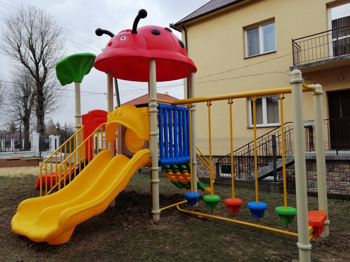 8. Ostatnim etapem będzie doposażenie przy żłobkowego placu zabaw. Zostały zamówione dwa zestawy zabawowe ze zjeżdżalniami, domek oraz ławeczki i stoliki ogrodowe dla dzieci.