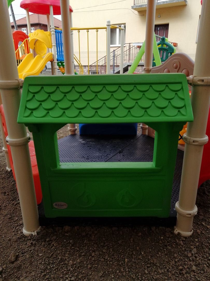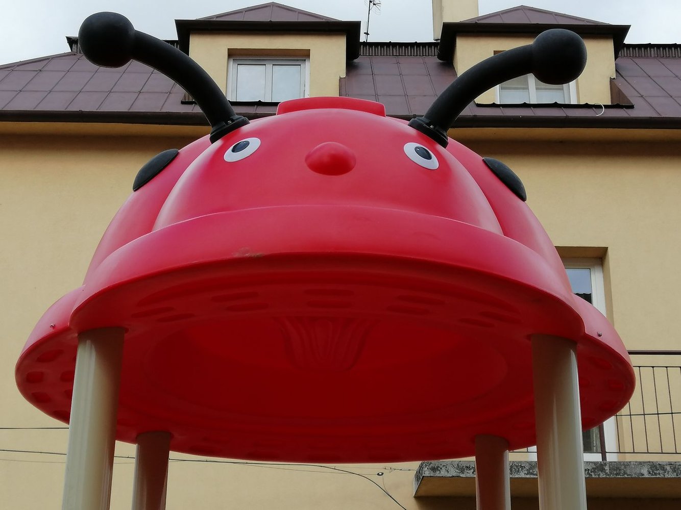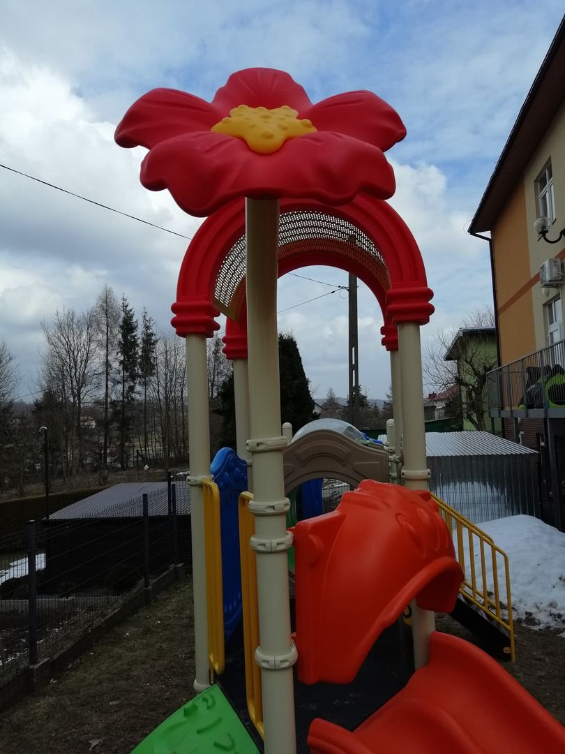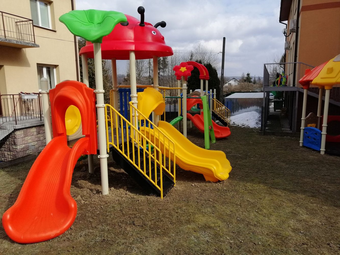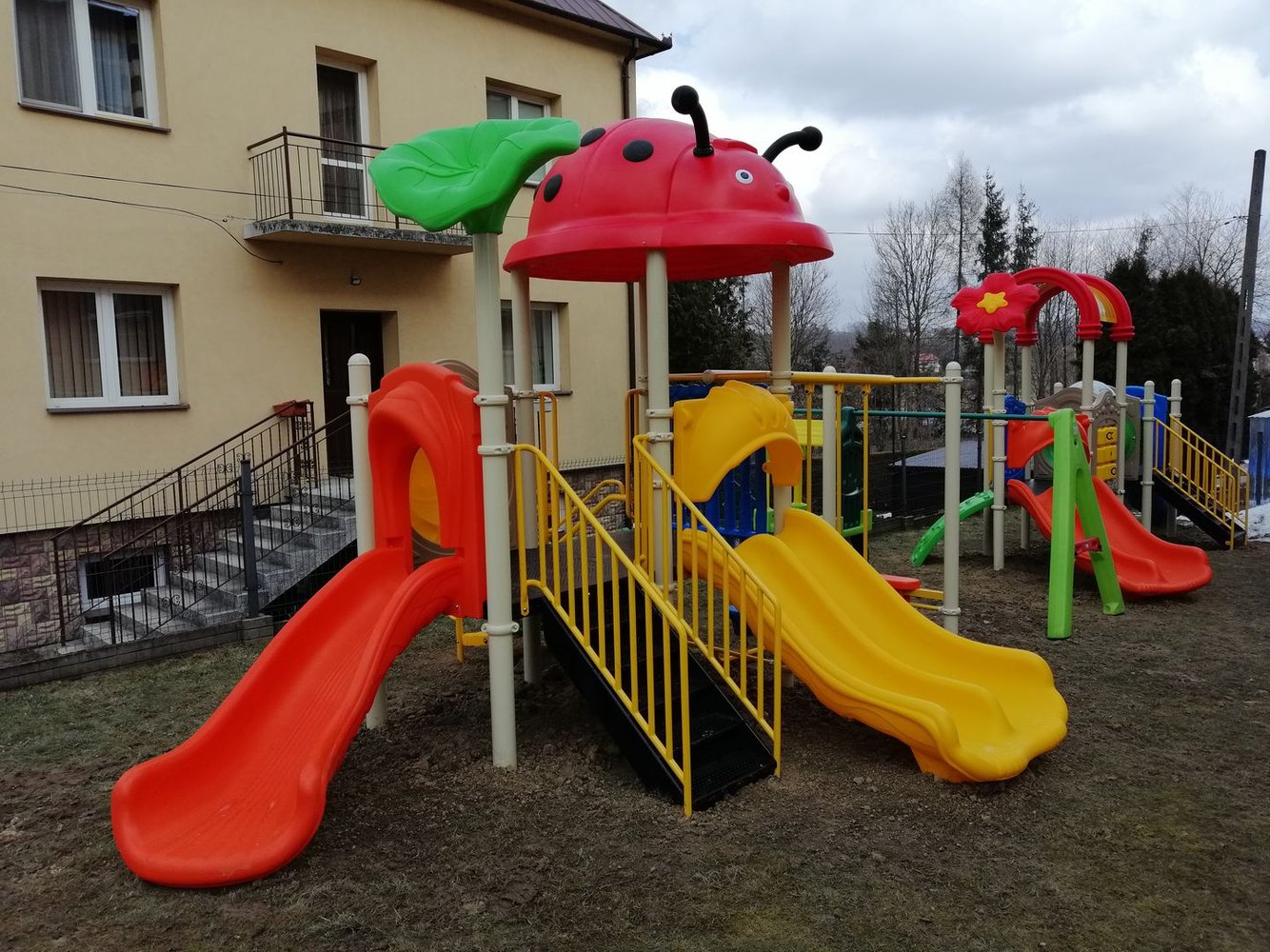 8. Ostatnim etapem będzie doposażenie przy żłobkowego placu zabaw. Zostały zamówione dwa zestawy zabawowe ze zjeżdżalniami, domek oraz ławeczki i stoliki ogrodowe dla dzieci.