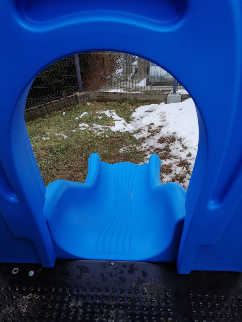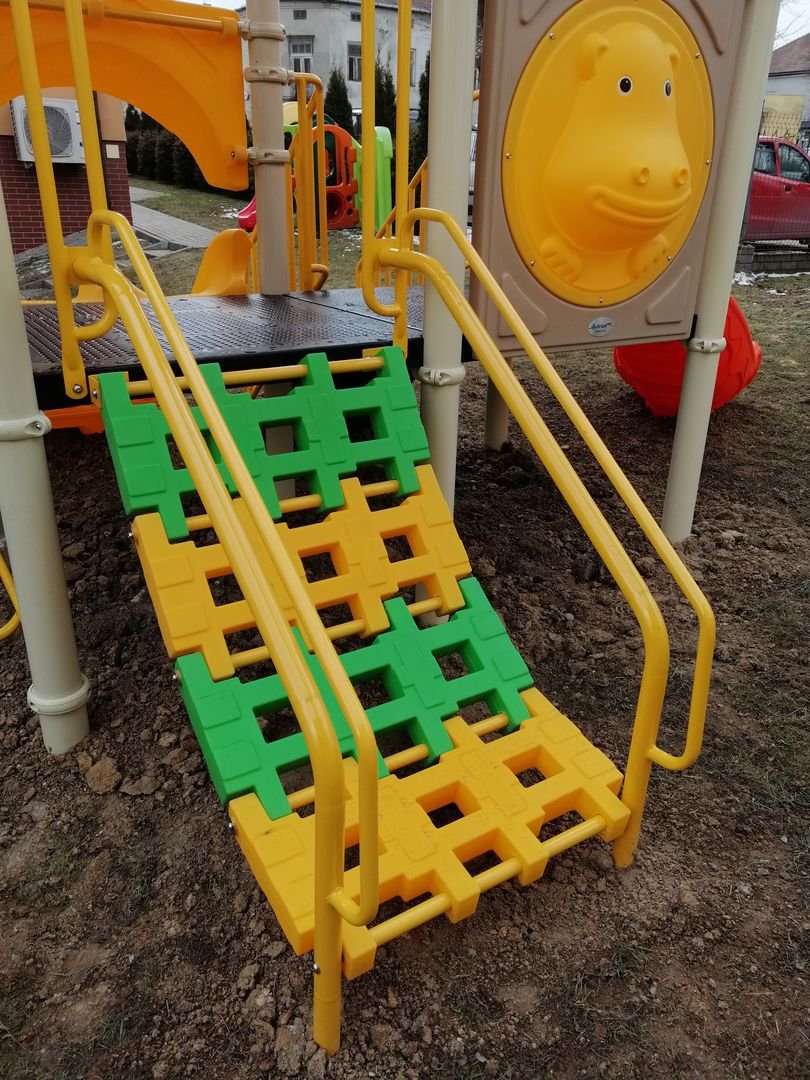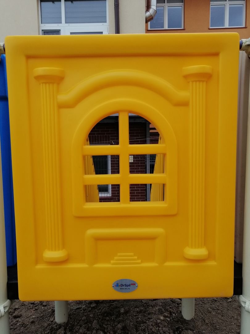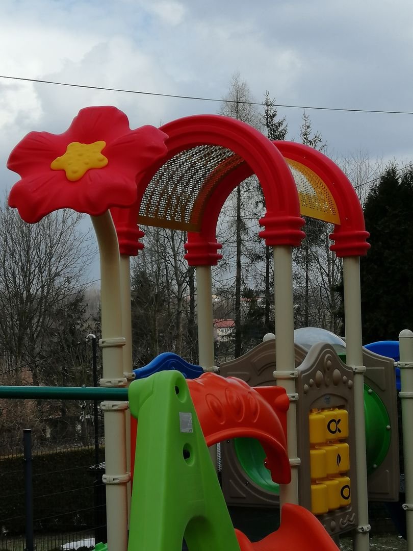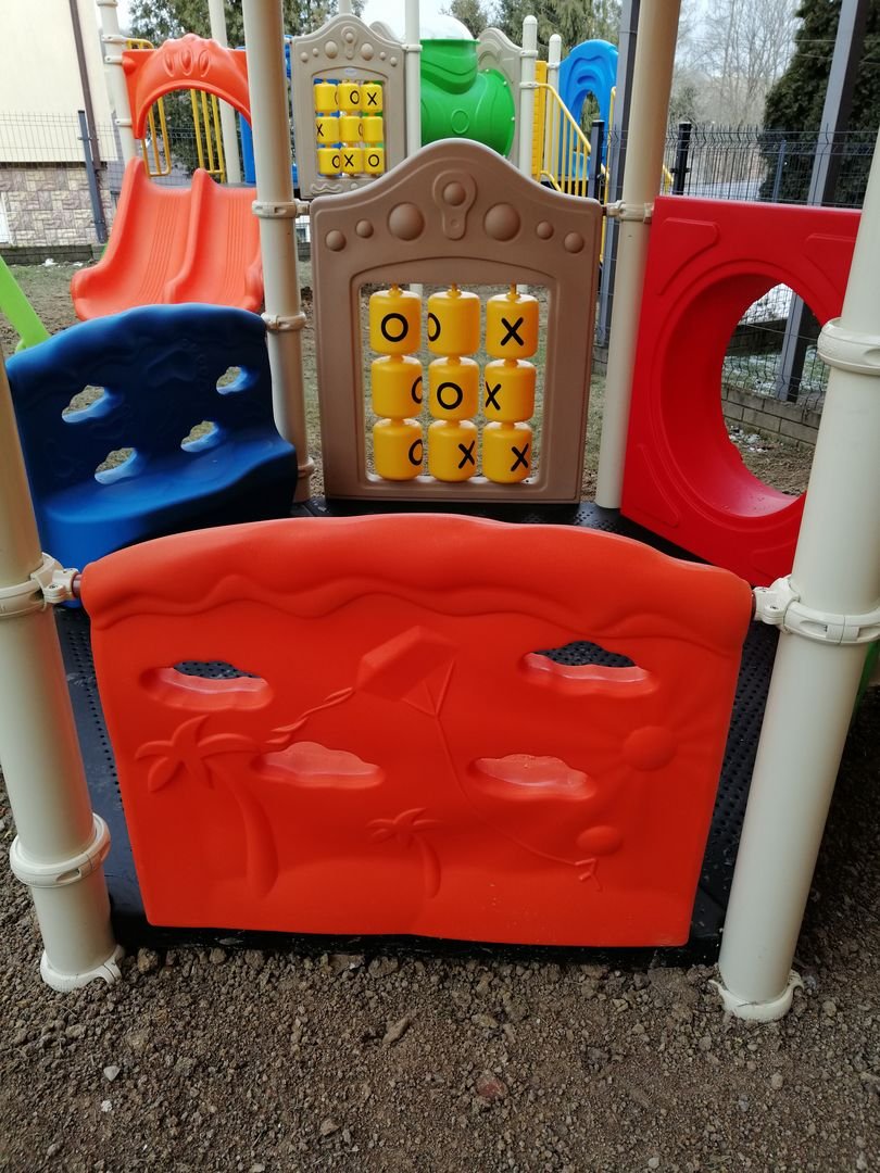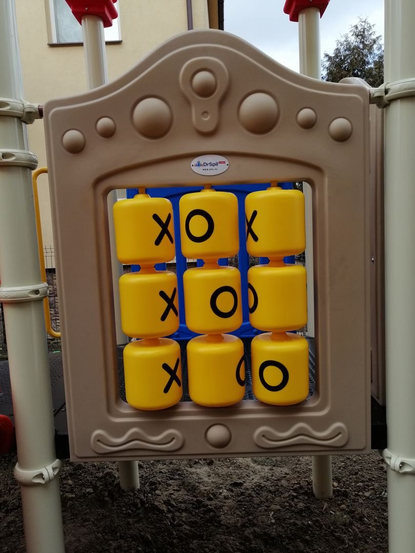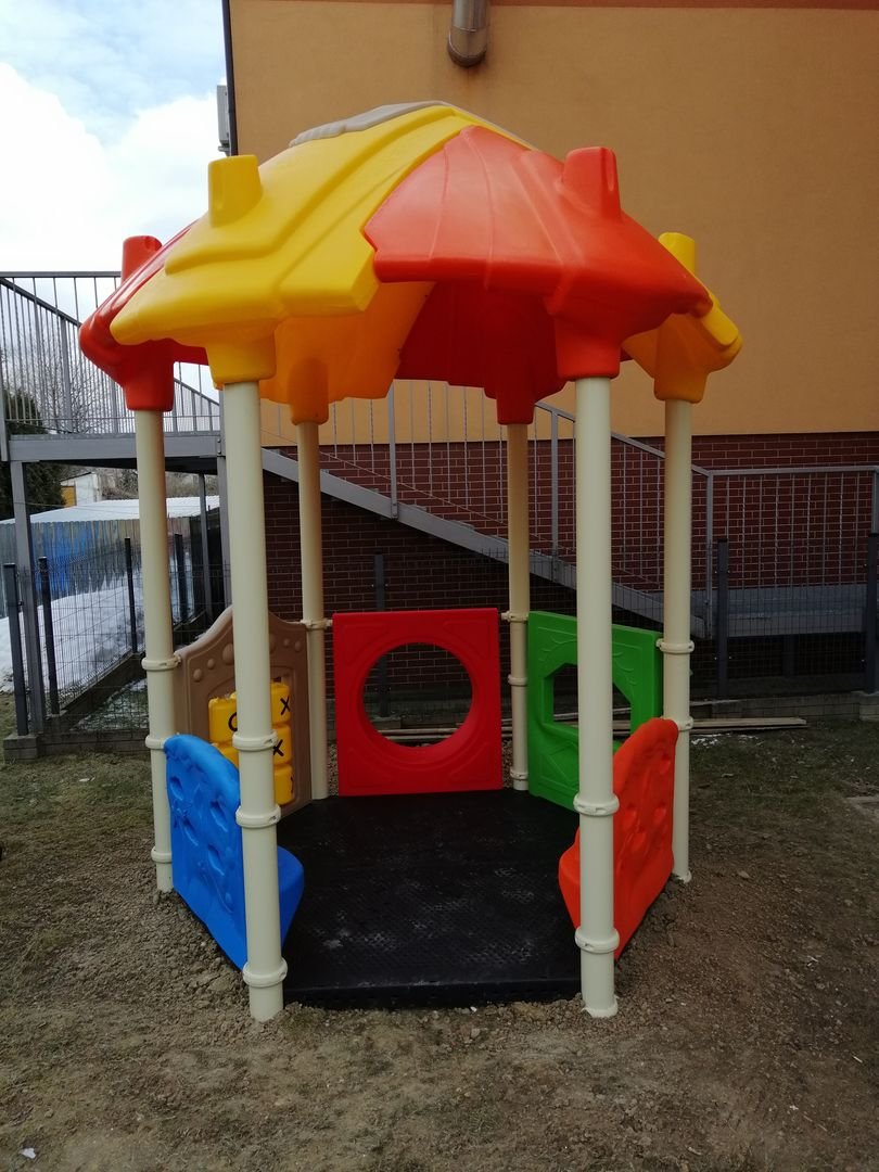 8. Ostatnim etapem będzie doposażenie przy żłobkowego placu zabaw. Zostały zamówione dwa zestawy zabawowe ze zjeżdżalniami, domek oraz ławeczki i stoliki ogrodowe dla dzieci.