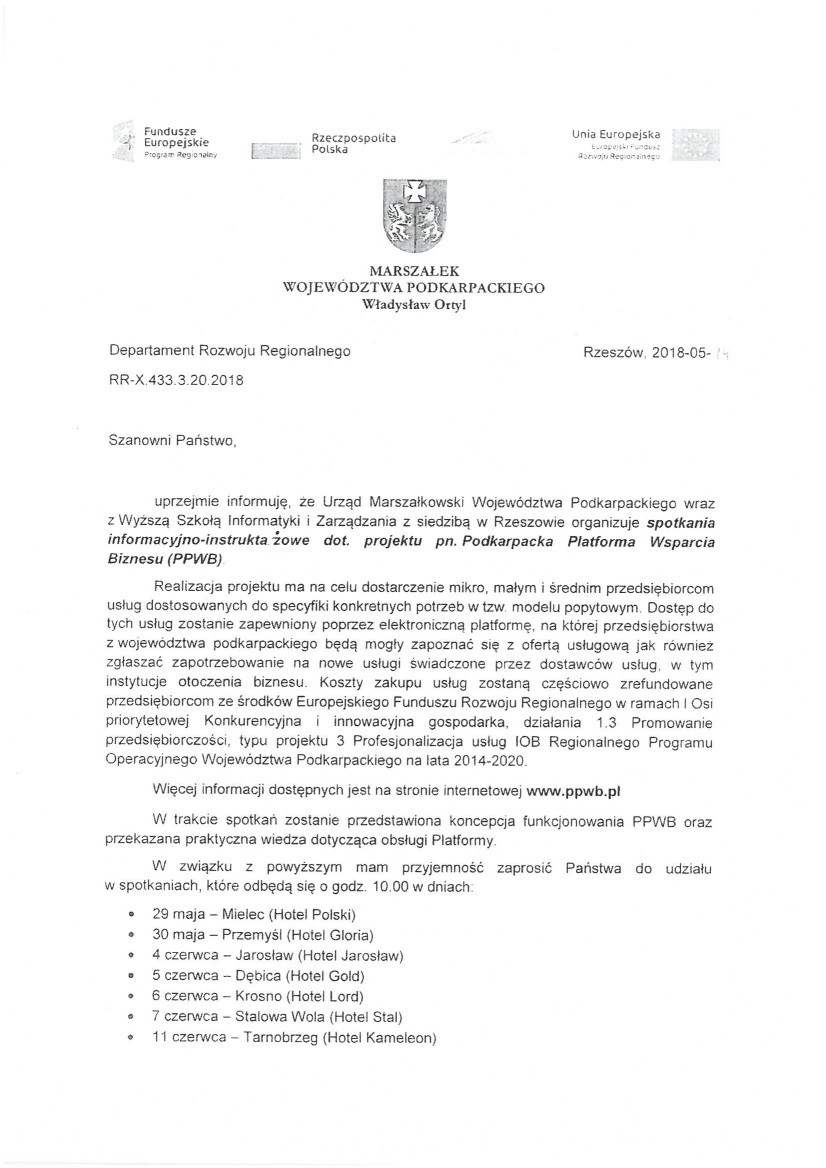 Zaproszenia na spotkania informacyjno - instruktażowe dotyczące Projektu pn. Podkarpacka Platforma Wsparcia Biznesu