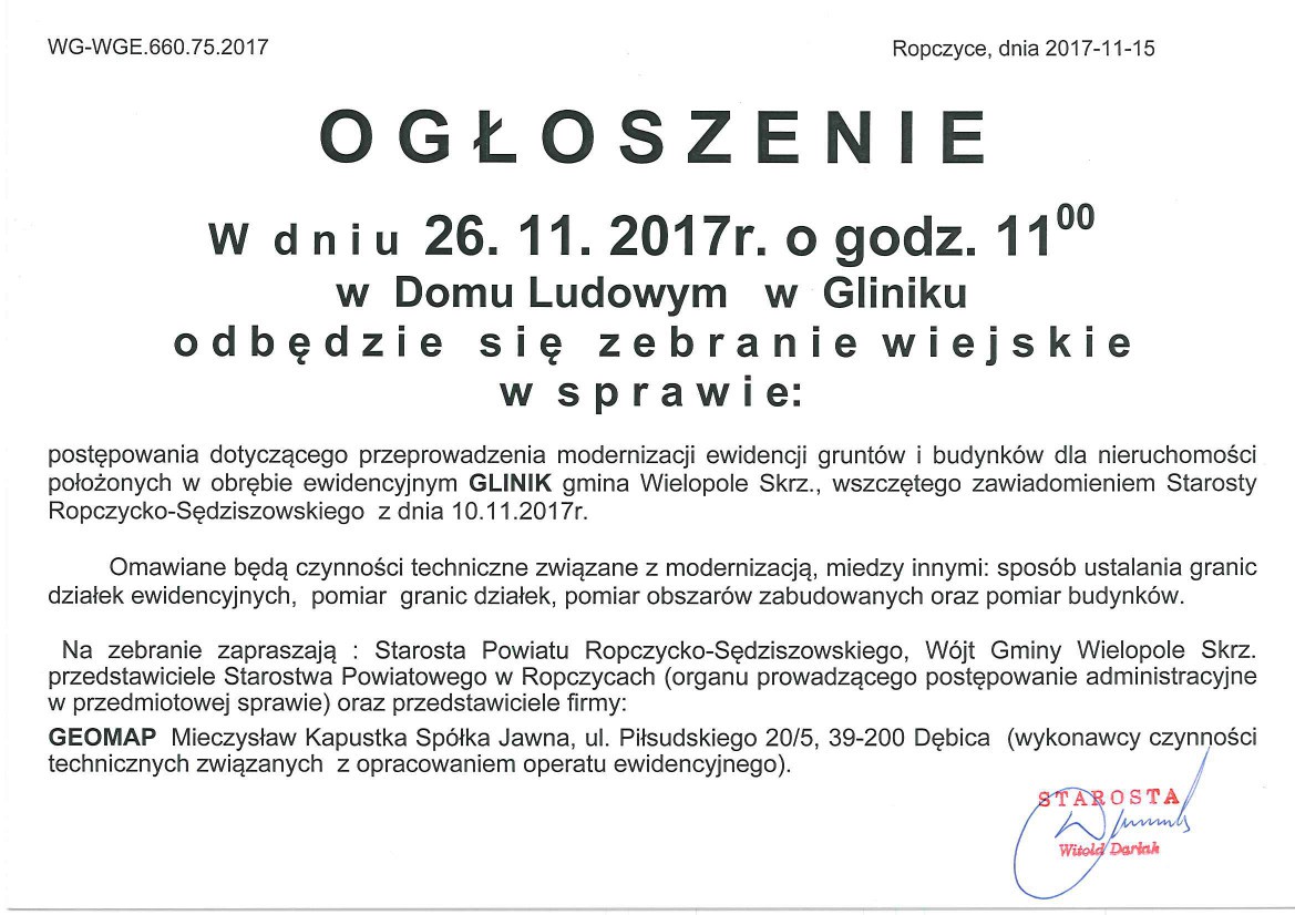 W dniu 26.11.2017r. o godz. 11:00 w Domu Ludowym w Gliniku odbędzie się zebranie wiejskie w sprawie postępowania dotyczącego przeprowadzenia modernizacji ewidencji gruntów i budynków.