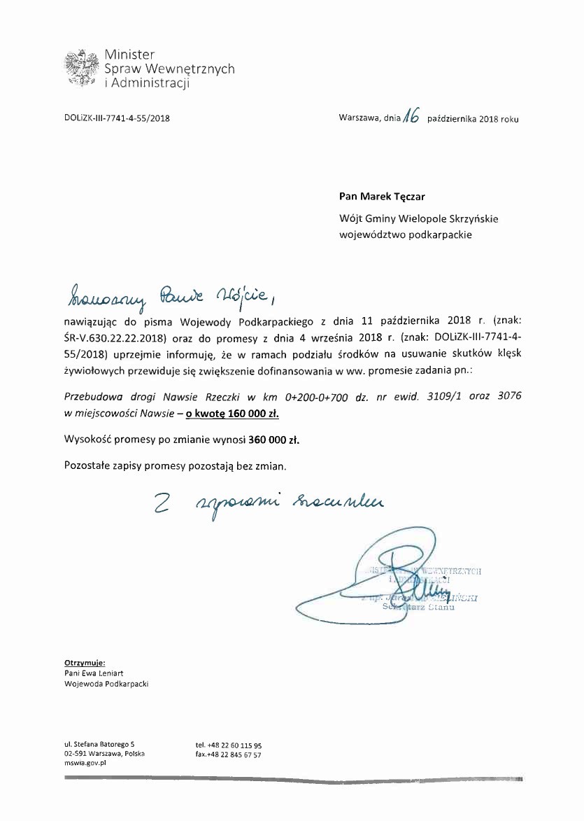 Dla przypomnienia we wrześniu br. otrzymaliśmy promesę w wysokości 200 000,00 zł z Dotacji Celowej Skarbu Państwa w ramach Usuwania Skutków Klęsk Żywiołowych na realizację inwestycji. Minister Spraw Wewnętrznych i Administracji zwiększył wartośc dotacji o 160 000,00 zł na wniosek Gminy Wielopole Skrzyńskie, który został poparty przez Wojewodę Podkarpackiego. Łącznie wysokosć przyznanej promesy po zmianie wynosi 360 000,00 zł.