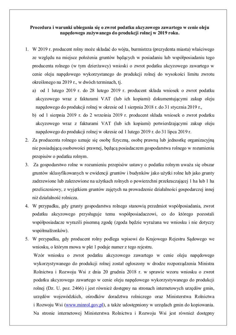 W terminie od 1 lutego 2019 roku do 28 lutego 2019 roku w Urzędzie Gminy w Wielopolu Skrzyńskim przyjmowane będą wnioski o zwrot podatku akcyzowego zawartego w cenie oleju napędowego.