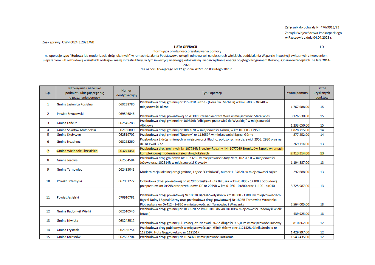 Złożony przez nasza Gminę, w lutym bieżącego roku, wniosek o dofinansowanie projektu pn.: „Przebudowa dróg gminnych Nr 107734R Brzeziny-Rędziny i Nr 107703R Broniszów Zapole w ramach kompleksowej modernizacji sieci dróg lokalnych” znalazł się 7 miejscu na 101 złożonych wniosków na liście operacji informującej o kolejności przysługiwania pomocy na operacje typu "Budowa lub modernizacja dróg lokalnych" w ramach Programu Rozwoju Obszarów Wiejskich na lata 2014- 2020.