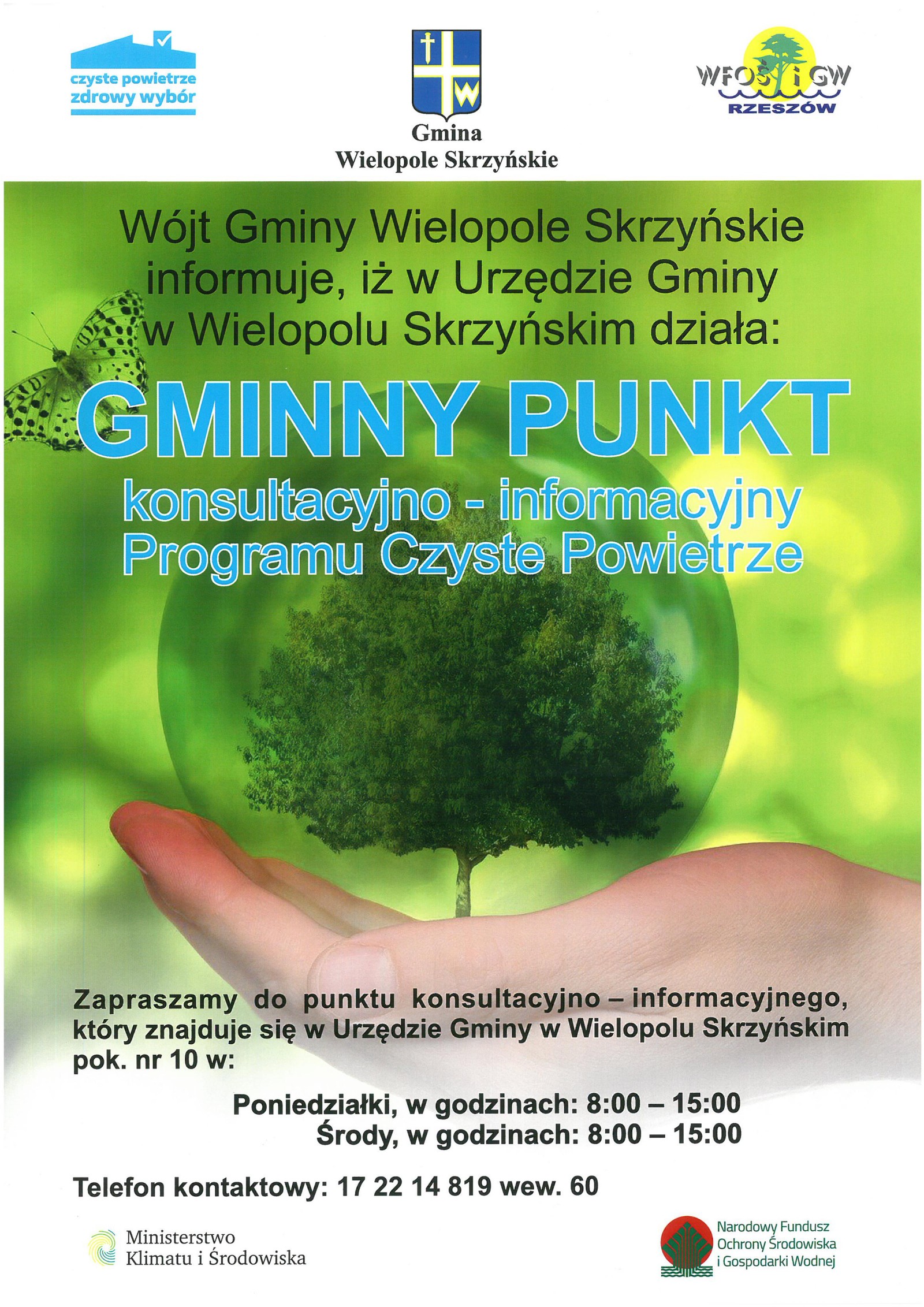 W ramach podpisanego porozumienia od 14 czerwca 2021 roku został w naszej gminie uruchomiony punkt konsultacyjno – informacyjny programu priorytetowego ,,Czyste Powietrze” , który jest zlokalizowany w budynku Urzędu Gminy pok. nr 10,tel. 17 22 14 819 wew. 60.