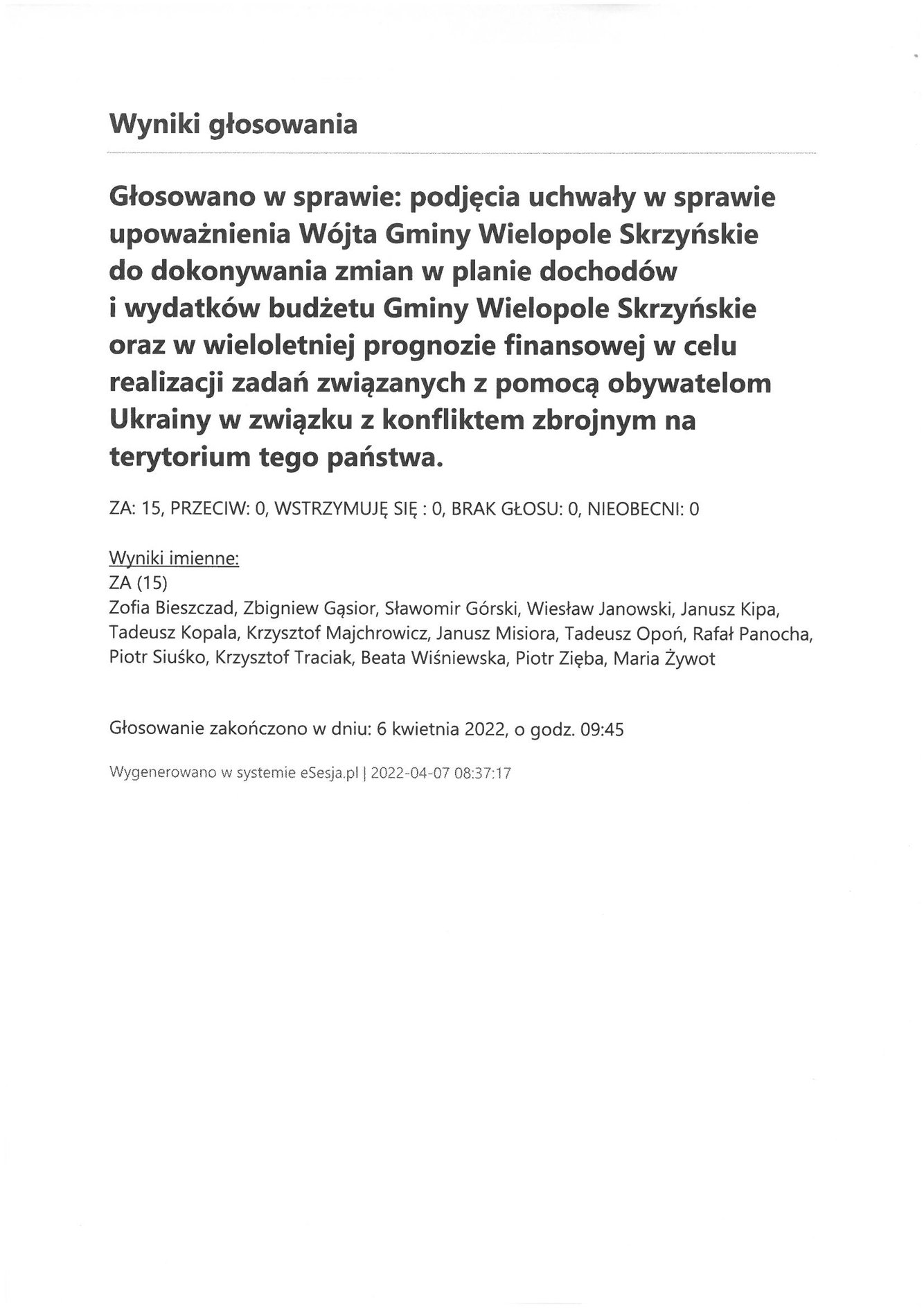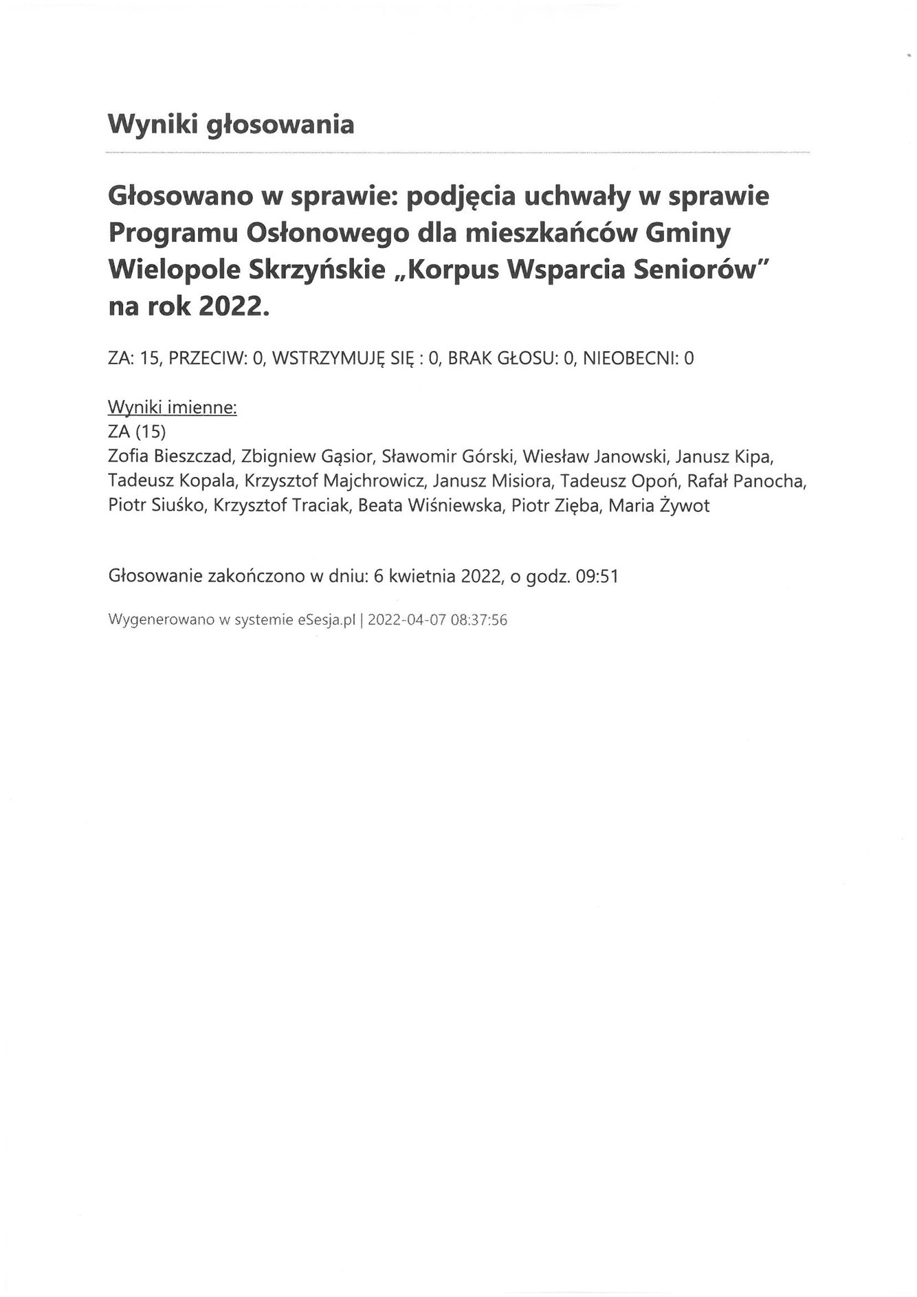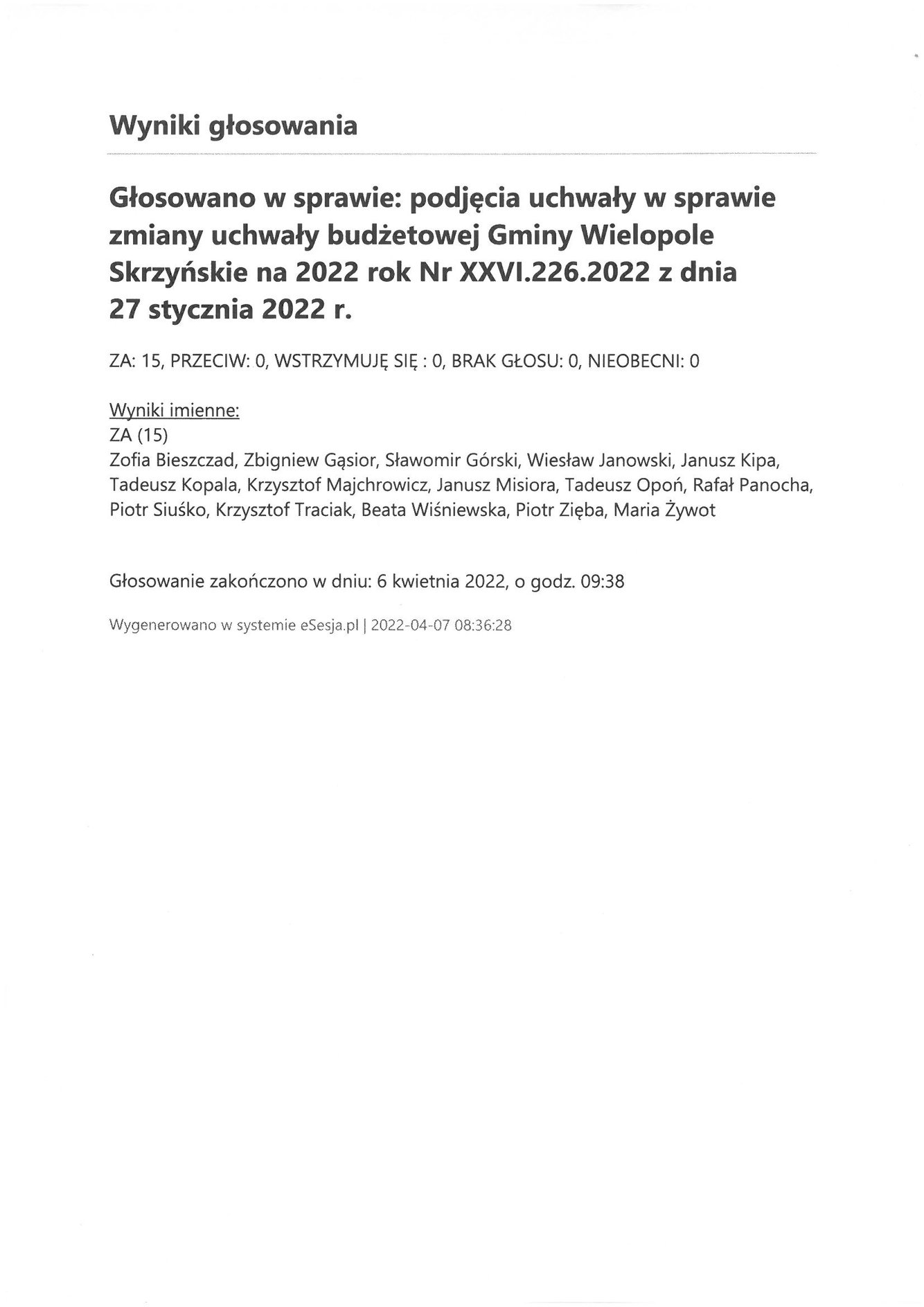 Czwartek 7 kwietnia 2022 Imienny wykaz głosowań radnych Strona Główna/Informator/InformacjeImienny wykaz głosowań radnychImienny wykaz głosowań radnych