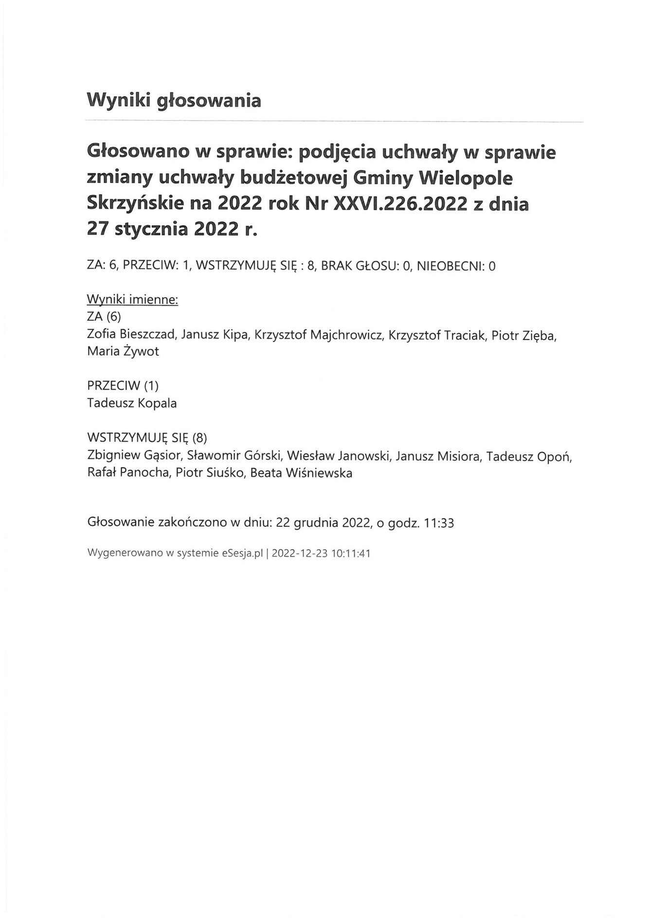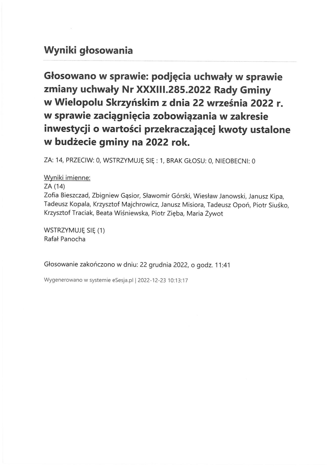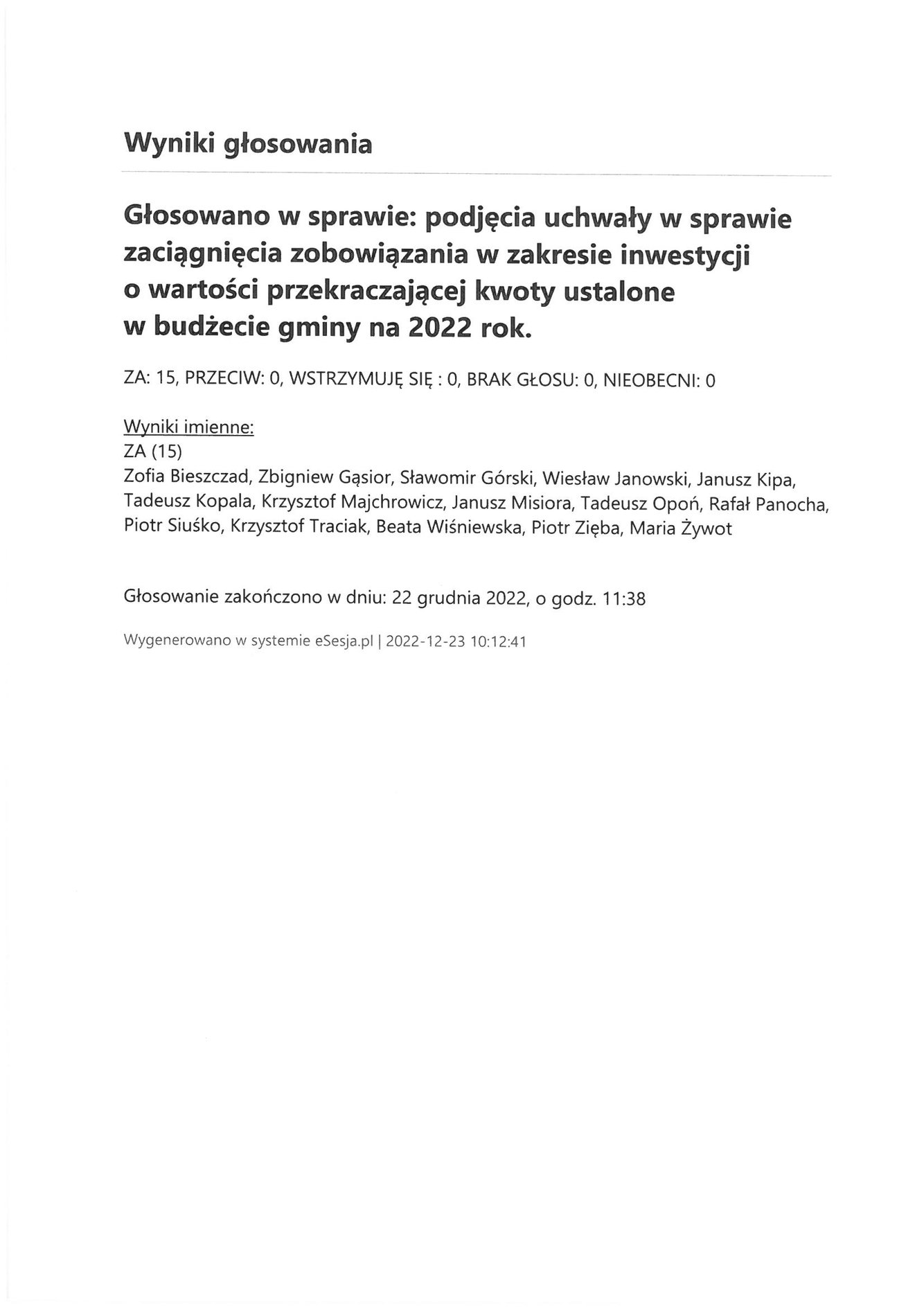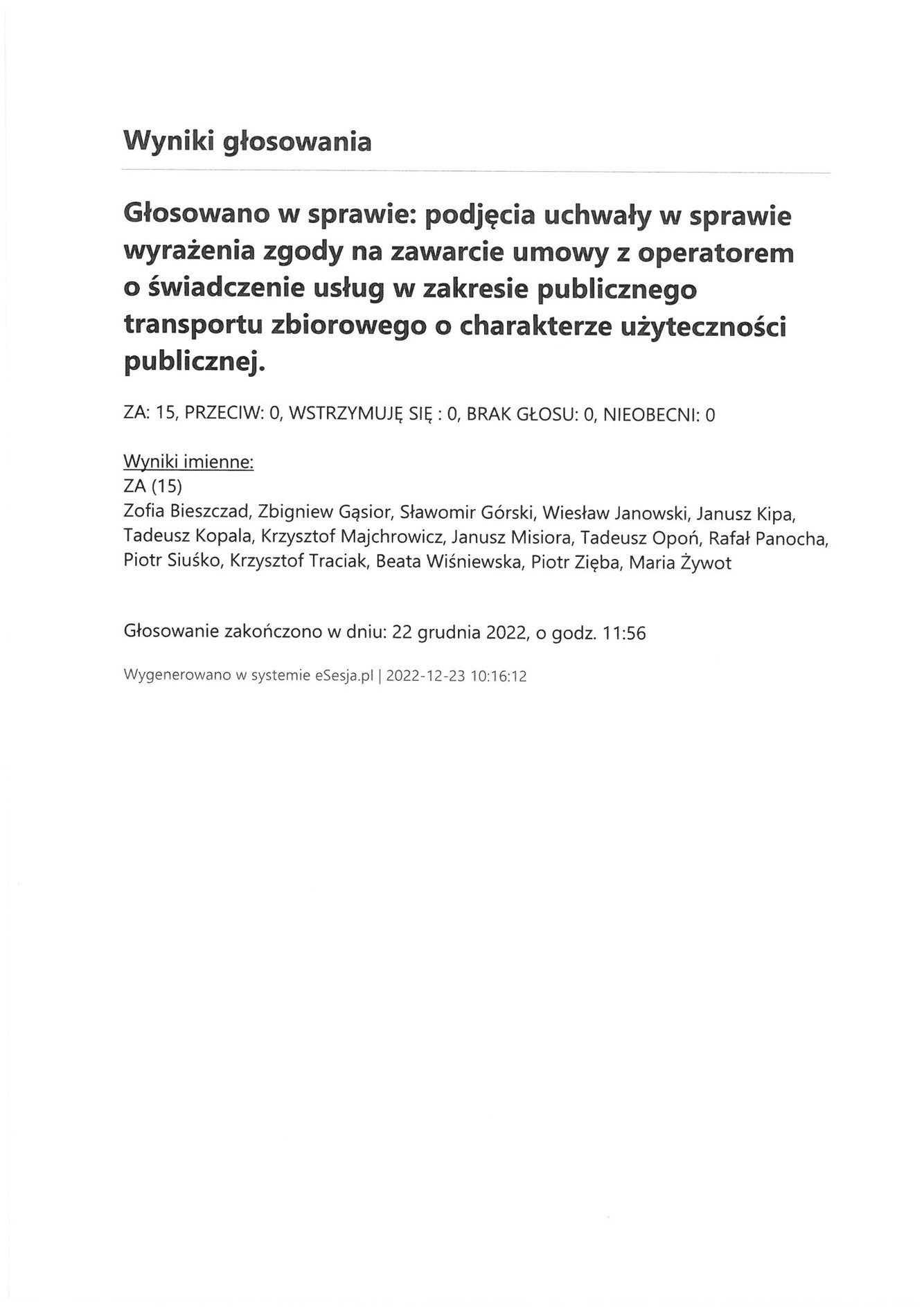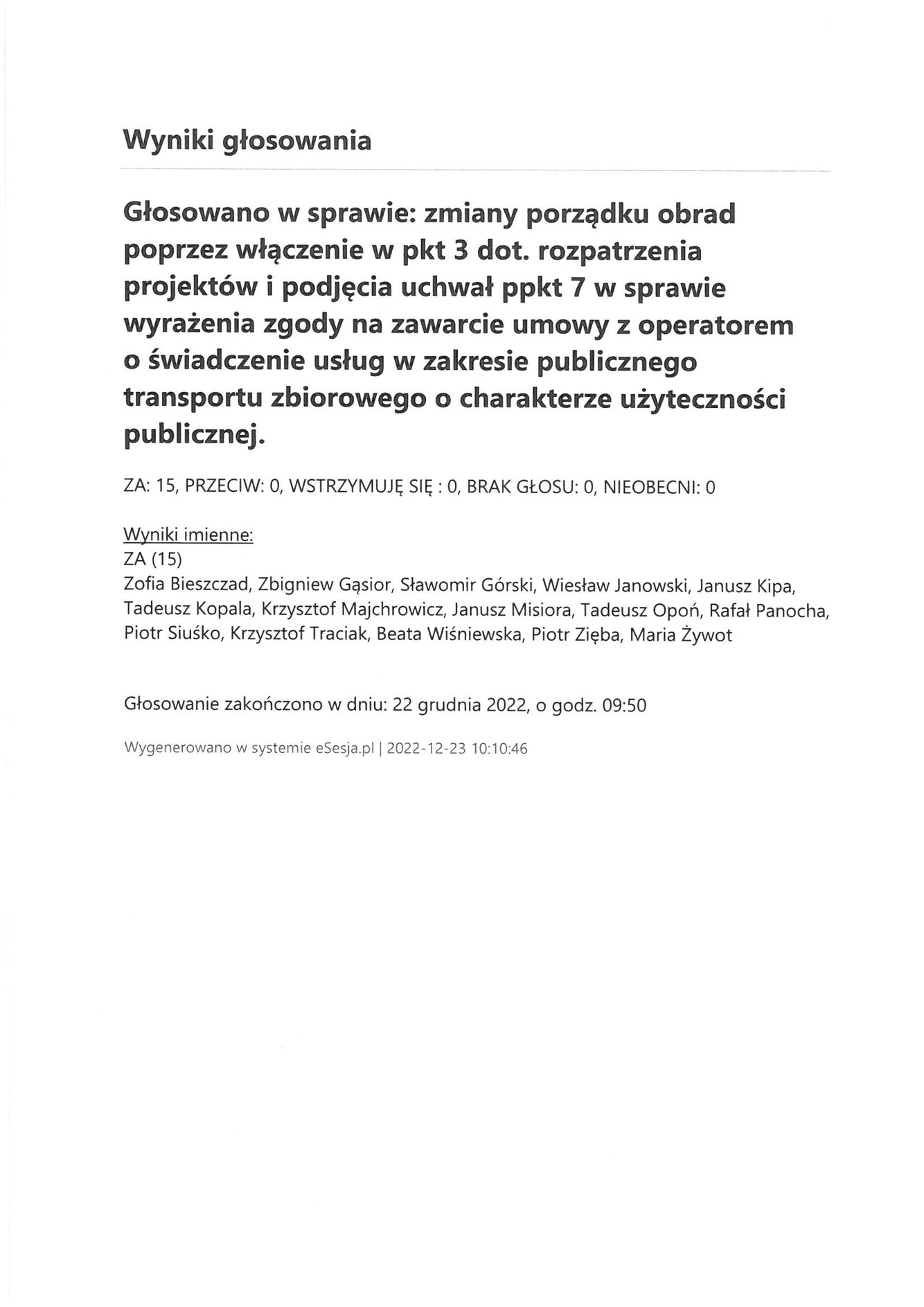 Piątek 23 grudnia 2022 Imienny wykaz głosowań radnych Strona Główna/Informator/InformacjeImienny wykaz głosowań radnychImienny wykaz głosowań radnych