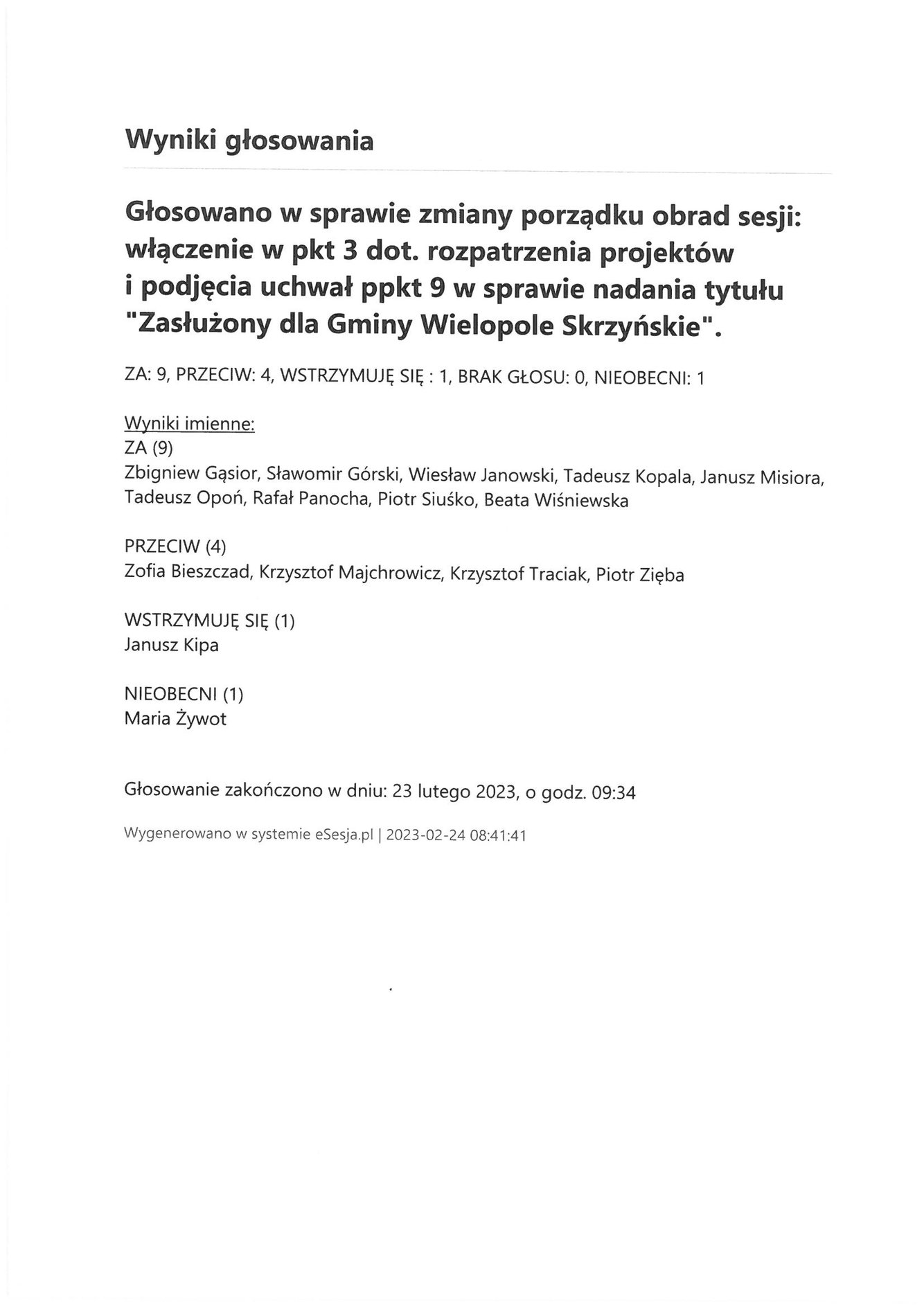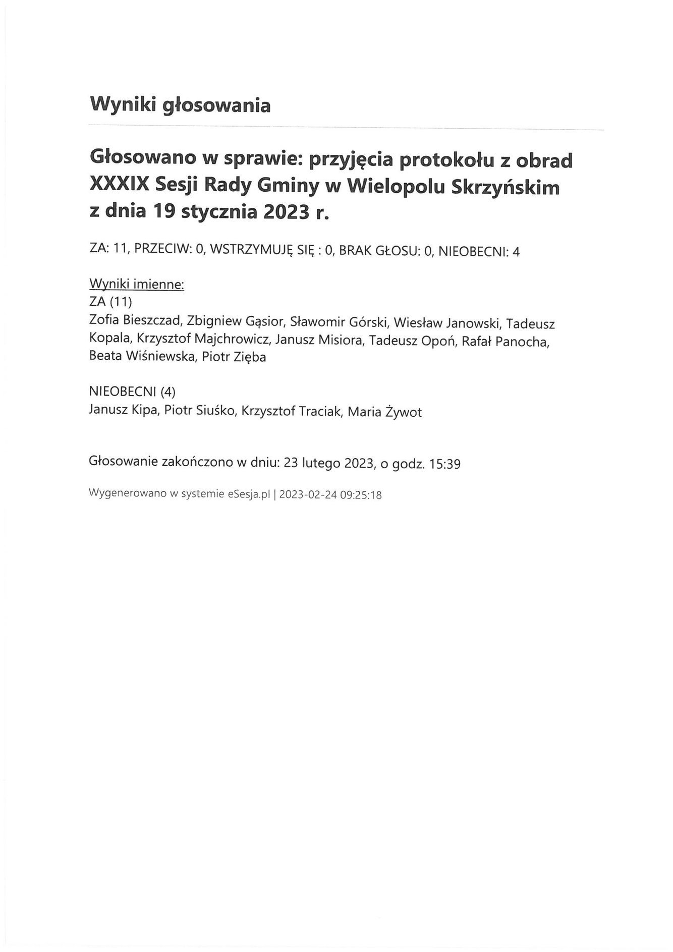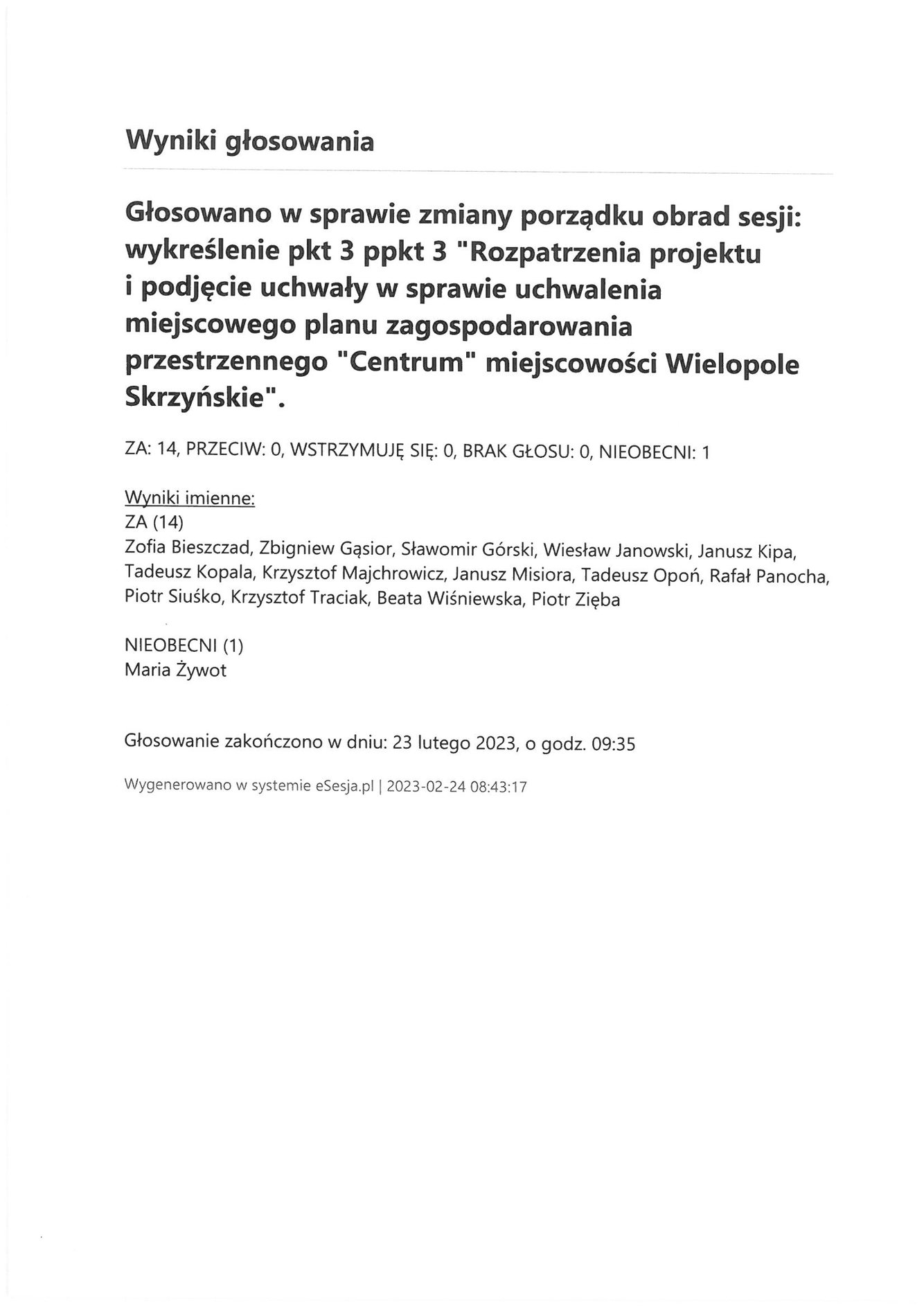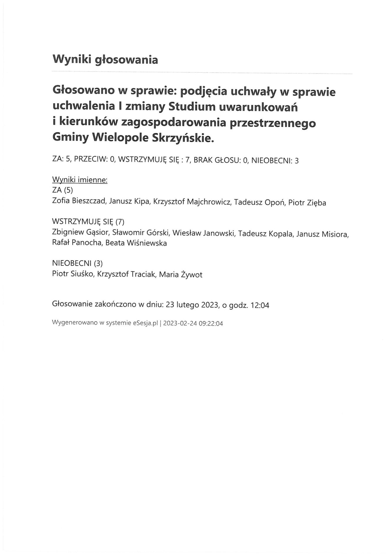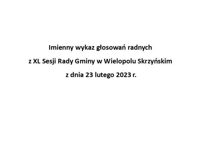 Piątek 24 lutego 2023 Imienny wykaz głosowań radnych Strona Główna/Informator/InformacjeImienny wykaz głosowań radnychImienny wykaz głosowań radnych