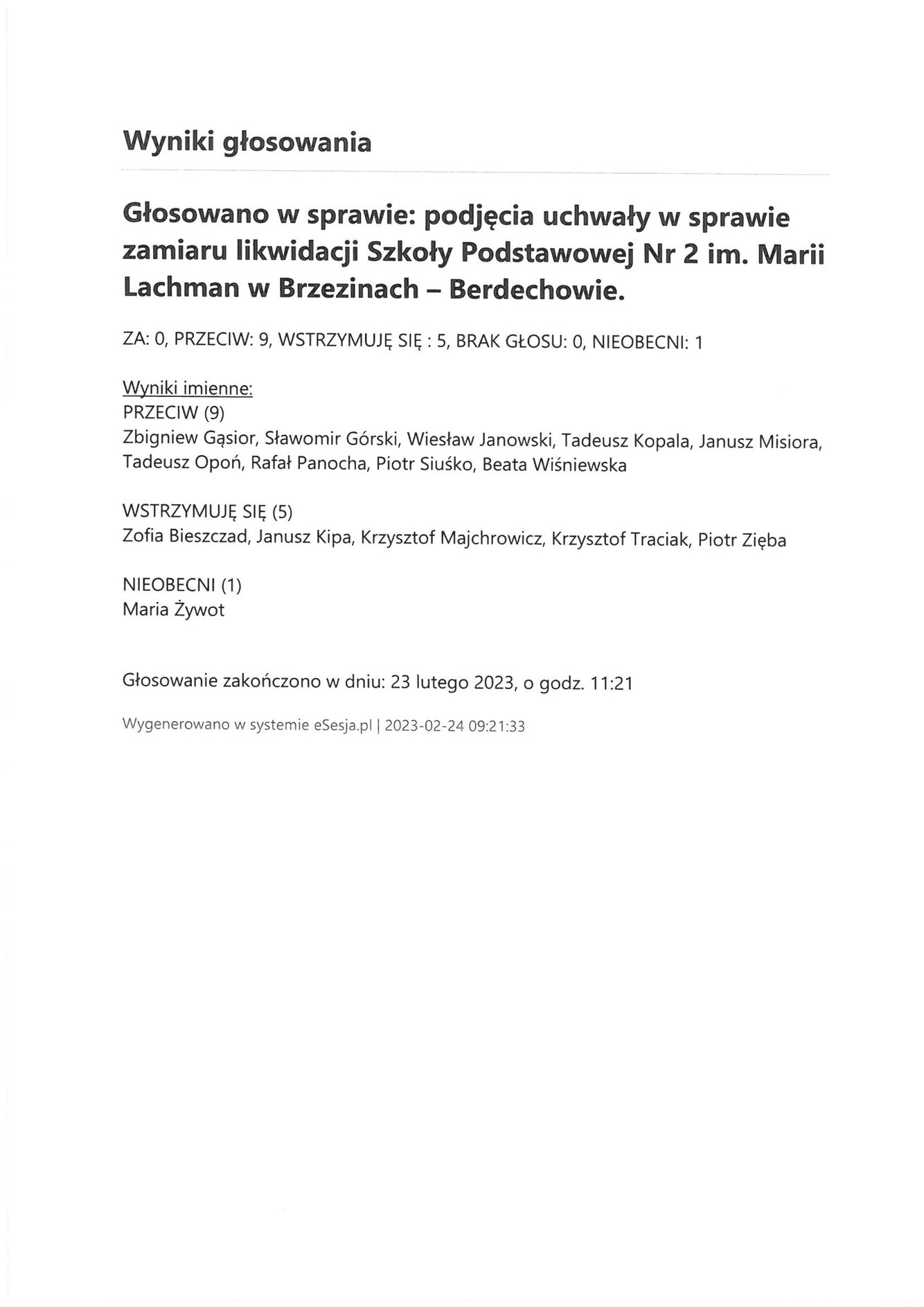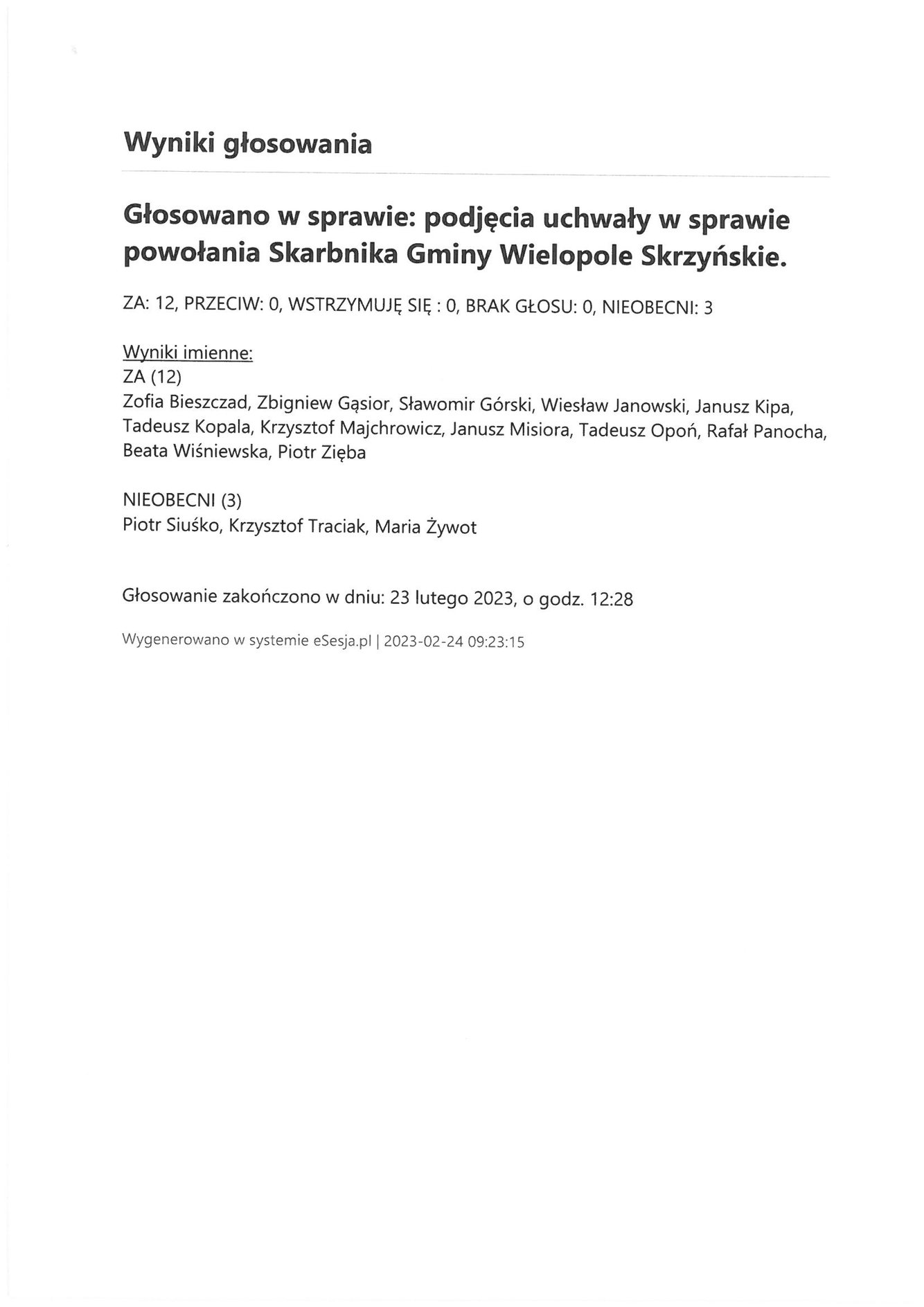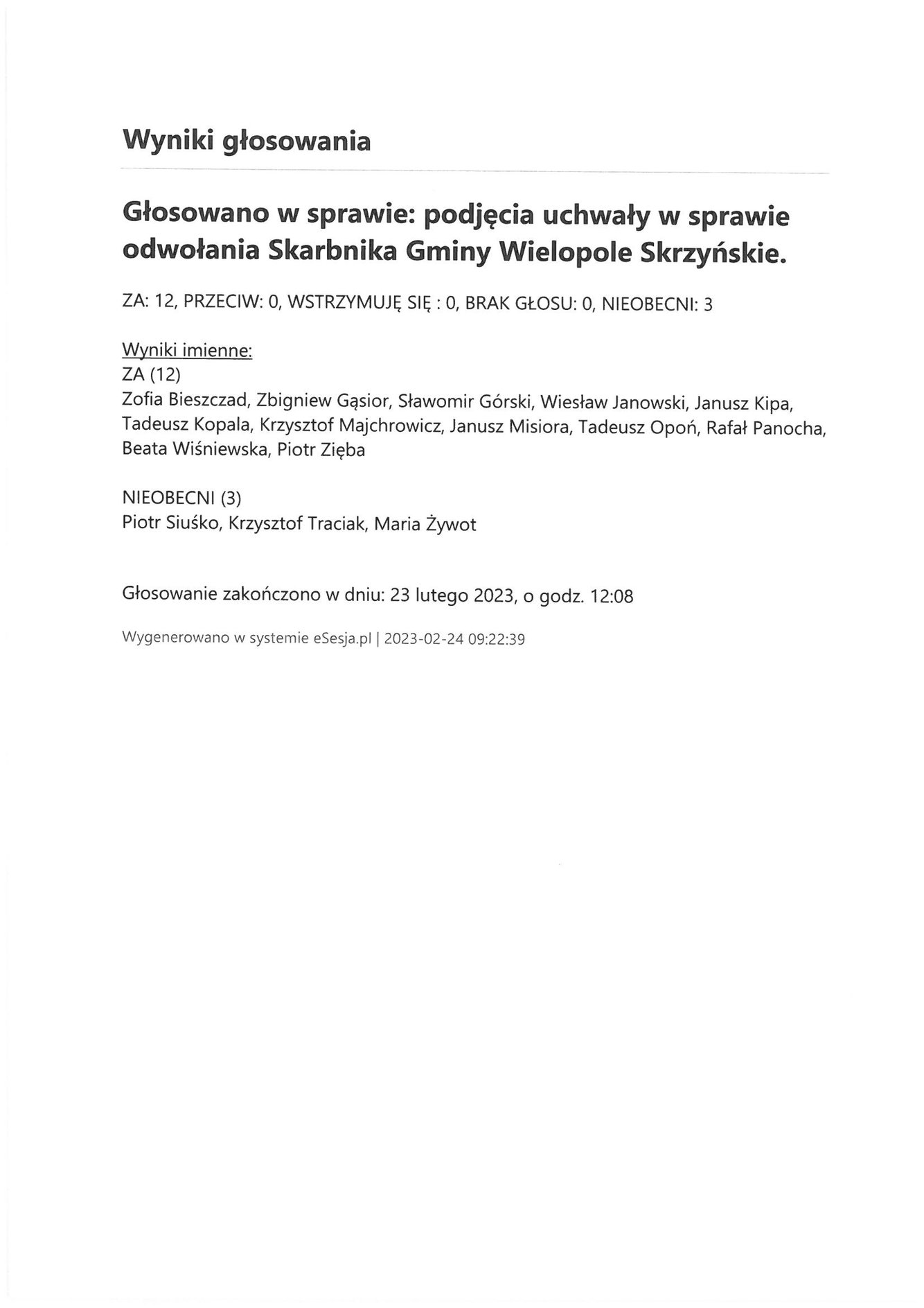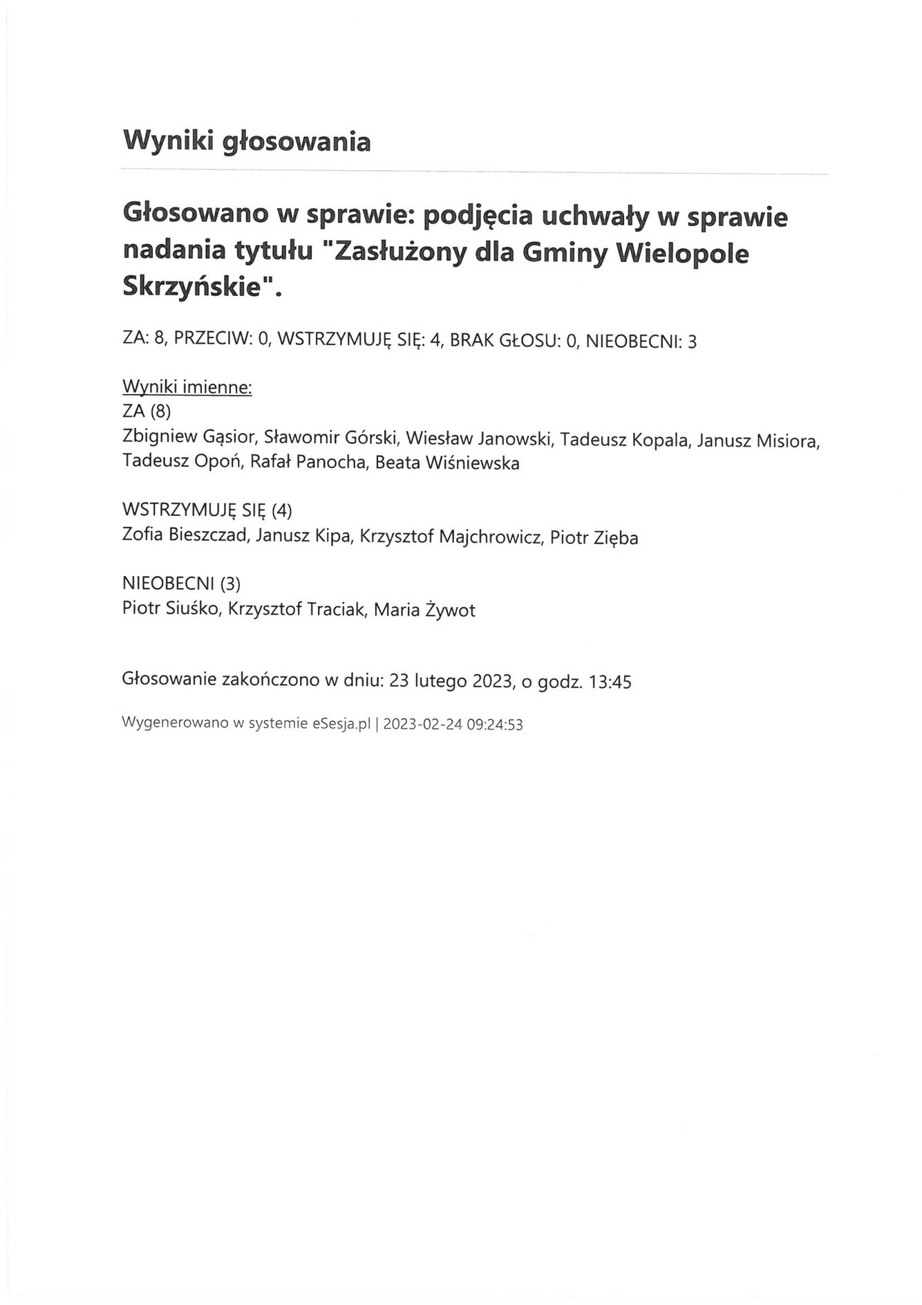 Piątek 24 lutego 2023 Imienny wykaz głosowań radnych Strona Główna/Informator/InformacjeImienny wykaz głosowań radnychImienny wykaz głosowań radnych