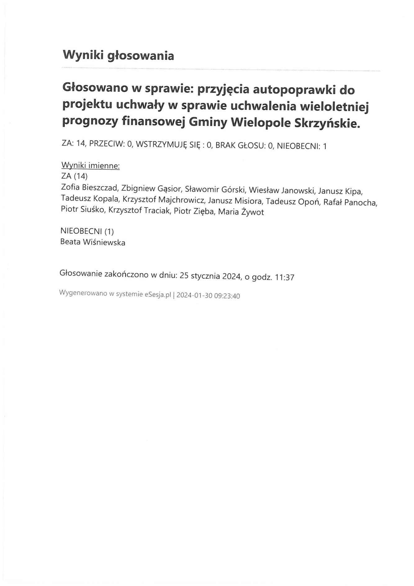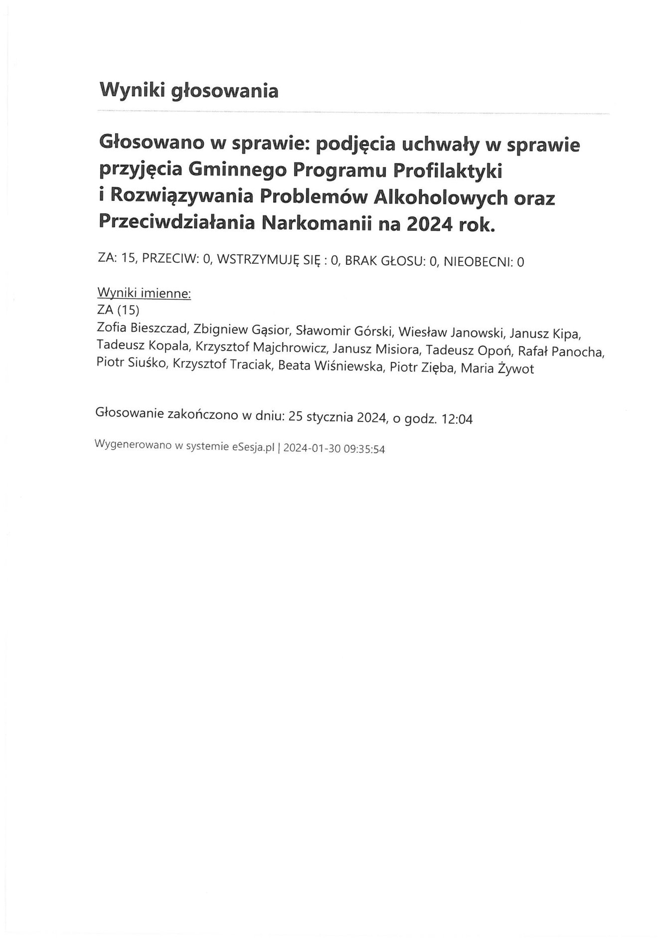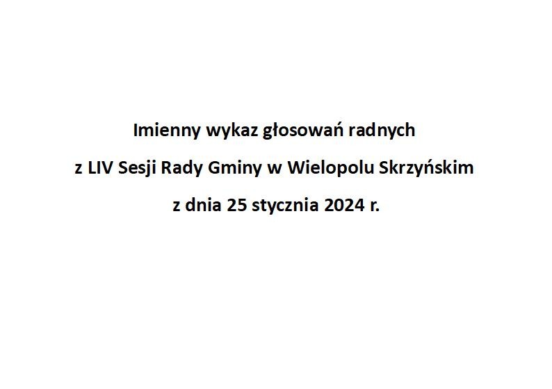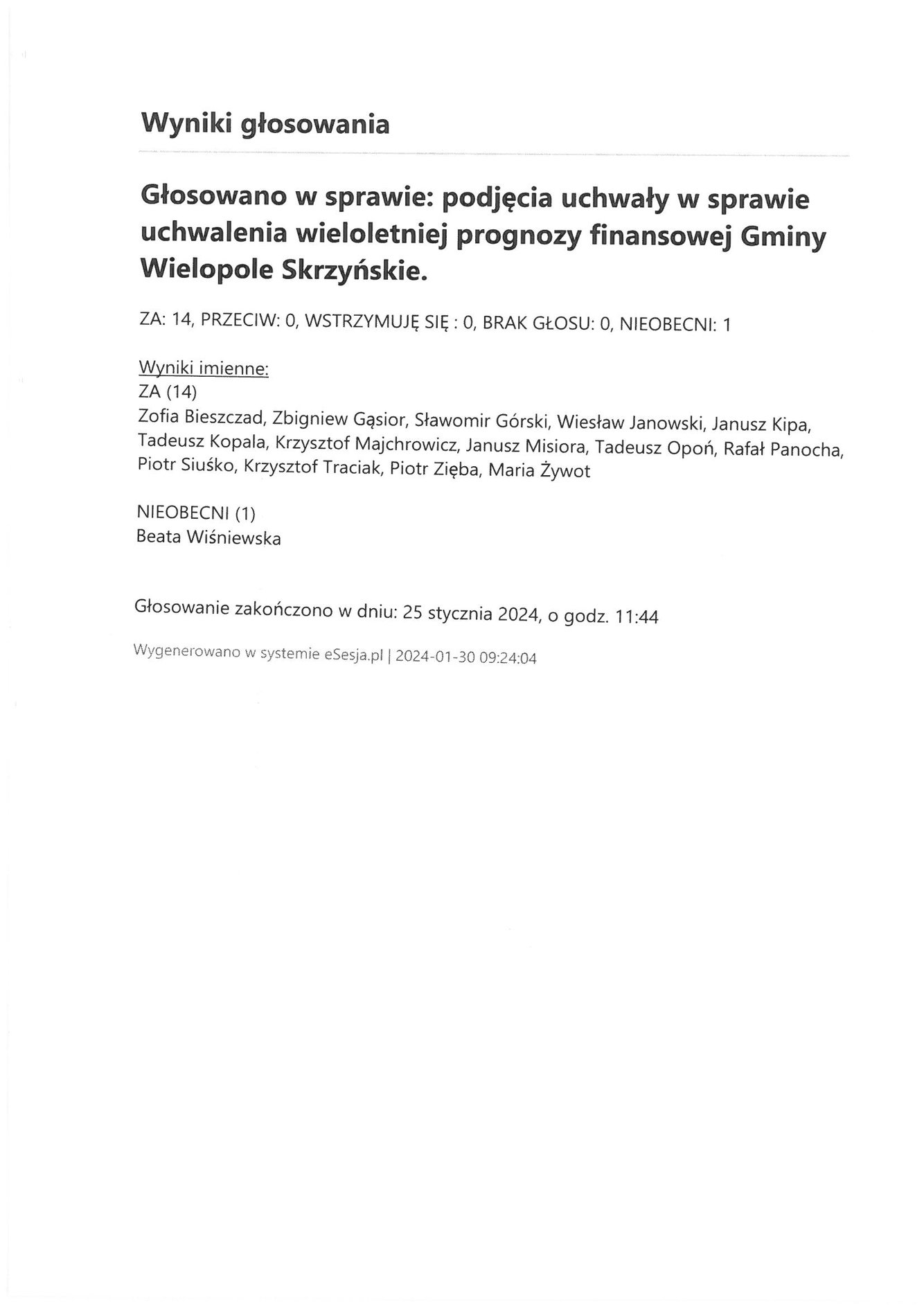 Wtorek 30 stycznia 2024 Imienny wykaz głosowań radnych Strona Główna/Informator/InformacjeImienny wykaz głosowań radnychImienny wykaz głosowań radnych