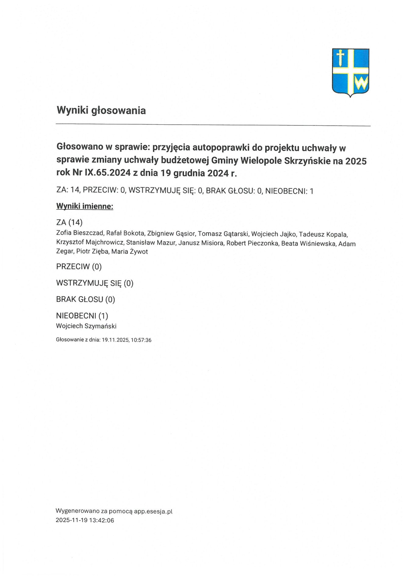 Czwartek 20 listopada 2025 Imienny wykaz głosowań radnych Strona Główna/Informator/InformacjeImienny wykaz głosowań radnychImienny wykaz głosowań radnych