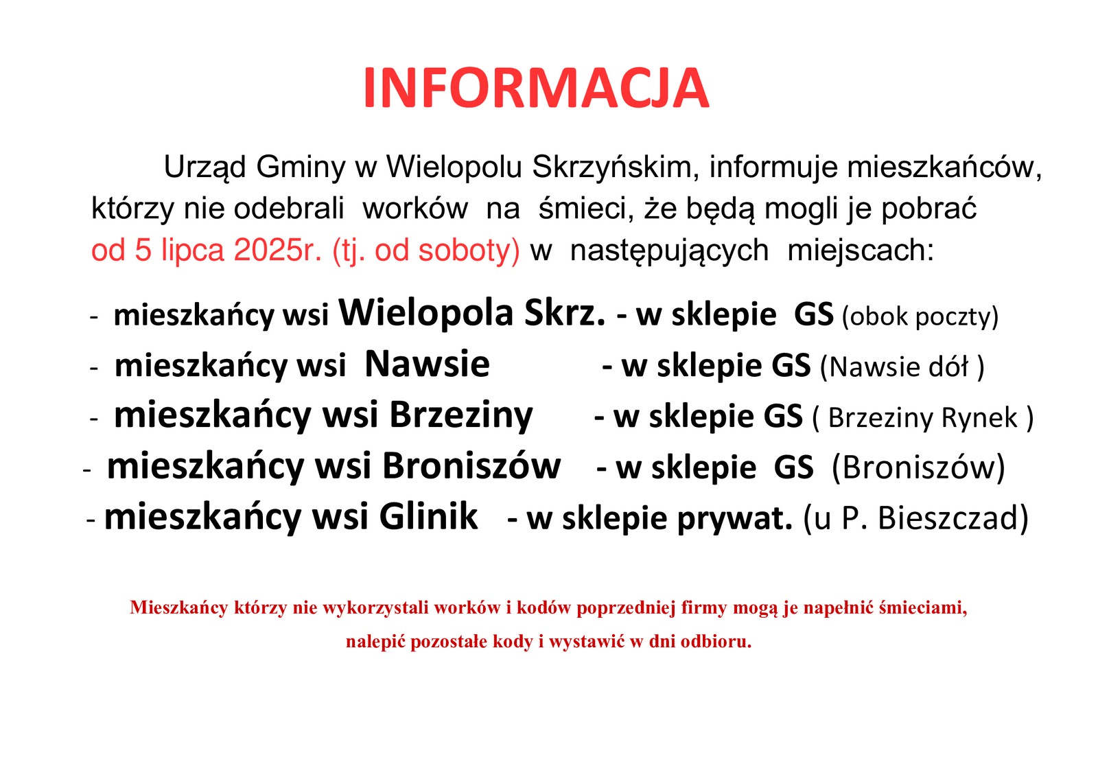 Wtorek 1 lipca 2025 Informacja dla mieszkańców którzy nie pobrali worków na śmieci Strona Główna/Biuletyn Informacji Publicznej/Gospodarka Komunalna