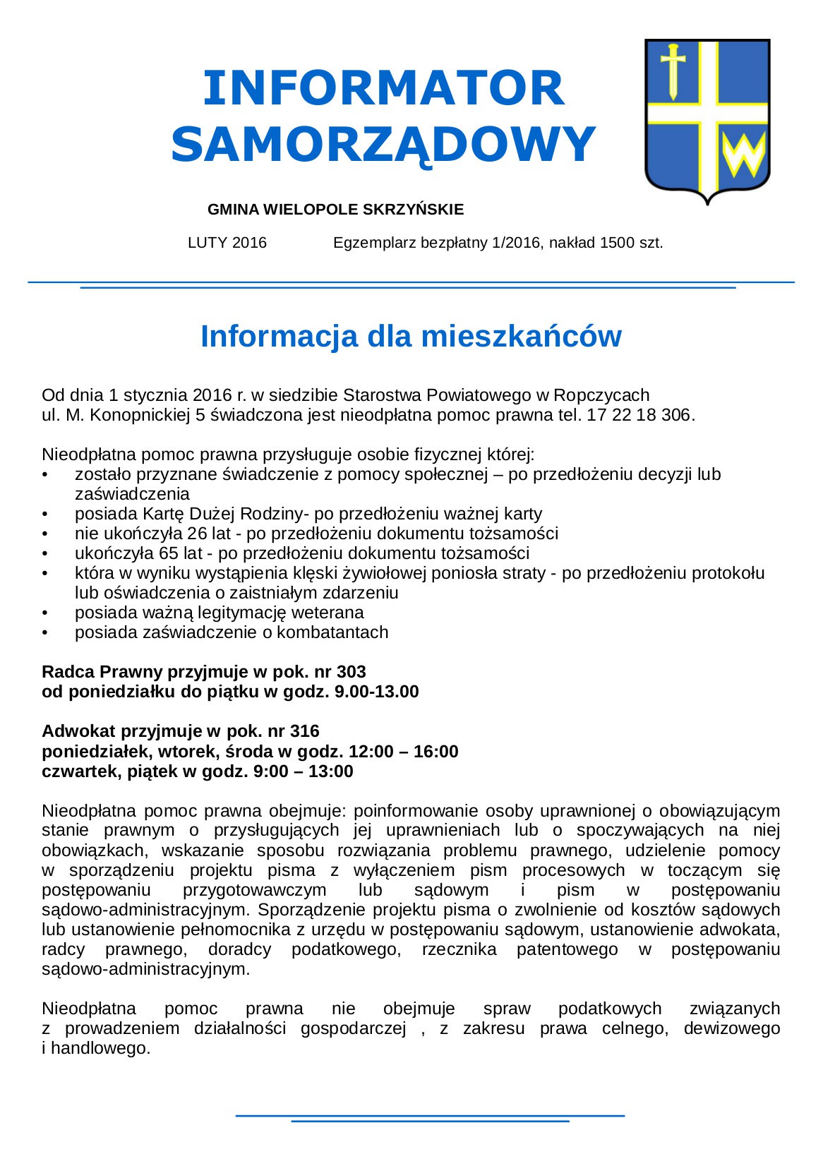 Poniedziałek 1 lutego 2016 Informator Samorządowy - luty 2016 Strona Główna/Nasza Gmina/PublikacjeDokumenty do pobraniaDokumenty do pobrania#Nazwa DokumentuINFORMATOR SAMORZĄDOWY - LUTY 2016 POBIERZ